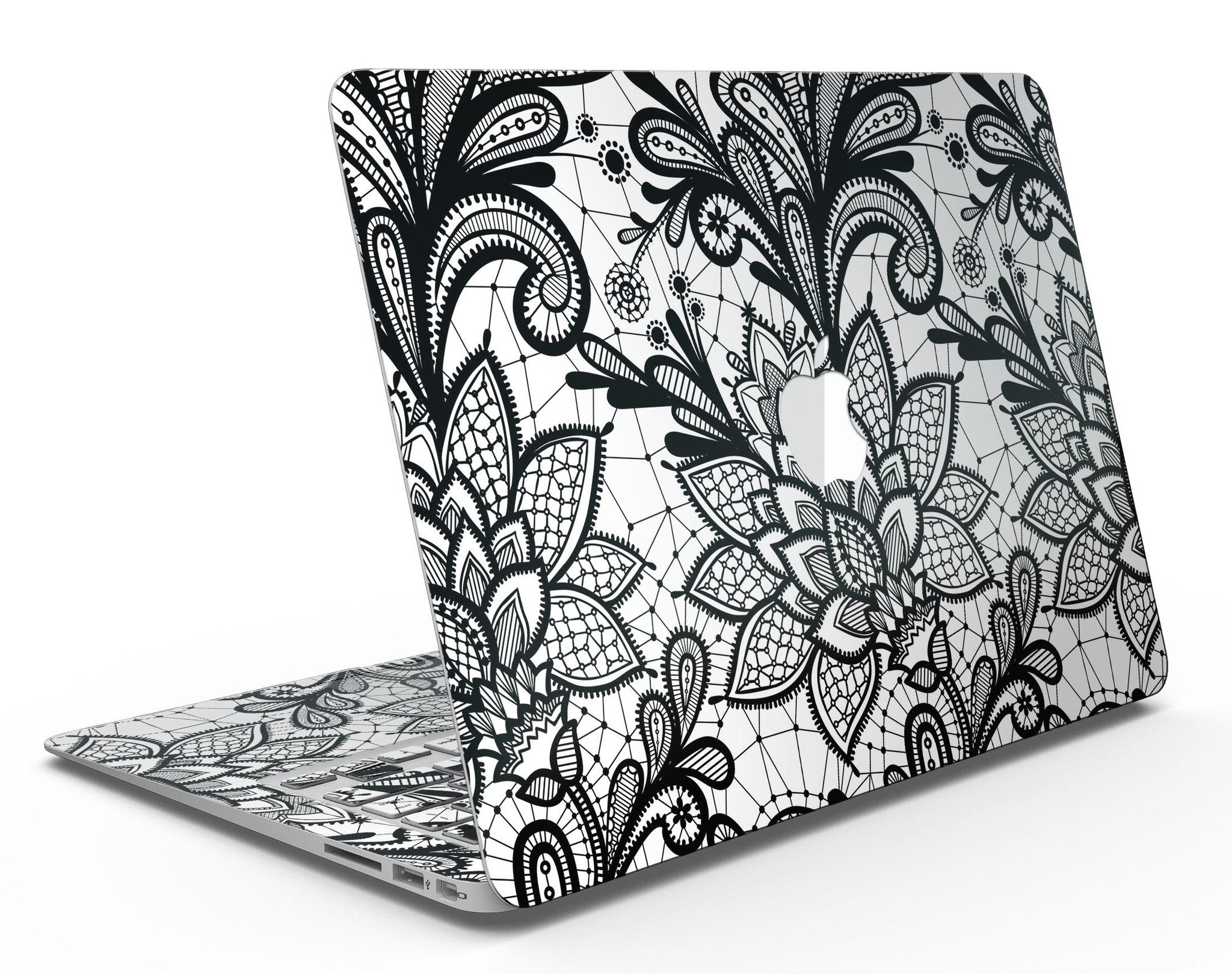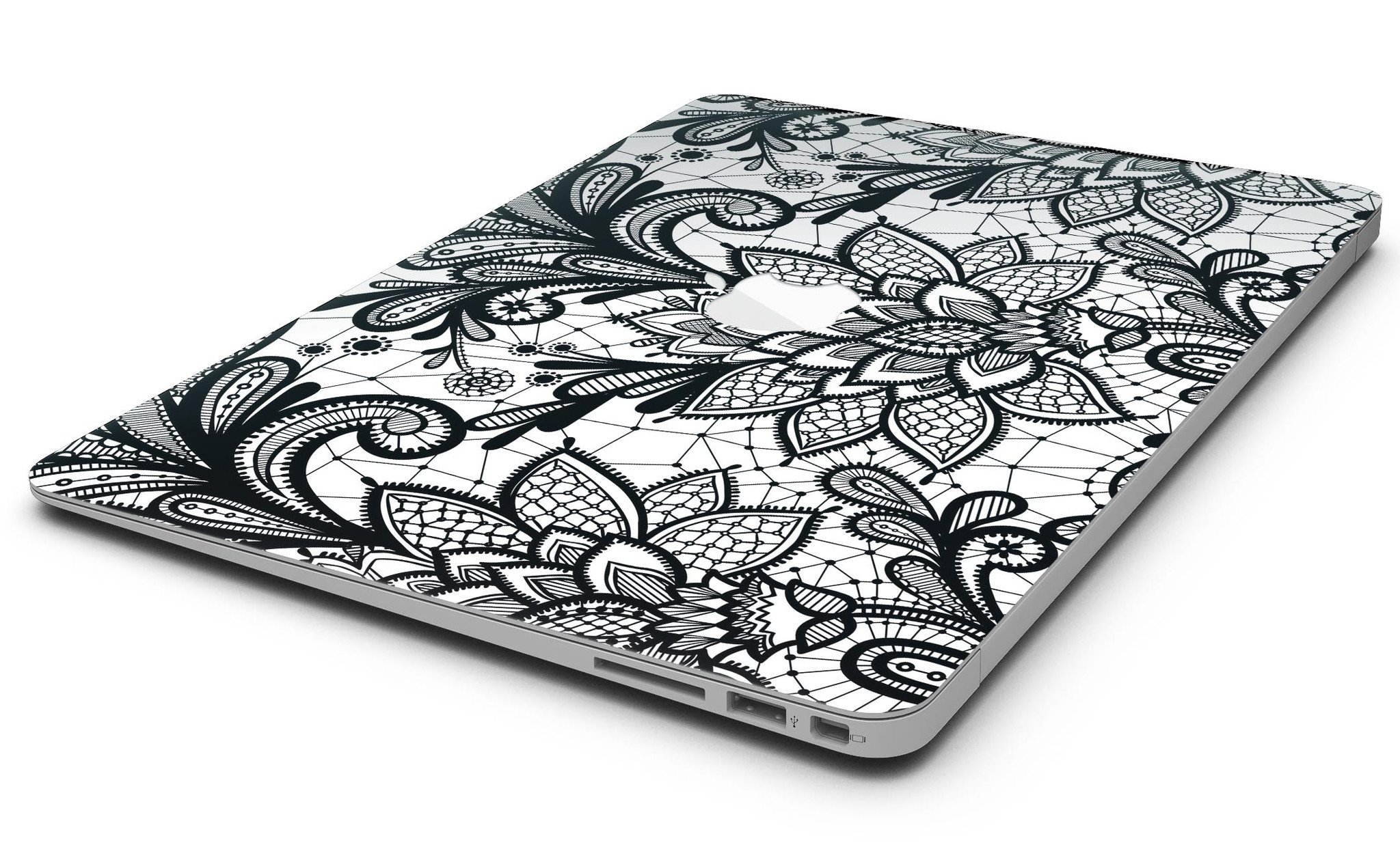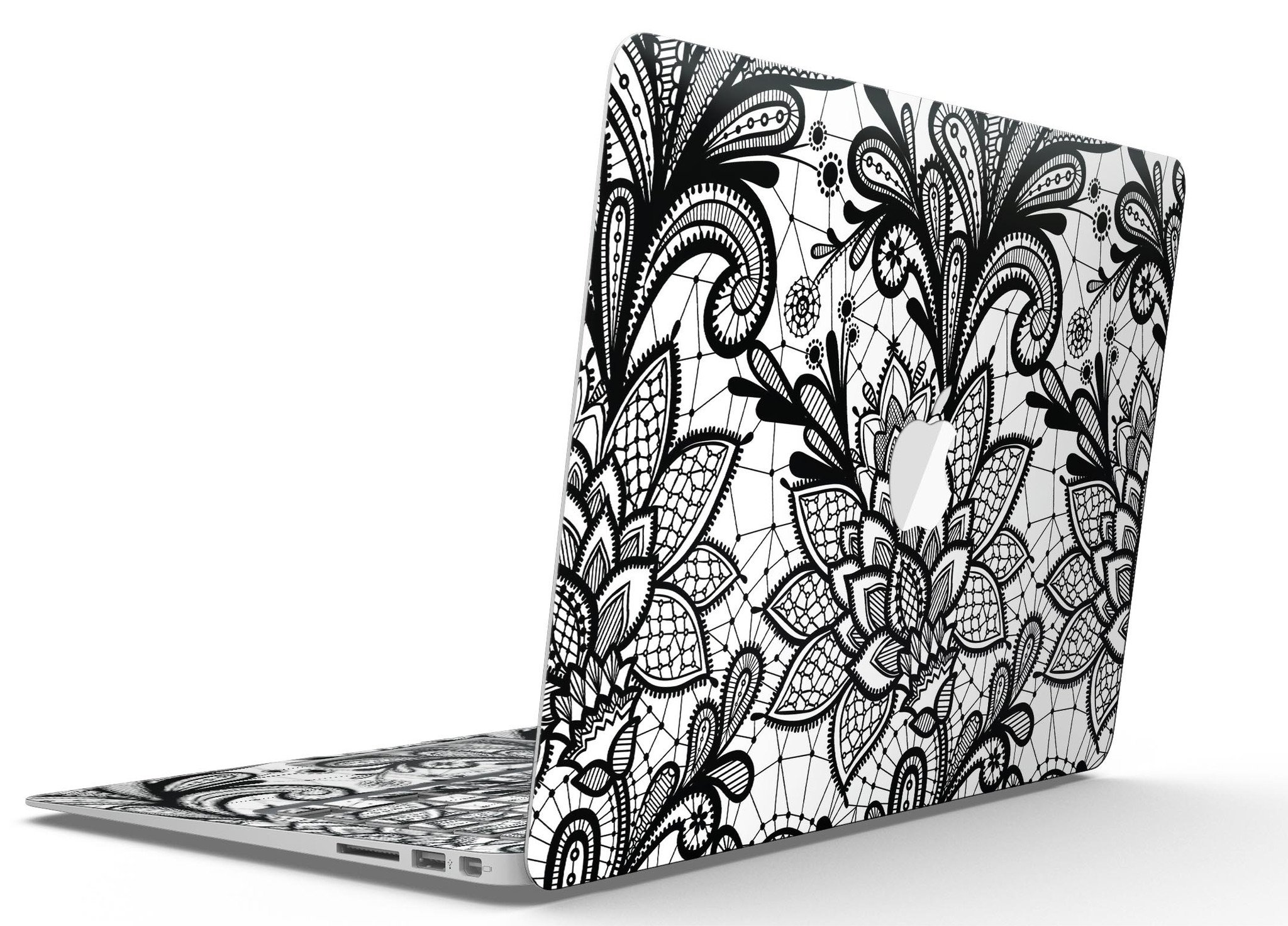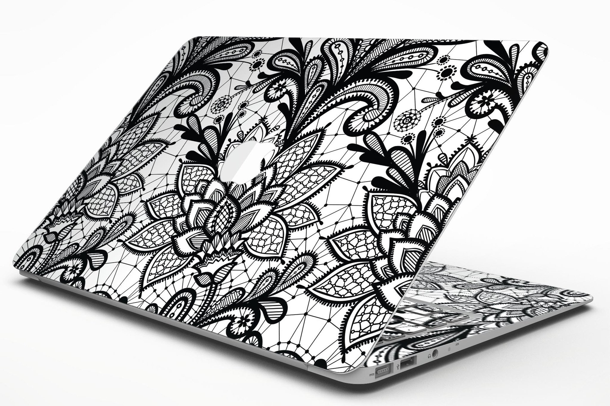 Black and white geometric floral skin for MacBook Air, showcasing a stylish design that protects the device.