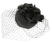 Classic black pillbox fascinator hat with face veiling and rich flower arrangement. A perfect choice for any racing event or special occasion.