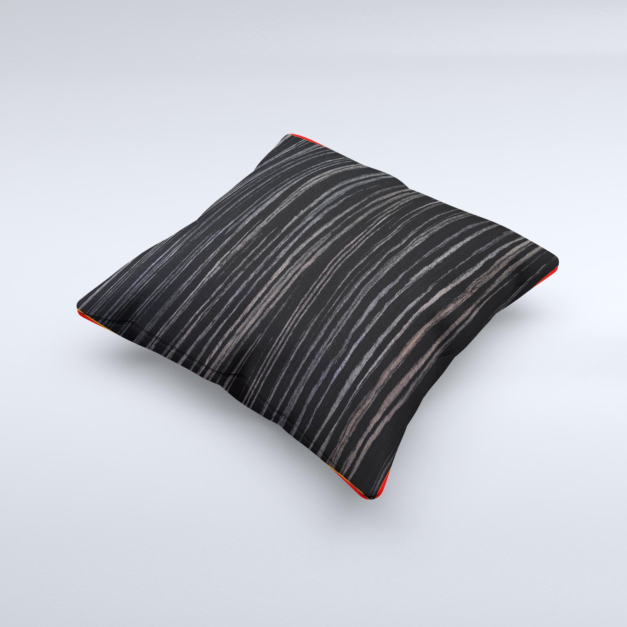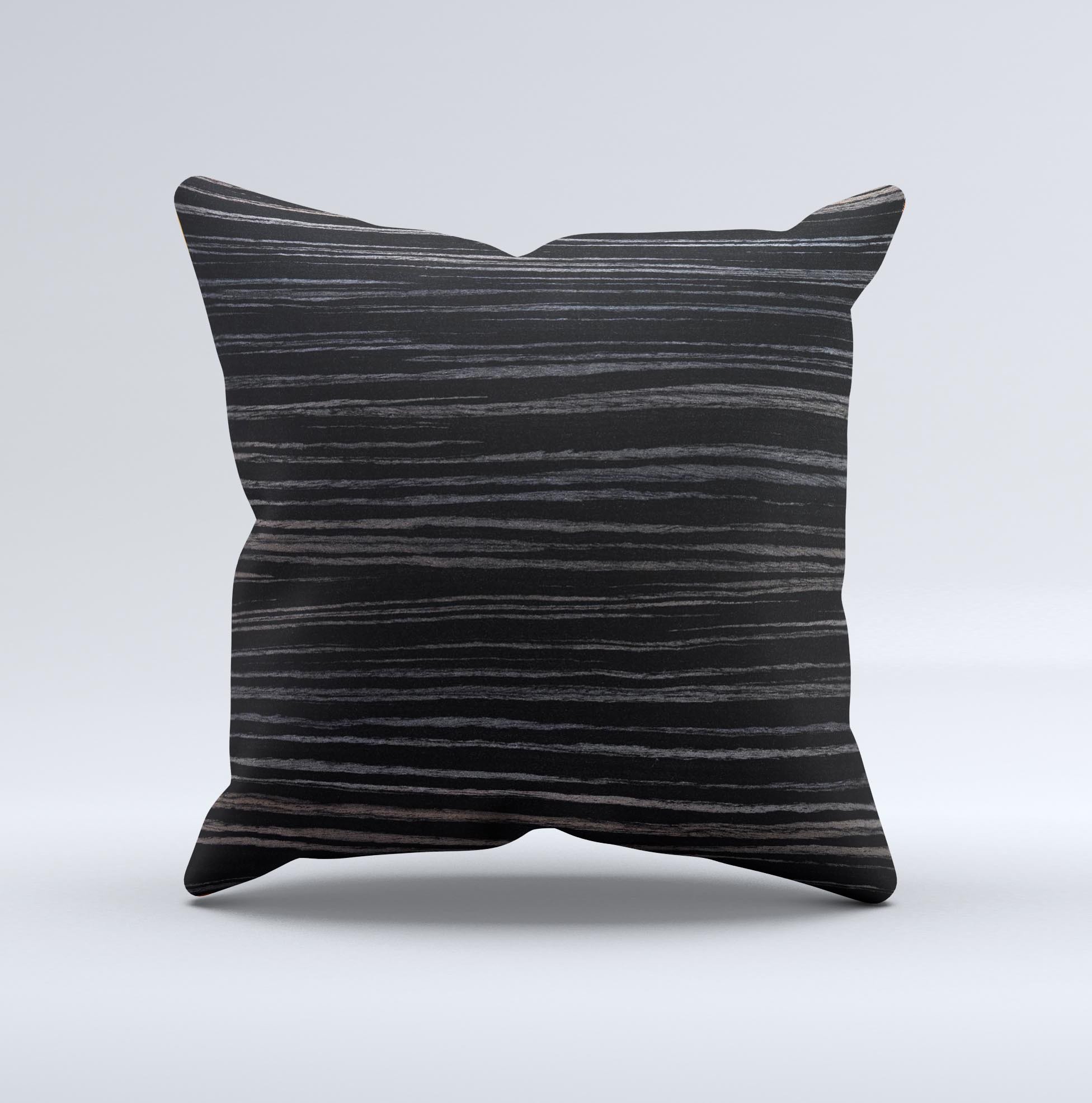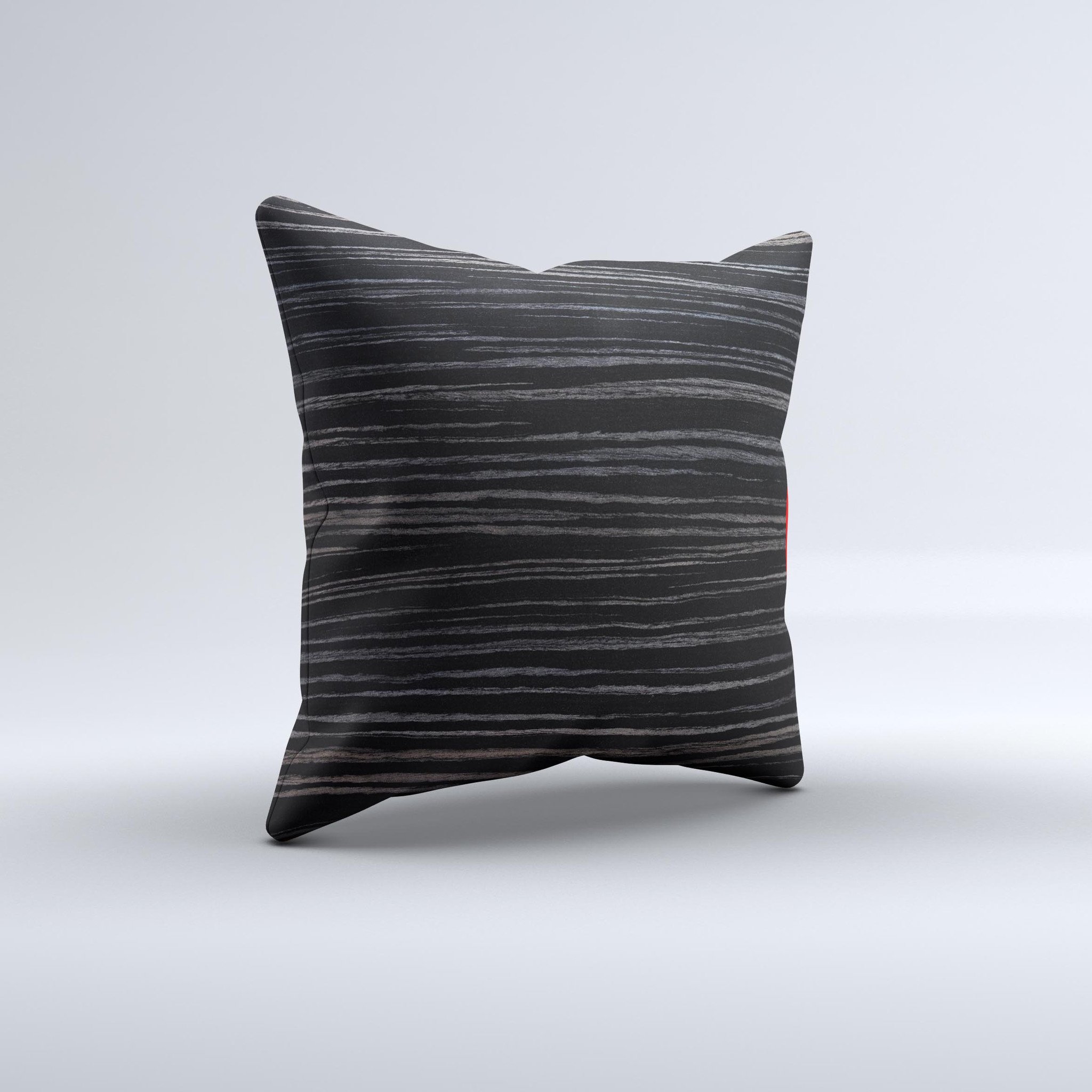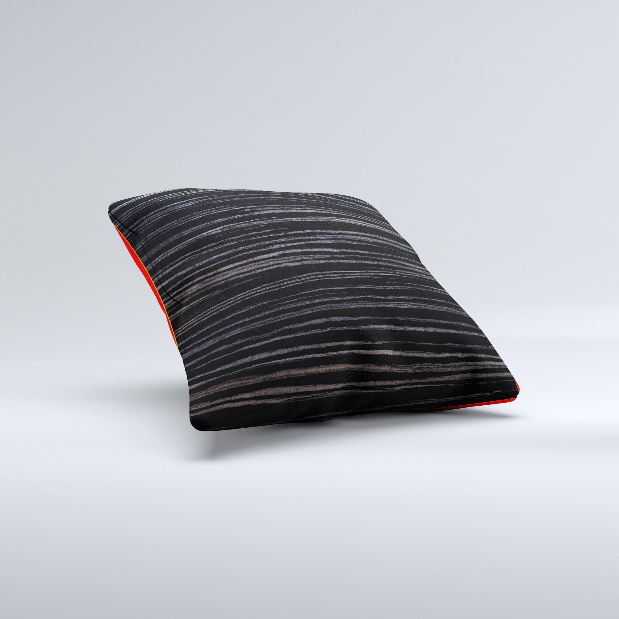 The black wood texture design is not only visually appealing but also adds a touch of sophistication to any room. Each graphic is hand-produced, which means that slight imperfections may occur during the printing process. These imperfections are embraced as they contribute to the pillow's unique appearance, showcasing the handmade nature of the product.