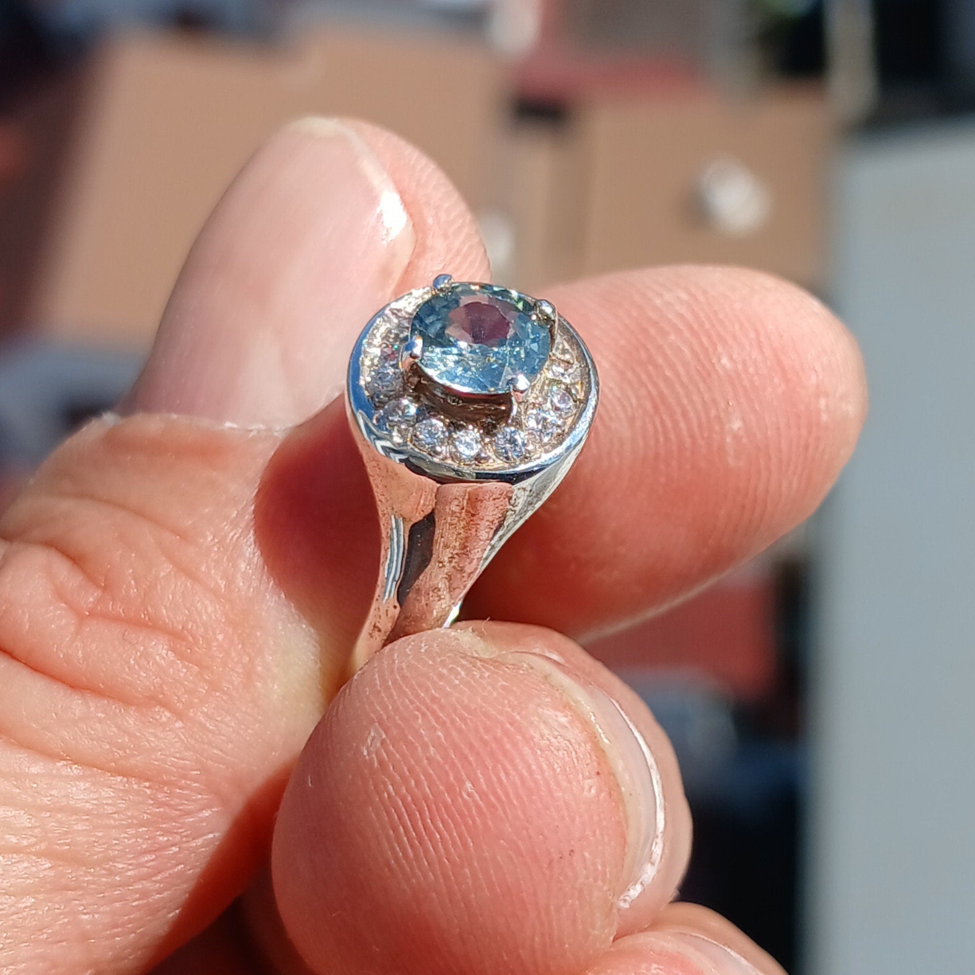 The Zircon itself measures 6 mm x 6 mm, adding a touch of sparkle and brilliance to the ring. Zircon is a natural gemstone that is often confused with cubic zirconia, but it is a unique and beautiful stone in its own right. The blue color of the Zircon is particularly striking, and it is known for its exceptional clarity and brilliance. Surrounding the blue Zircon are 14 white CZ stones, which further enhance its beauty and create a dazzling effect that catches the light beautifully.