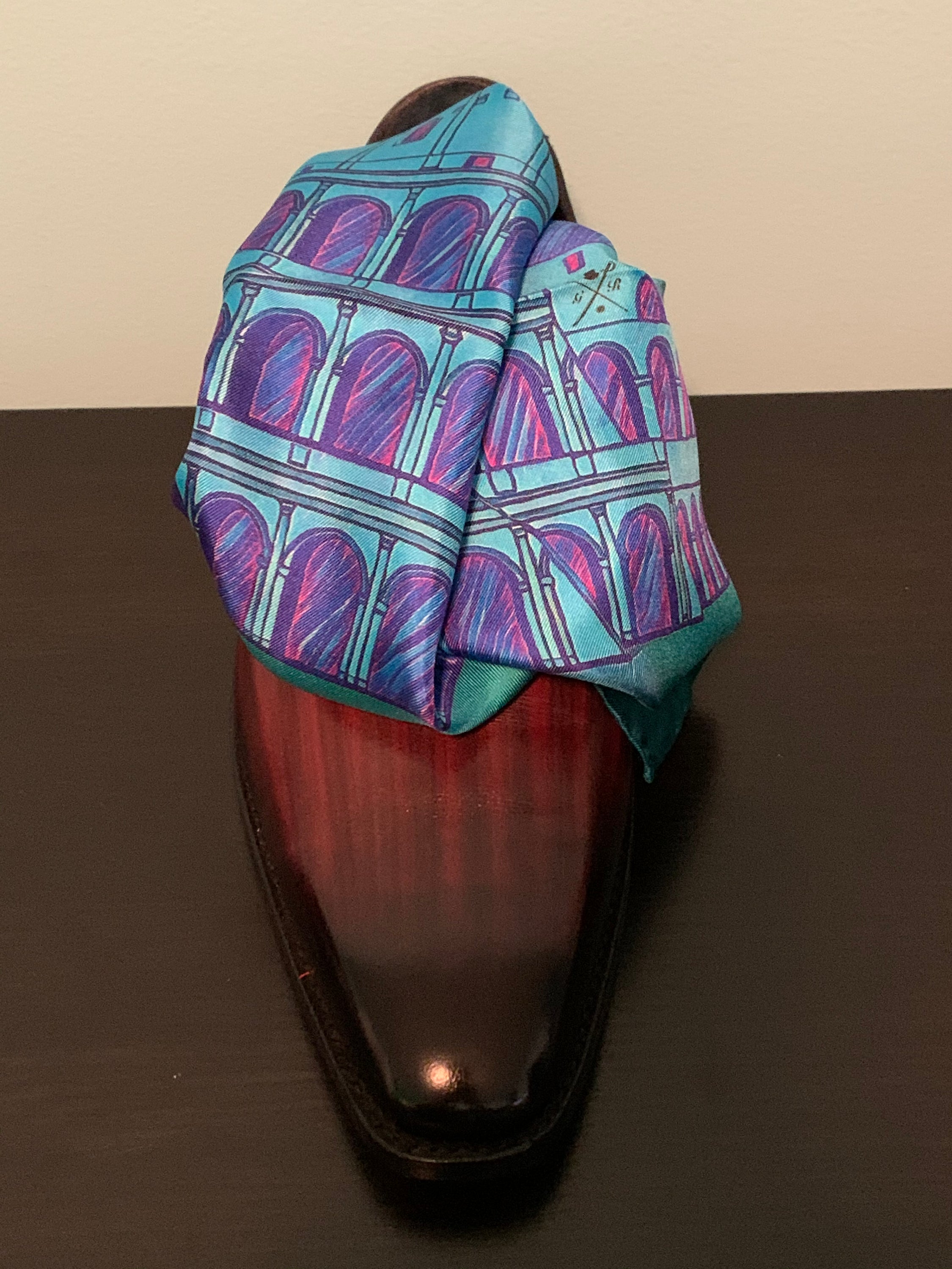 The Colosseum Blue Pocket Square is a unique accessory that combines elegance with a touch of artistry. Inspired by the iconic Colosseum in Rome, this pocket square features an original sketched design that captures the essence of Italian architecture and culture. The beautiful shades of blue, magenta, and green create a vibrant palette that is sure to enhance any outfit.