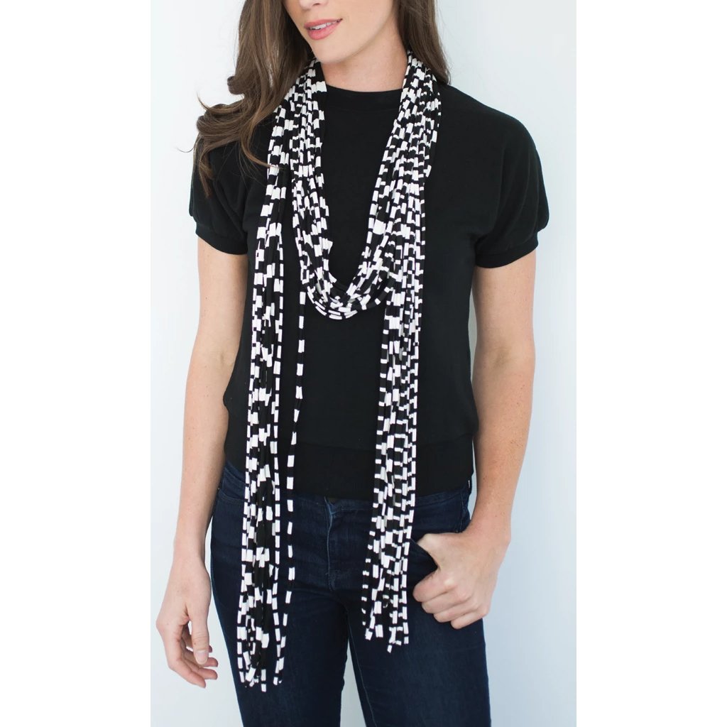 Cozy B&W Fiona wrap showcasing its stylish design and lightweight fabric, perfect for layering.