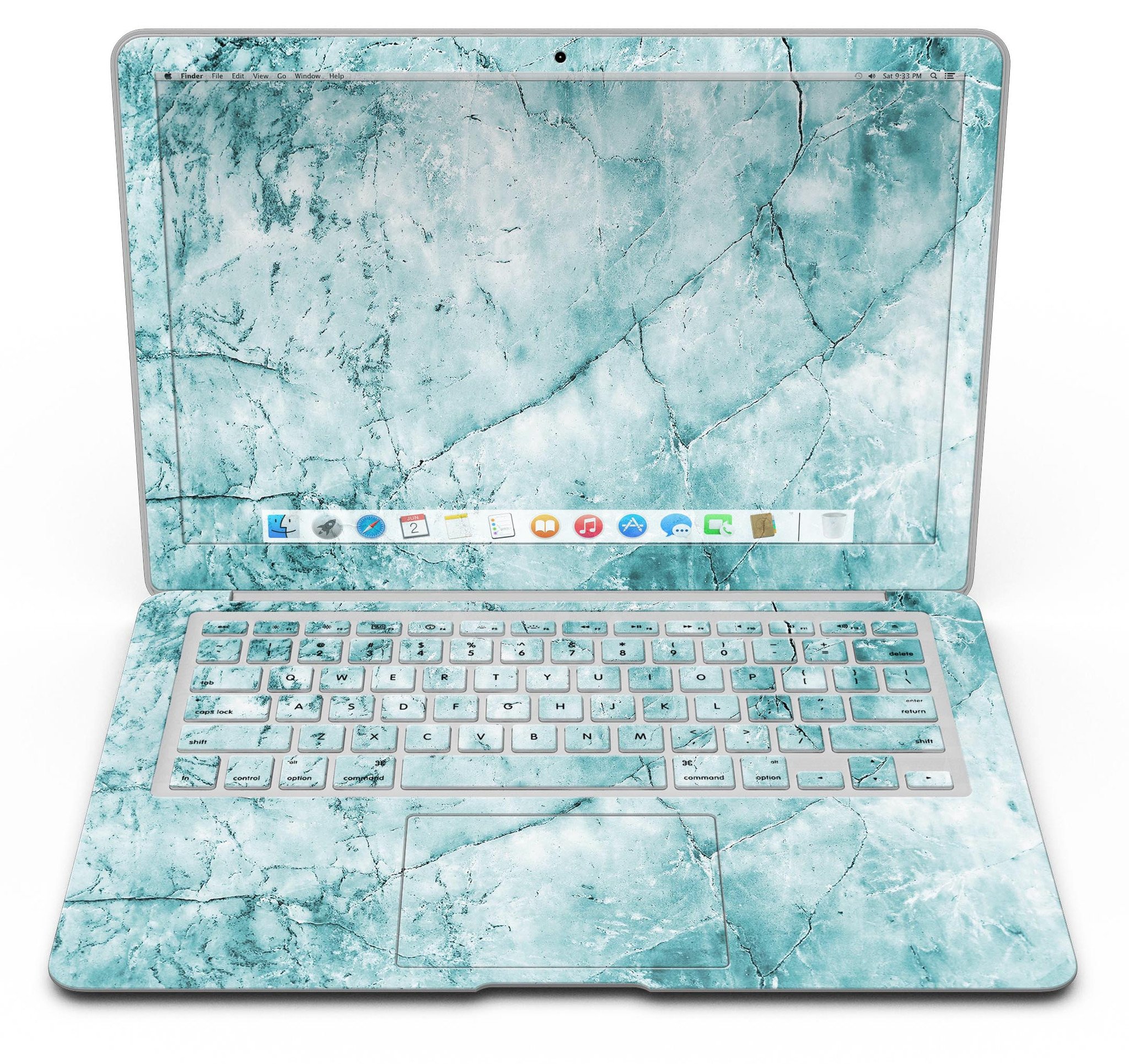 The Cracked Turquoise Marble Skin Kit is specifically designed for MacBook Air models, ensuring a perfect fit for your device. To maintain the skin’s appearance, simply wipe it down with a soft, damp cloth to remove any dirt or fingerprints. Avoid using harsh chemicals or abrasive materials that could damage the vinyl.