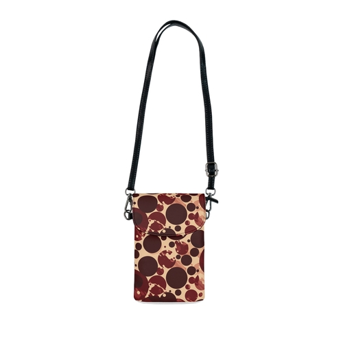 The Crossbody Bag, Small Cell Phone Purse in Burgundy and Beige Circular is the perfect blend of style and functionality. Designed for those who are always on the go, this compact crossbody bag allows you to carry your essentials without compromising on fashion. With its unique circular spotted illustration, it adds a splash of color to any outfit, making it an ideal accessory for casual outings or special occasions.