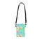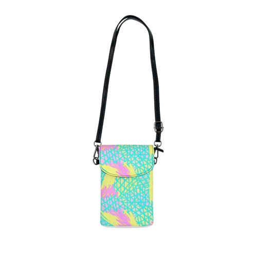 Introducing our vibrant Crossbody Bag, Small Cell Phone Purse in a stunning cyan blue, lime green, and pink pattern. This stylish accessory is designed for those who want to keep their essentials close while making a fashion statement. With its compact size of 7.5" x 4.9", this purse is perfect for carrying your cell phone, cards, and other small items without the bulk of a traditional handbag.