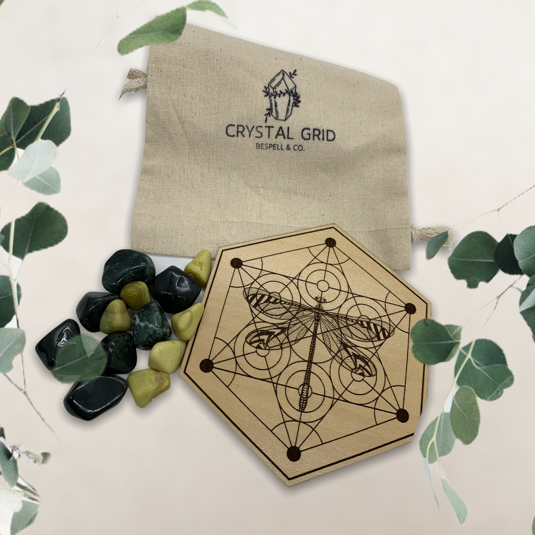 The crystal grid features a beautifully crafted Dragonfly Metatron's cube, symbolizing harmony and balance. Accompanying this sacred geometry are 13 carefully selected crystals: