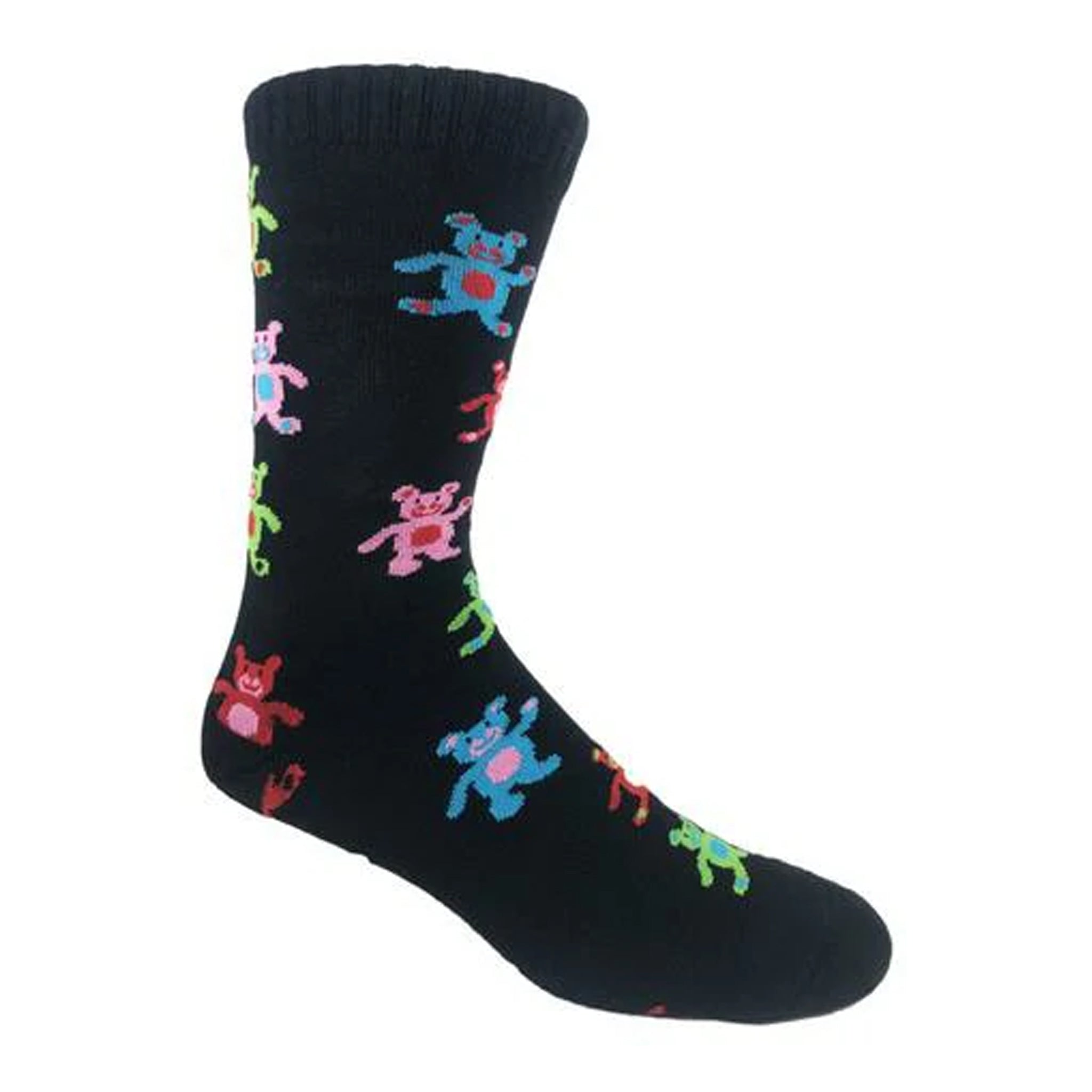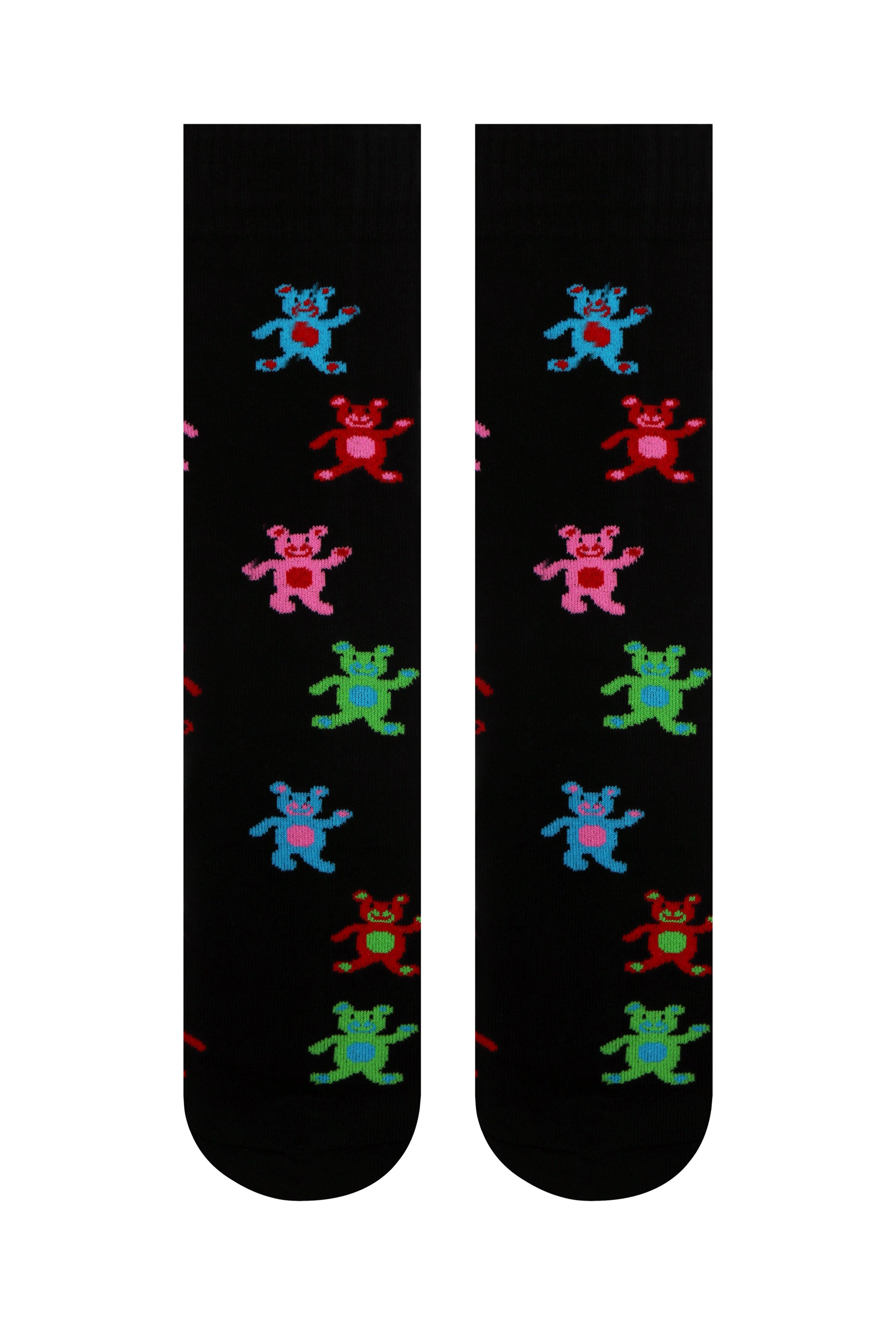 A pair of crew socks featuring colorful dancing teddy bears in blue, green, pink, and red, perfect for adding a playful touch to your outfit.