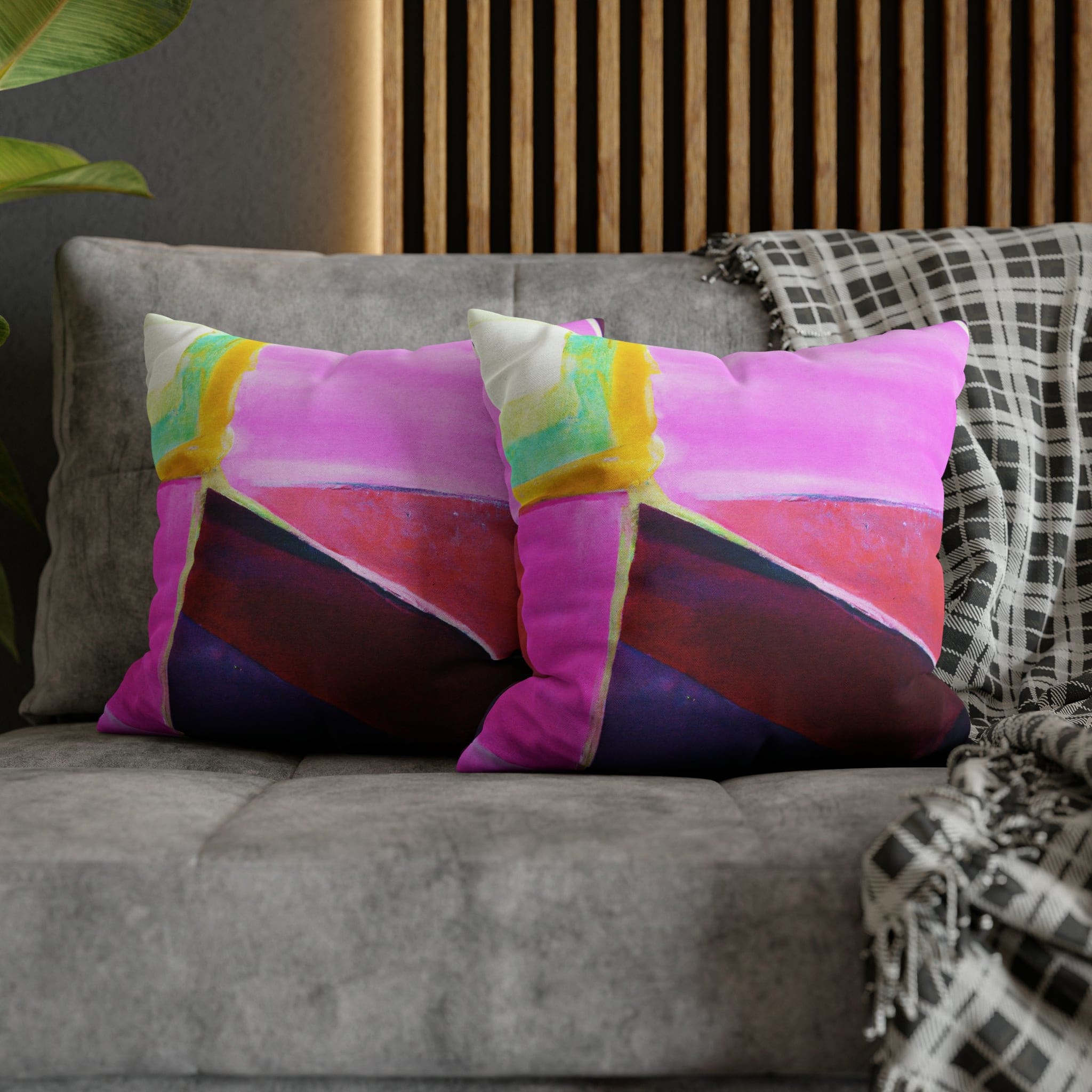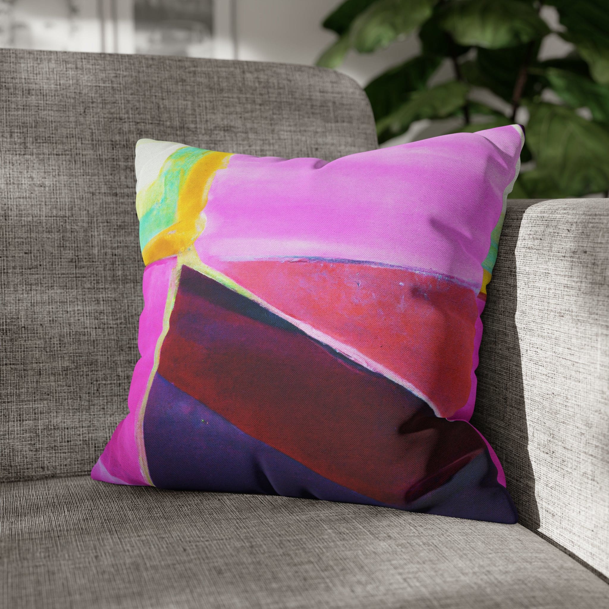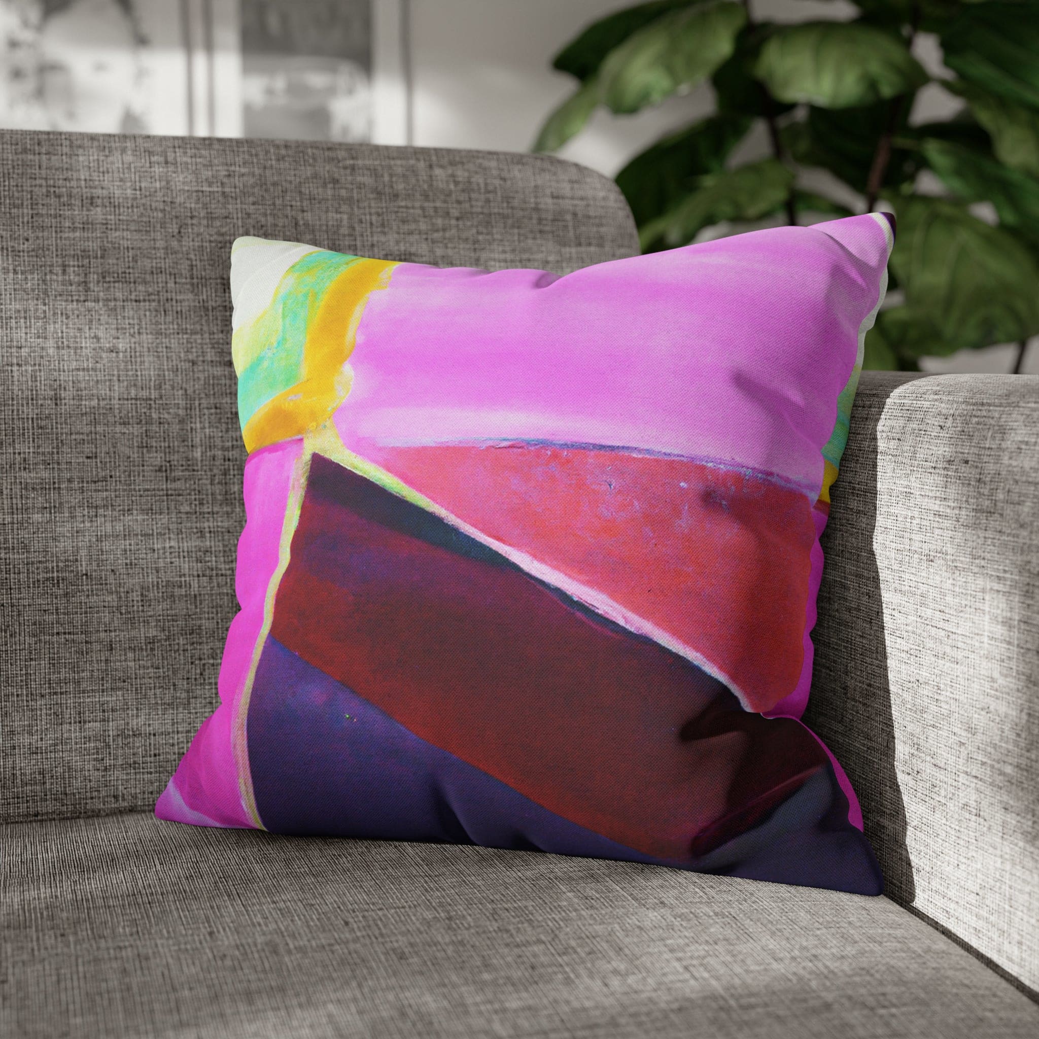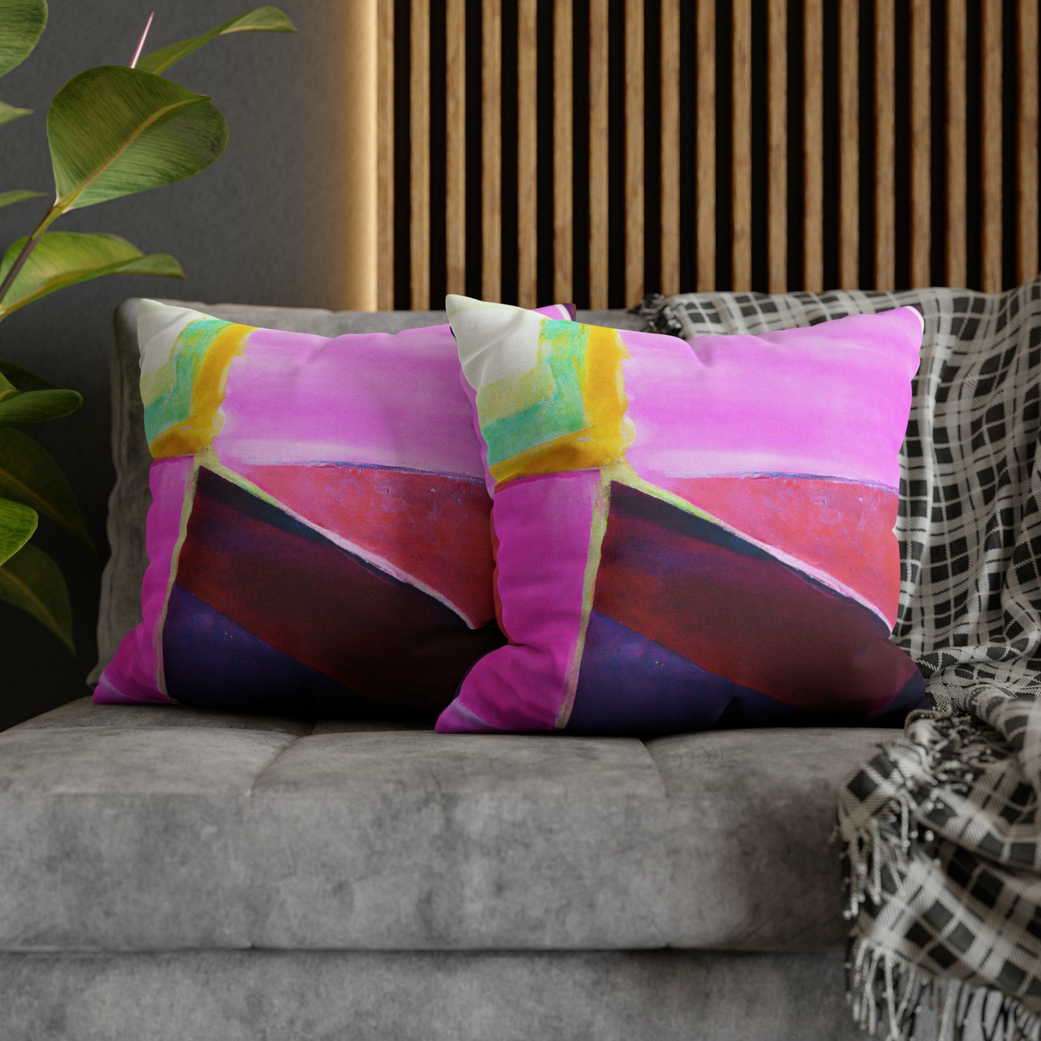 Transform your living space with our Decorative Throw Pillow Cover featuring a stunning pink, purple, and red geometric pattern. This eye-catching design is perfect for adding a pop of color and style to your sofa, office couch, or bedroom bedding. Crafted with meticulous attention to detail, this throw pillow cover not only enhances your decor but also provides a luxurious feel that complements any interior design.