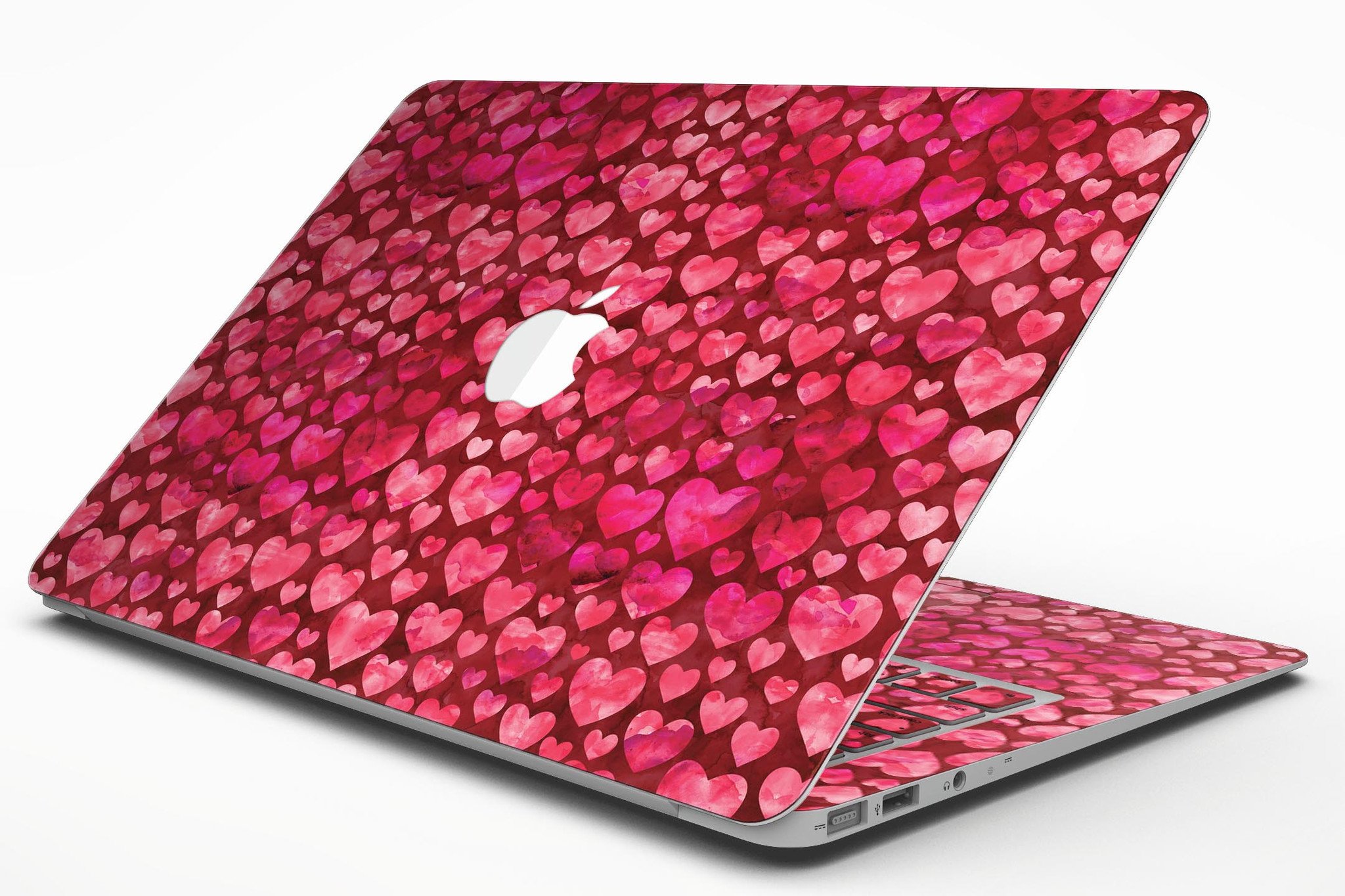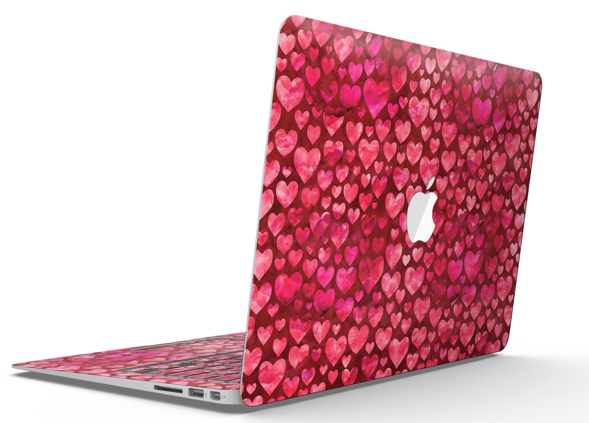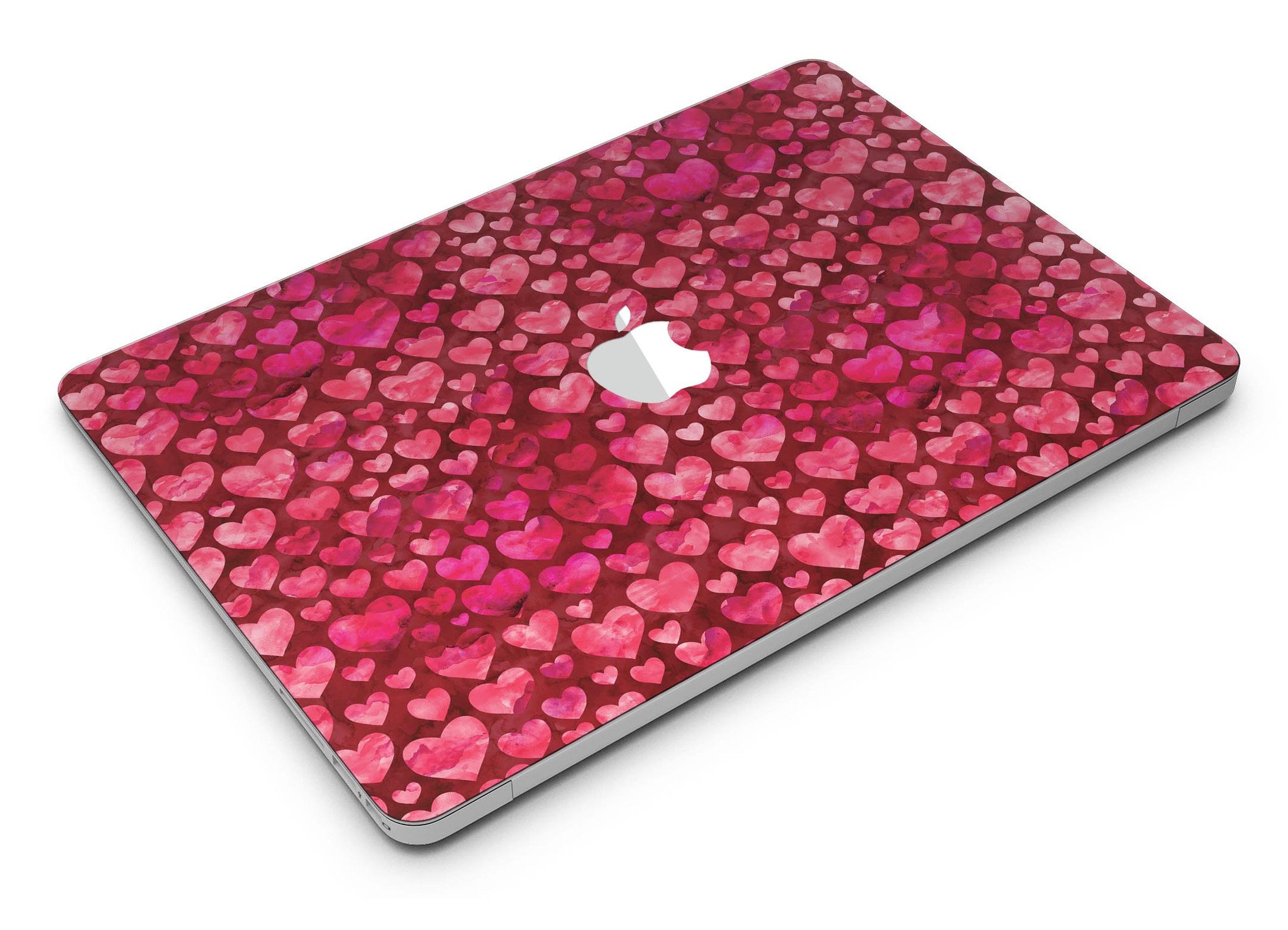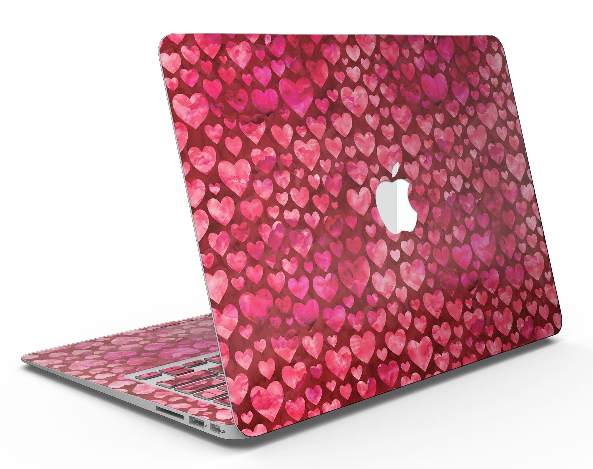 Deep Pink Watercolor Hearts MacBook Air Skin Kit showcasing vibrant heart patterns on a sleek laptop surface.