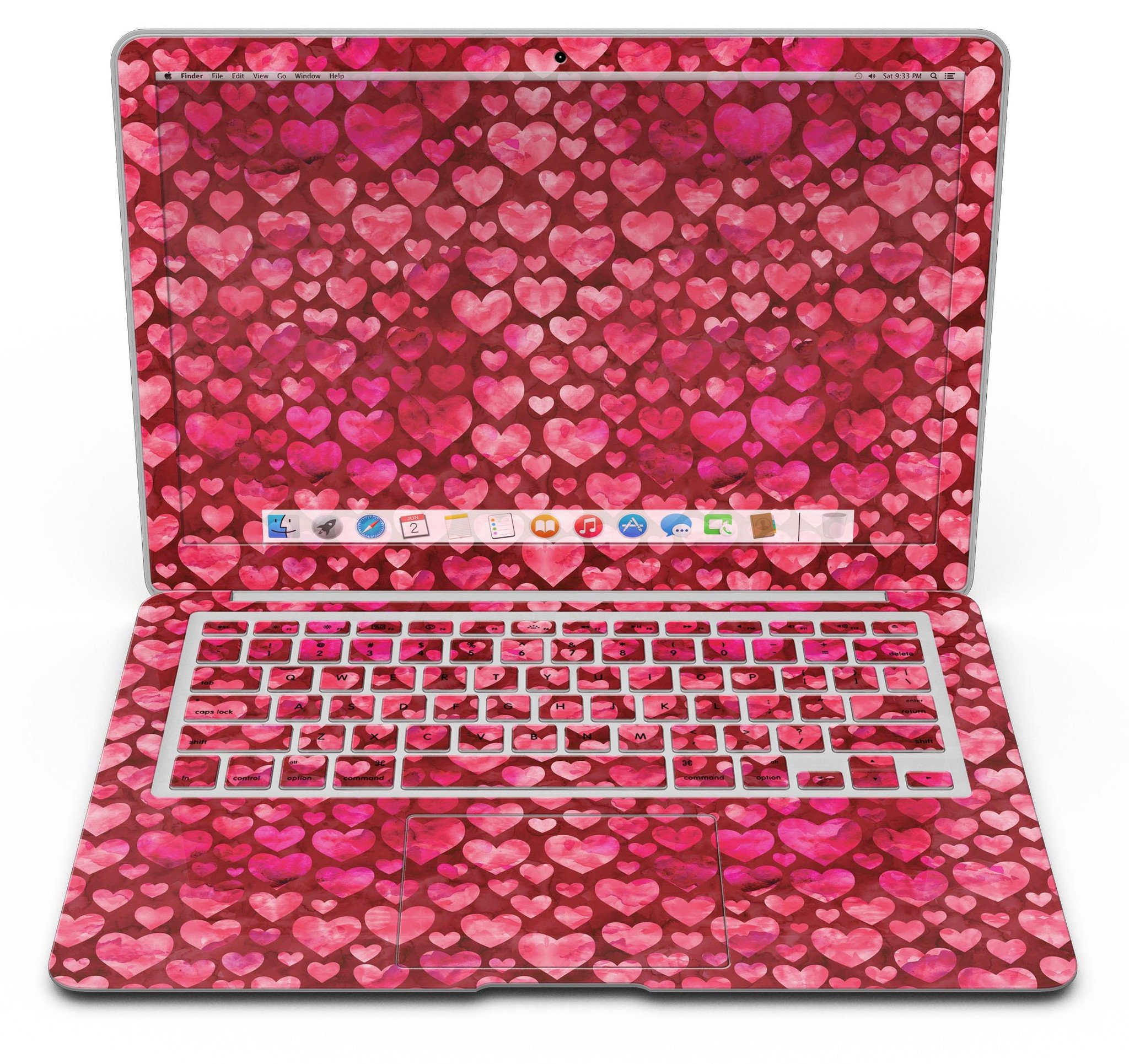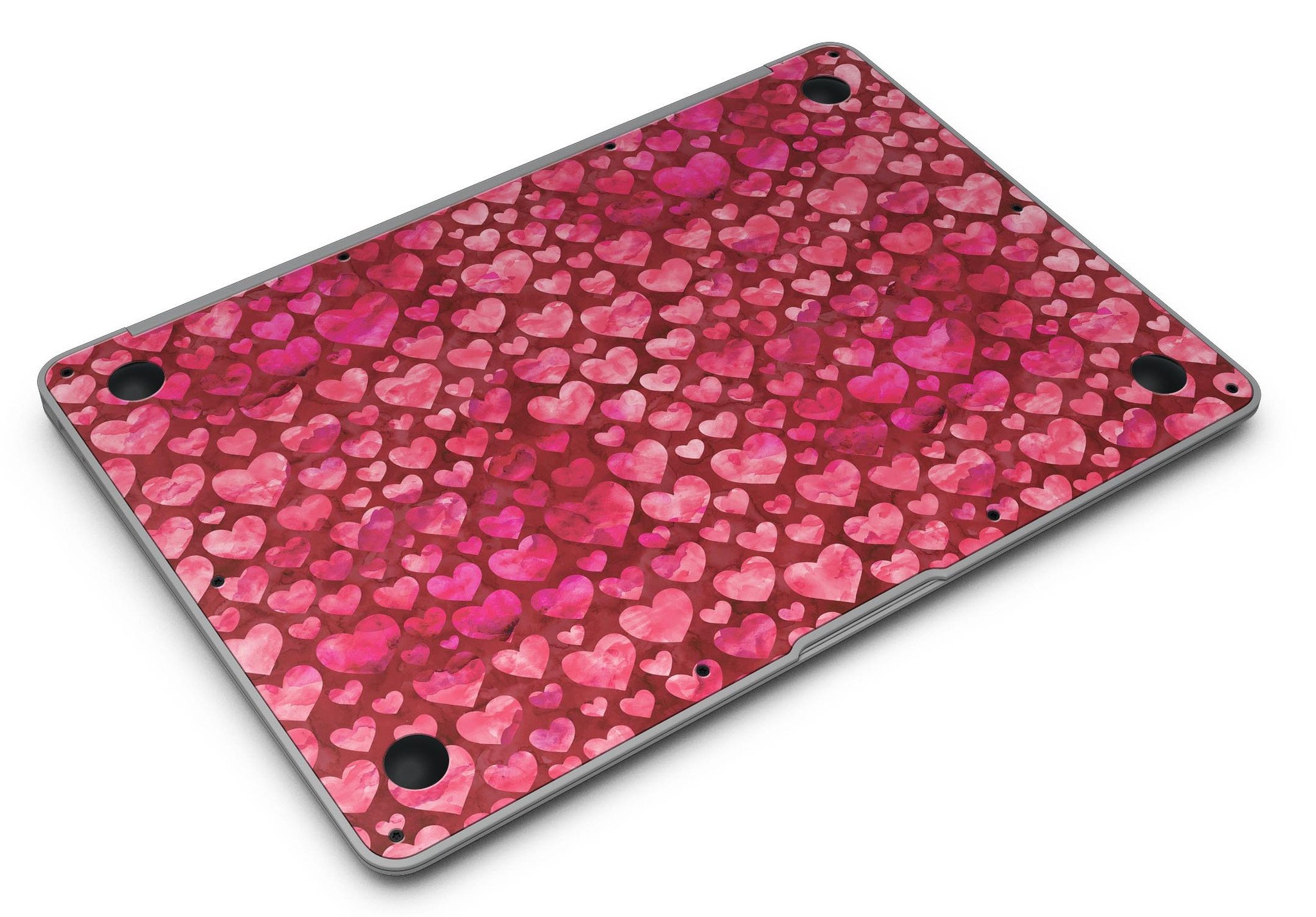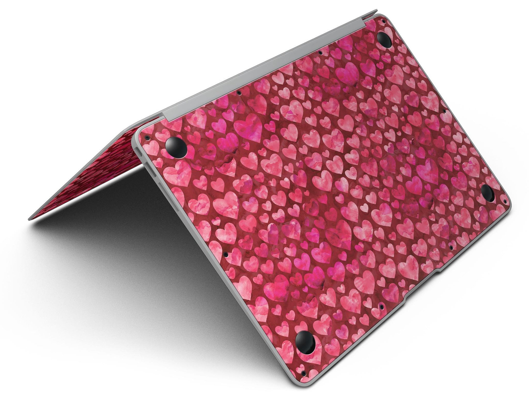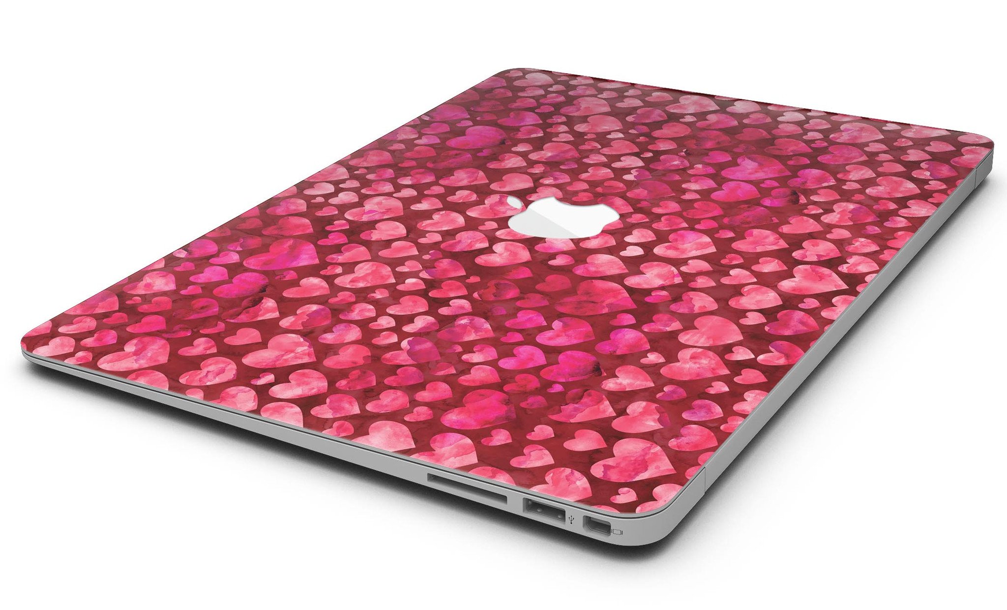 Deep Pink Watercolor Hearts MacBook Air Skin Kit showcasing vibrant heart patterns on a sleek laptop surface.