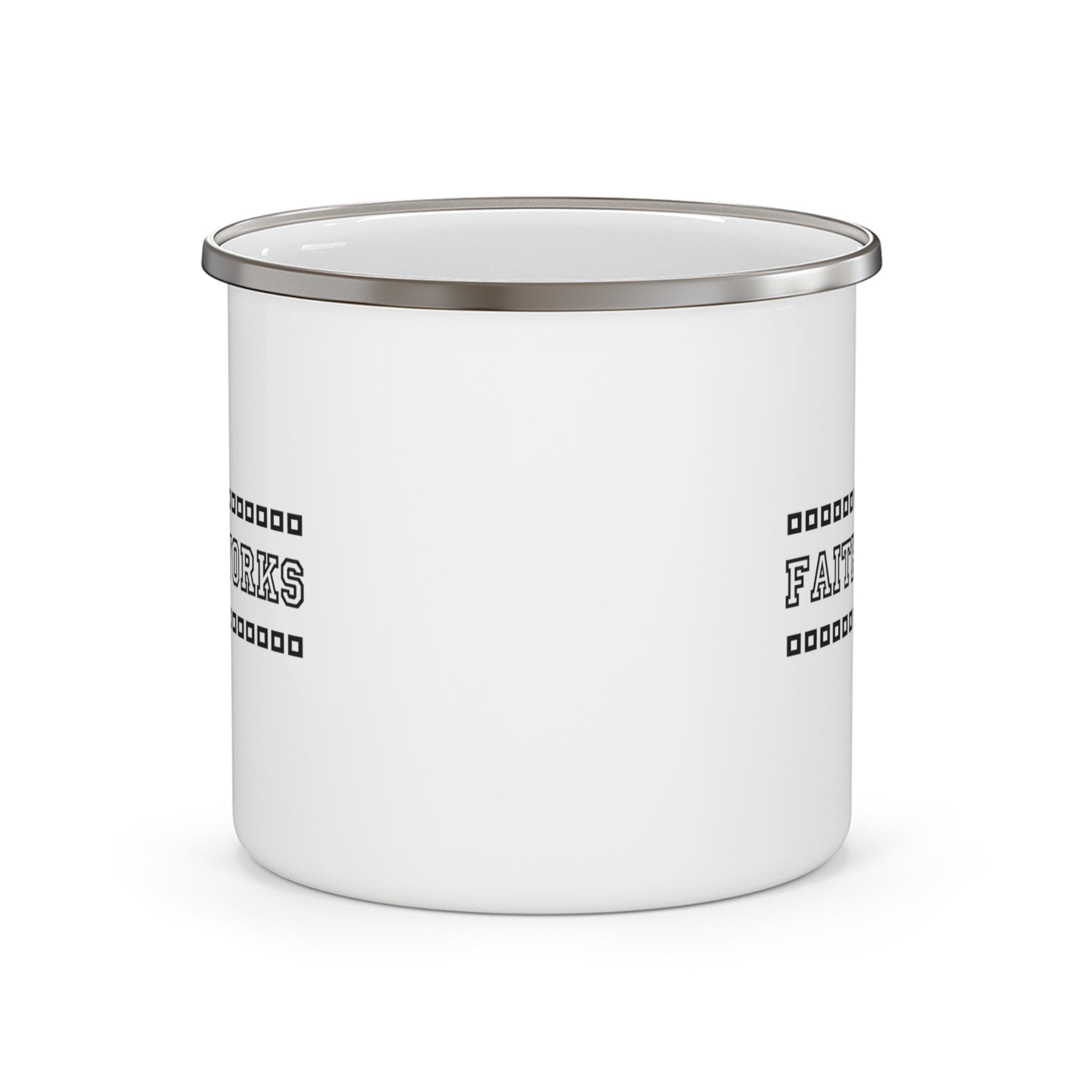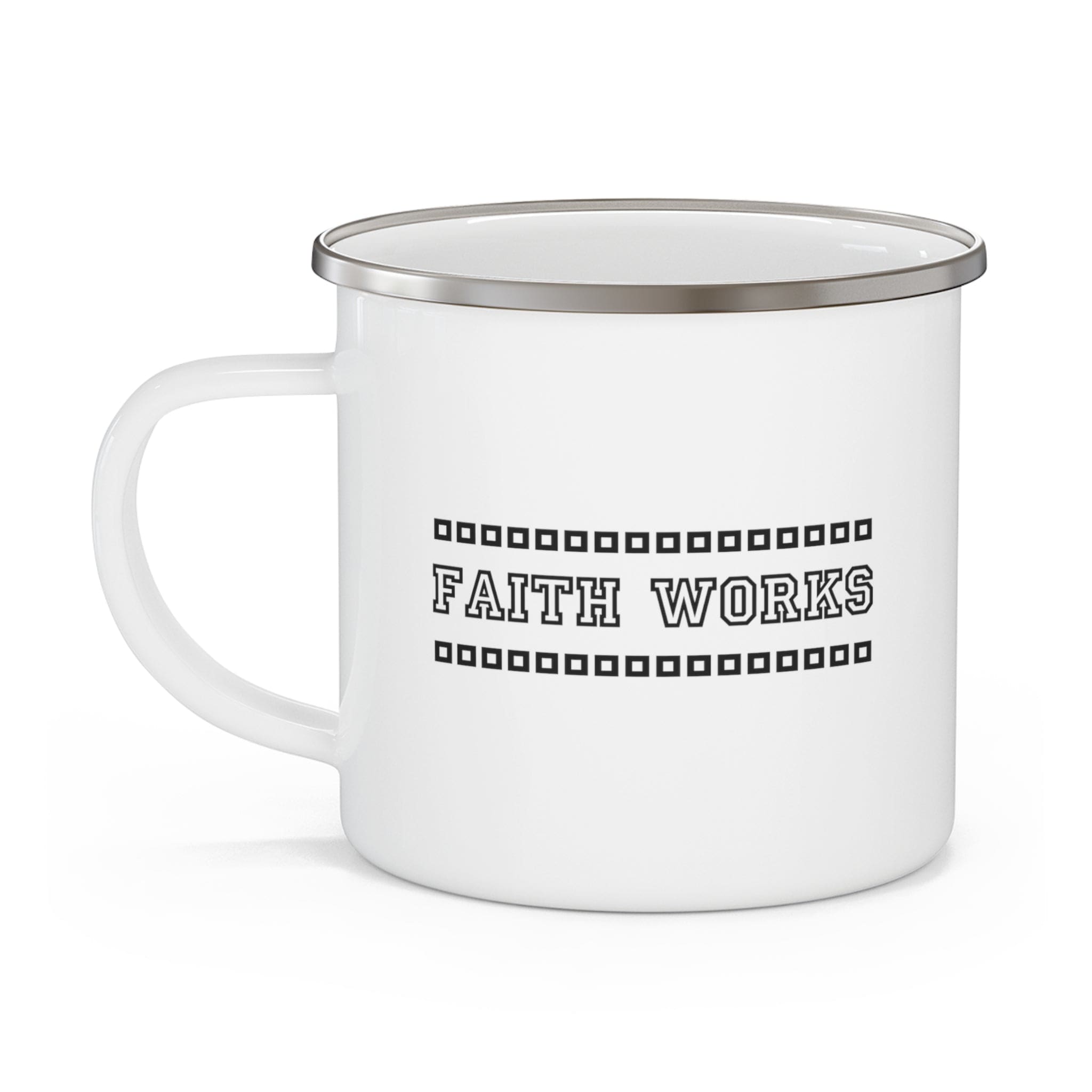 The Faith Works illustration adds a unique touch to this enamel camping mug, making it a great gift for friends, family, or yourself. Its stylish design is perfect for those who appreciate both functionality and aesthetics in their drinkware. This mug is not just a practical item; it's a statement piece that reflects your values and lifestyle.