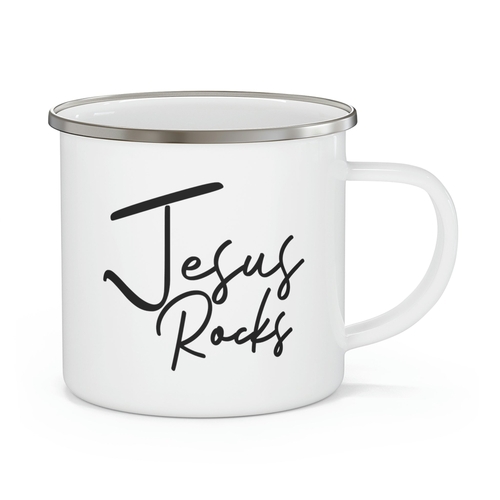 Introducing the Enamel Camping Mug, featuring the uplifting message 'Jesus Rocks.' This durable enamel mug is designed for both indoor and outdoor activities, making it an essential companion for your adventures. Whether you're sipping your morning coffee, enjoying a warm cup of tea, or even having your breakfast cereal, this mug is versatile enough to meet all your needs.