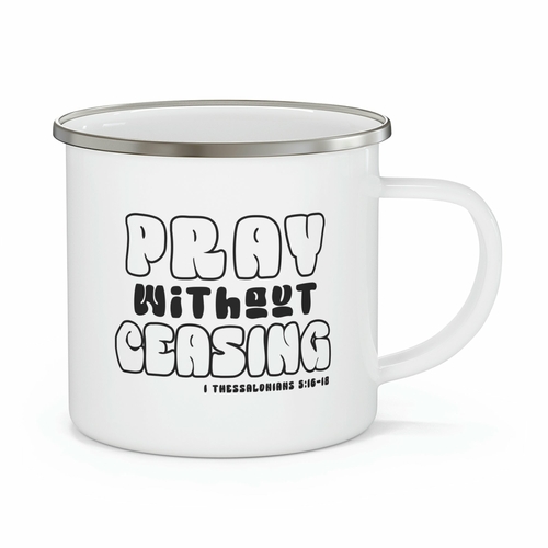 Introducing the Enamel Camping Mug, featuring the inspiring message 'Pray Without Ceasing' in a stylish black and white design. This durable enamel mug is not just a beverage holder; it's a statement piece for those who cherish their faith. Whether you're sipping coffee during a morning hike or enjoying tea by the campfire, this mug is designed to accompany you on all your adventures.