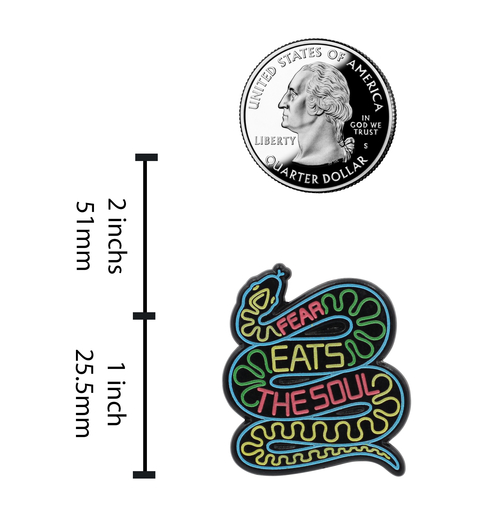 Fear is used to control – by bullies, bosses and governments. The reverse of fear is self-confidence, trust in your own ability to control yourself and your circumstances. We made this pin to inspire and heal, to build confidence and strength with the reminder that who you are is destroyed by the things you fear.