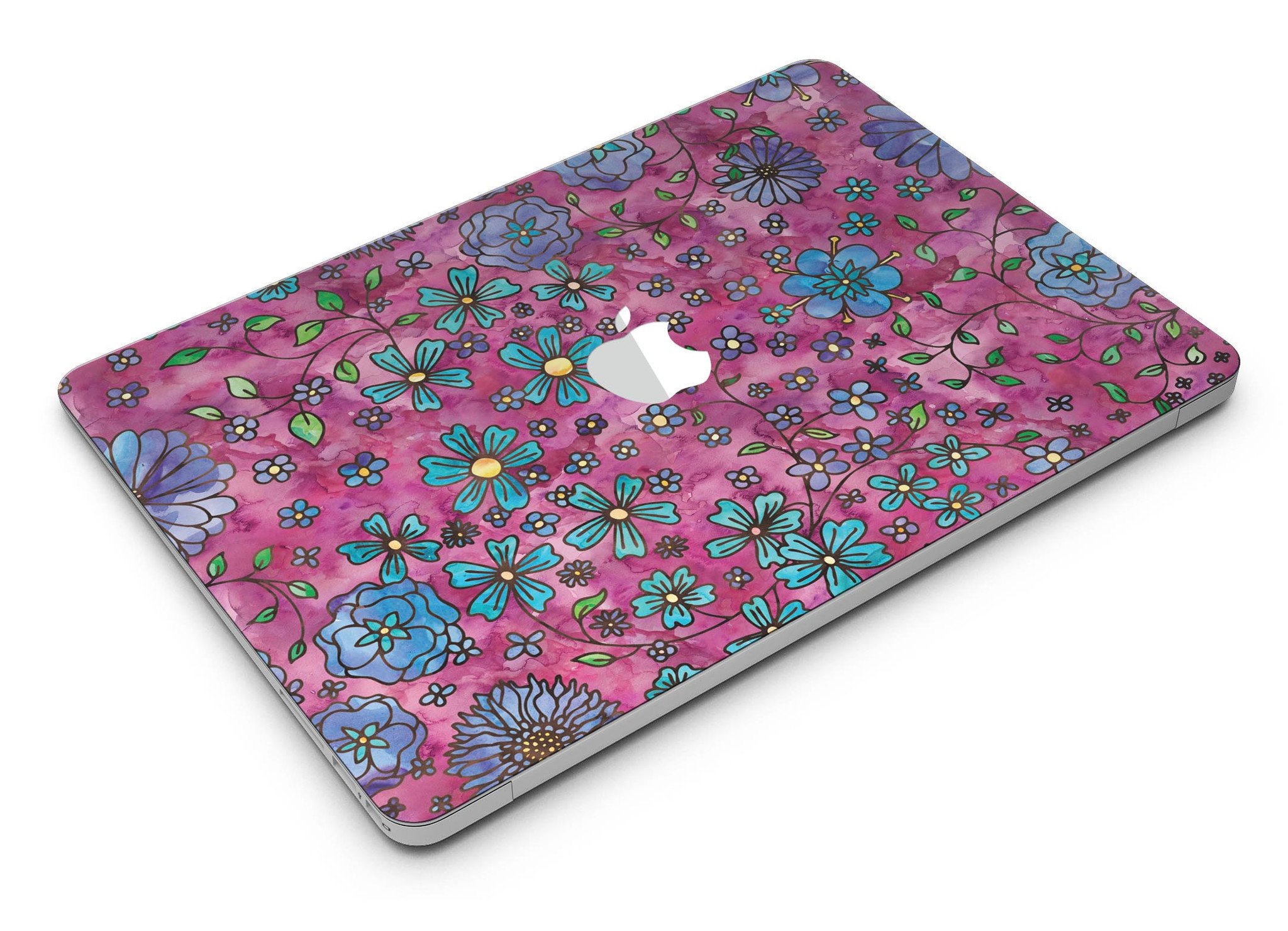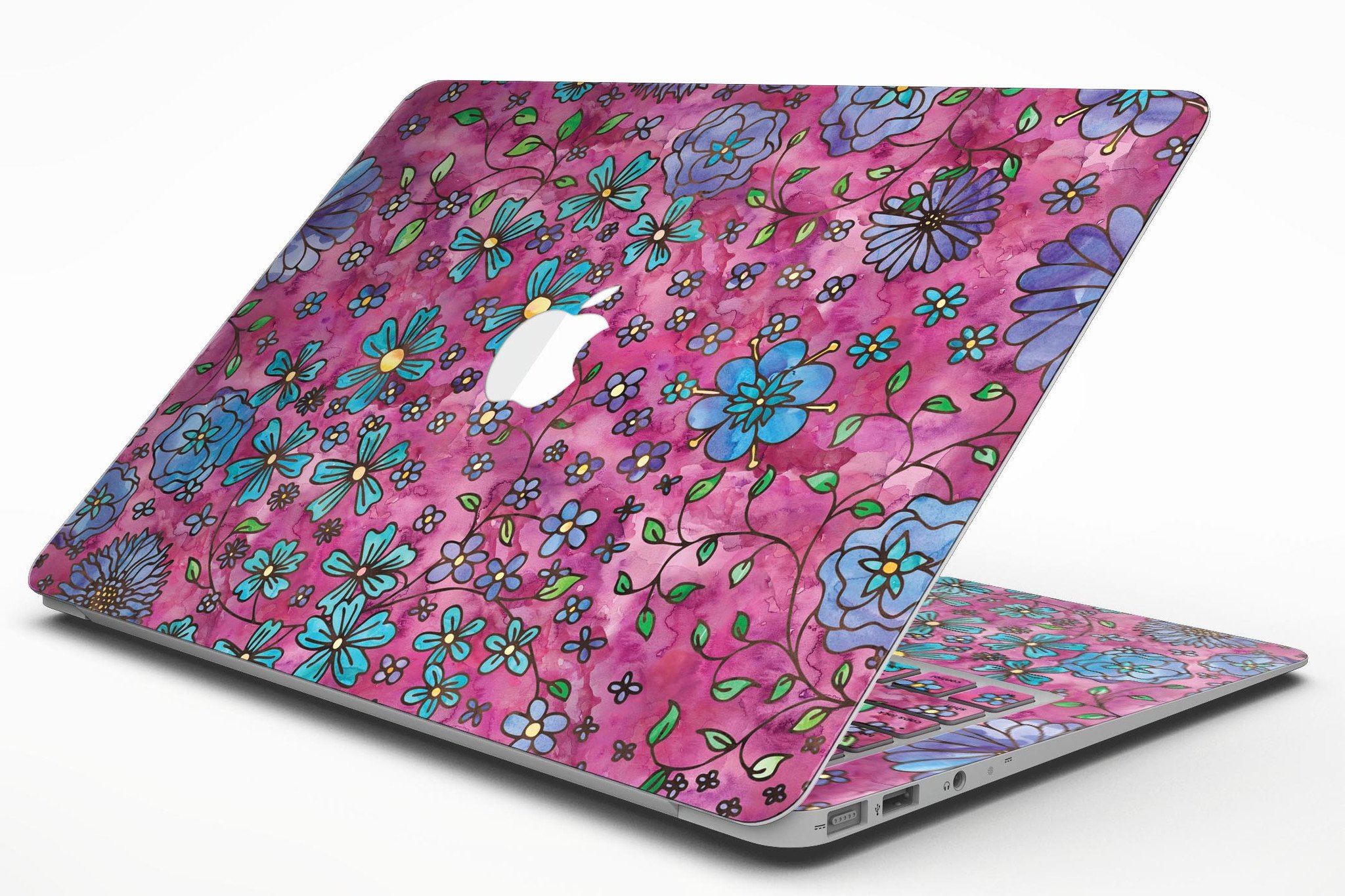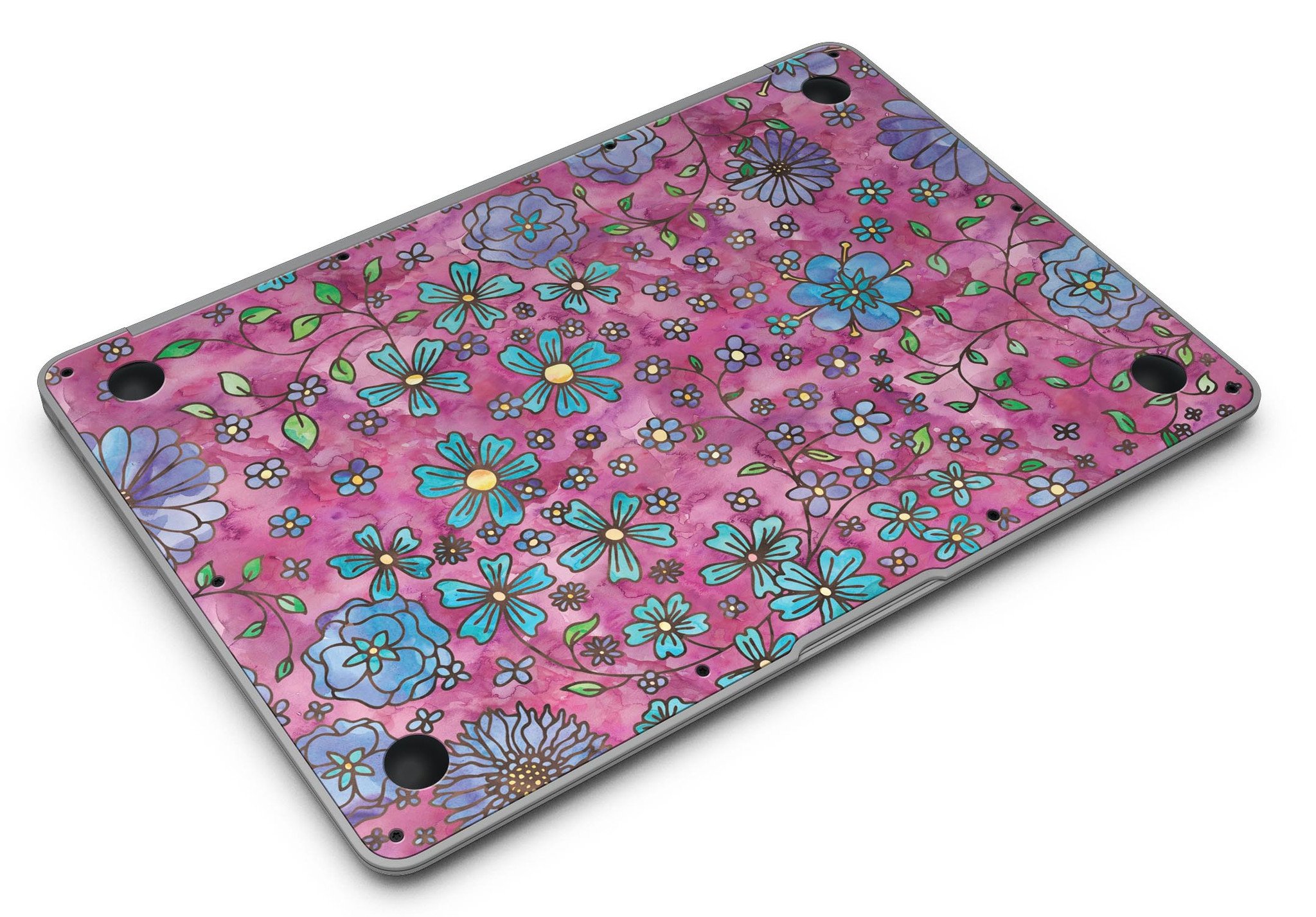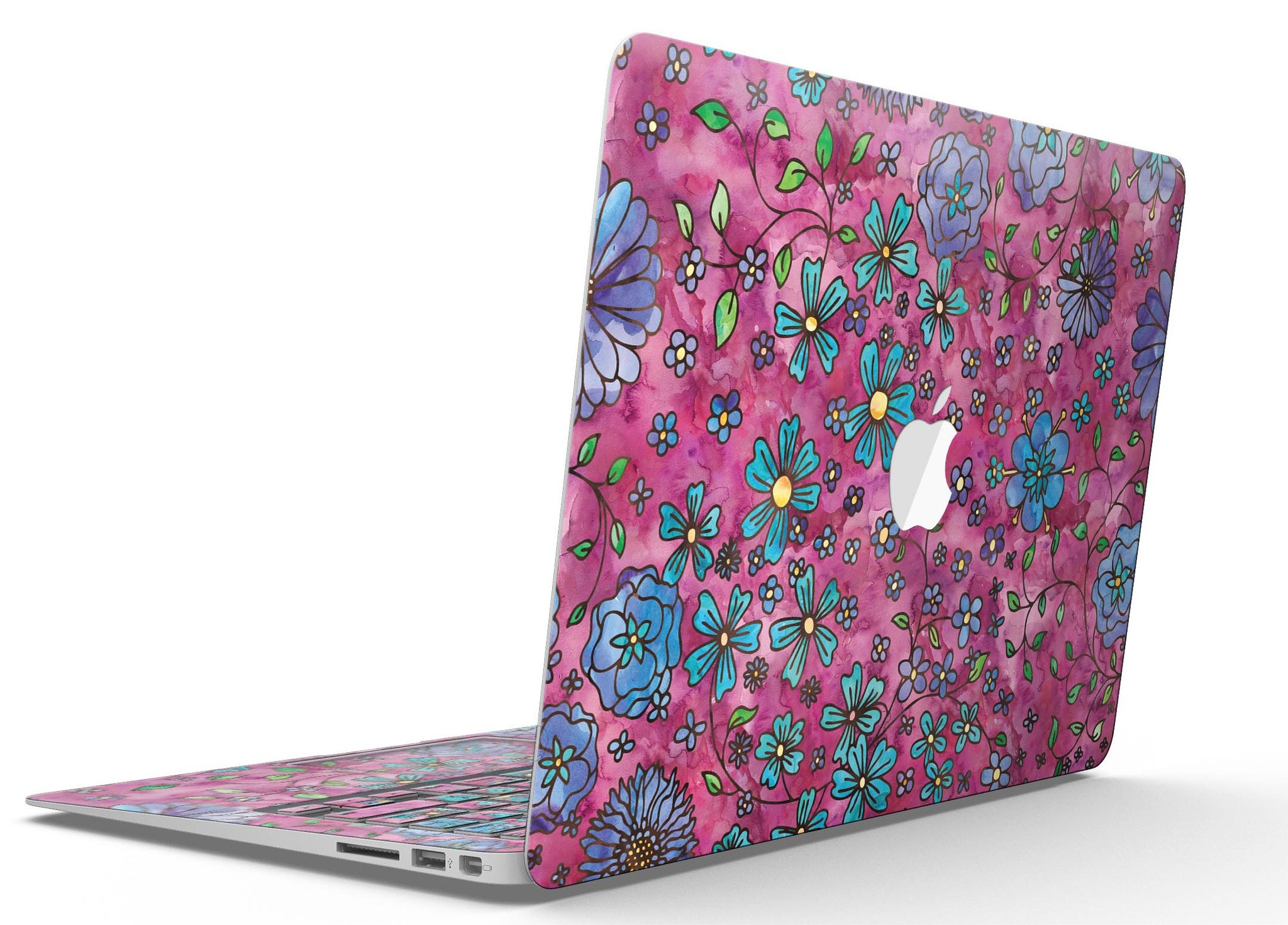 Floral Pattern on Wine Watercolor MacBook Air Skin Kit showcasing vibrant floral designs on a sleek laptop surface.