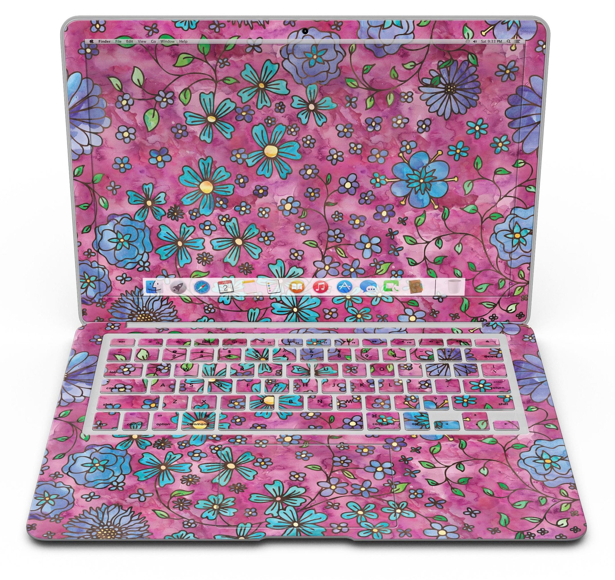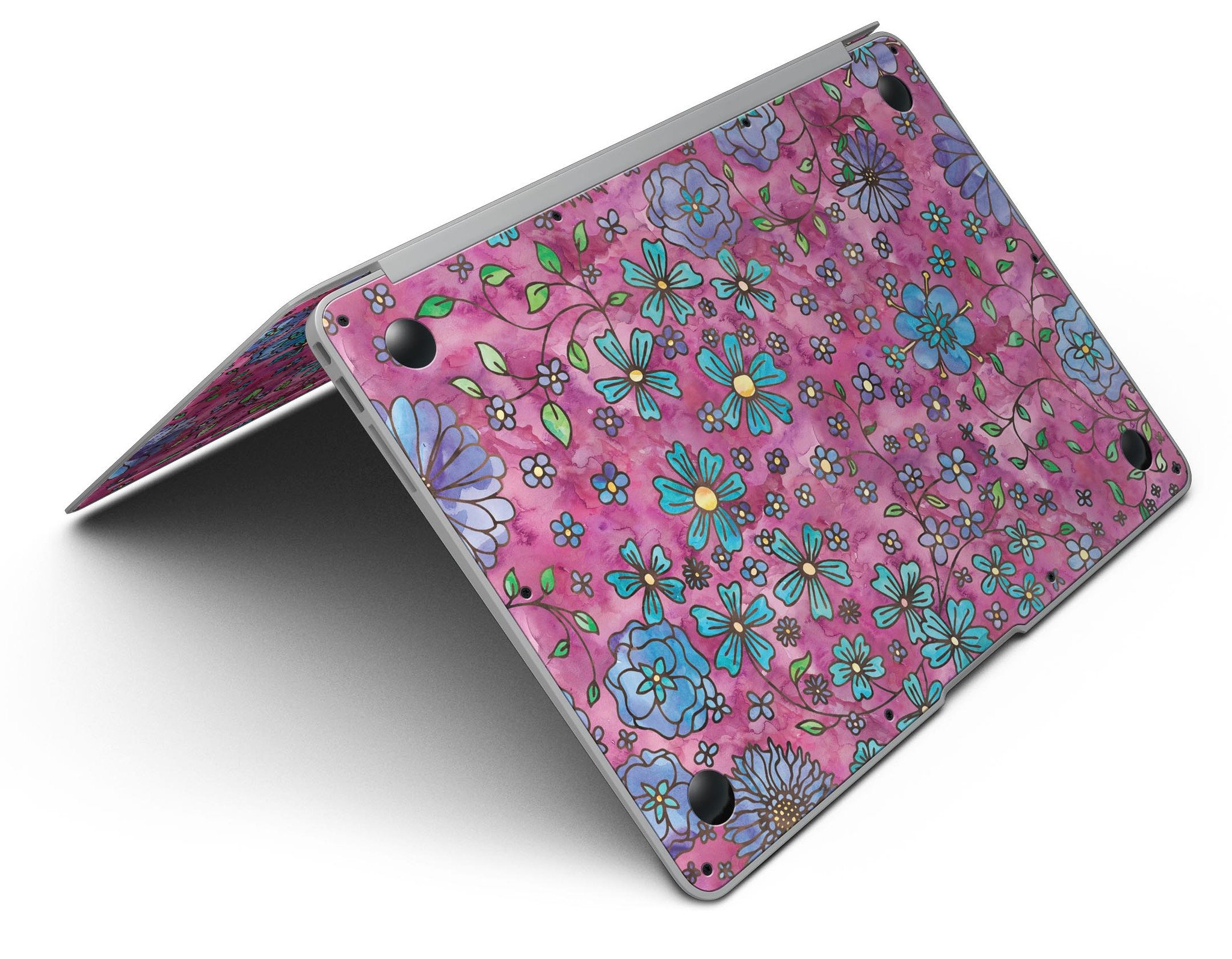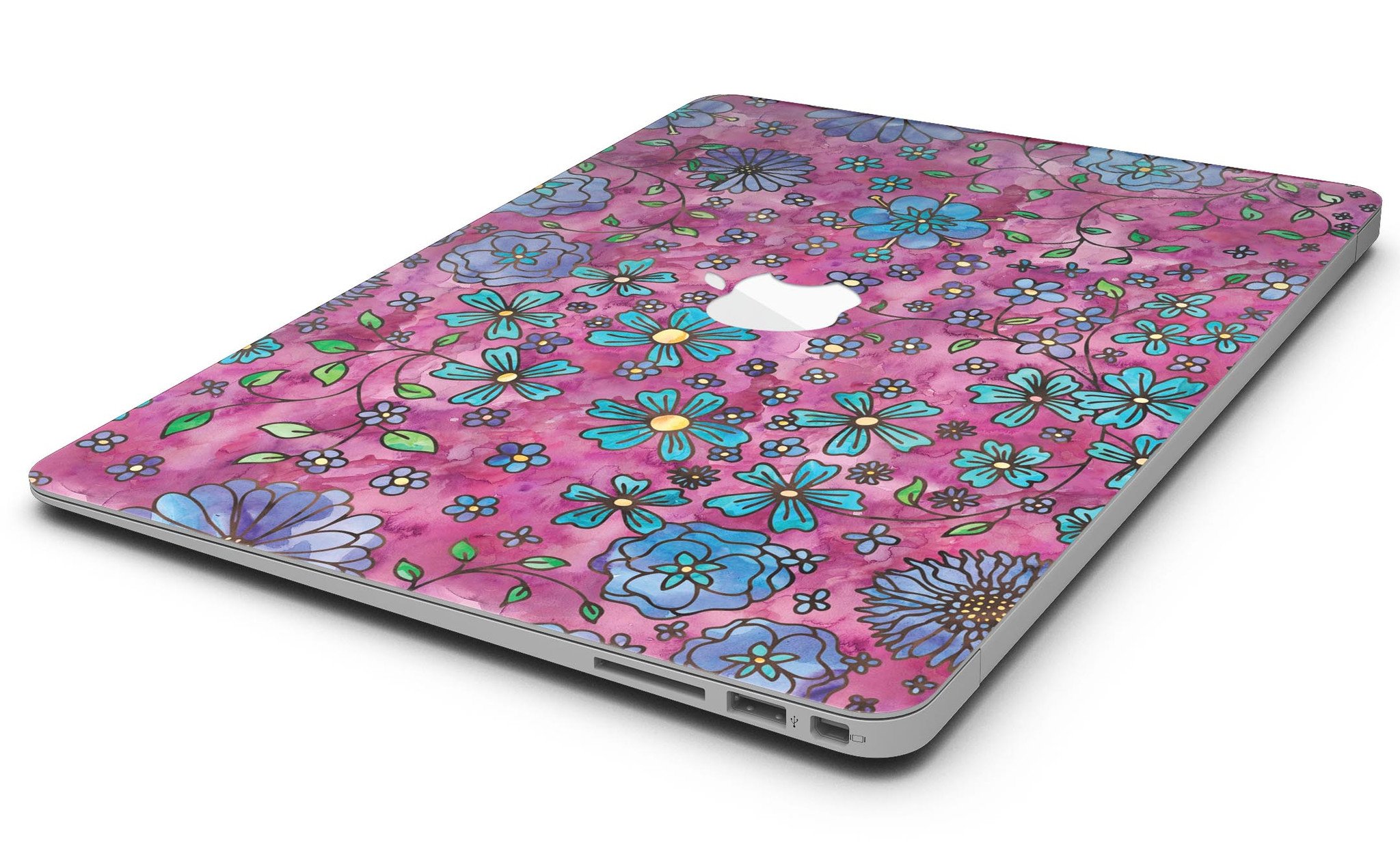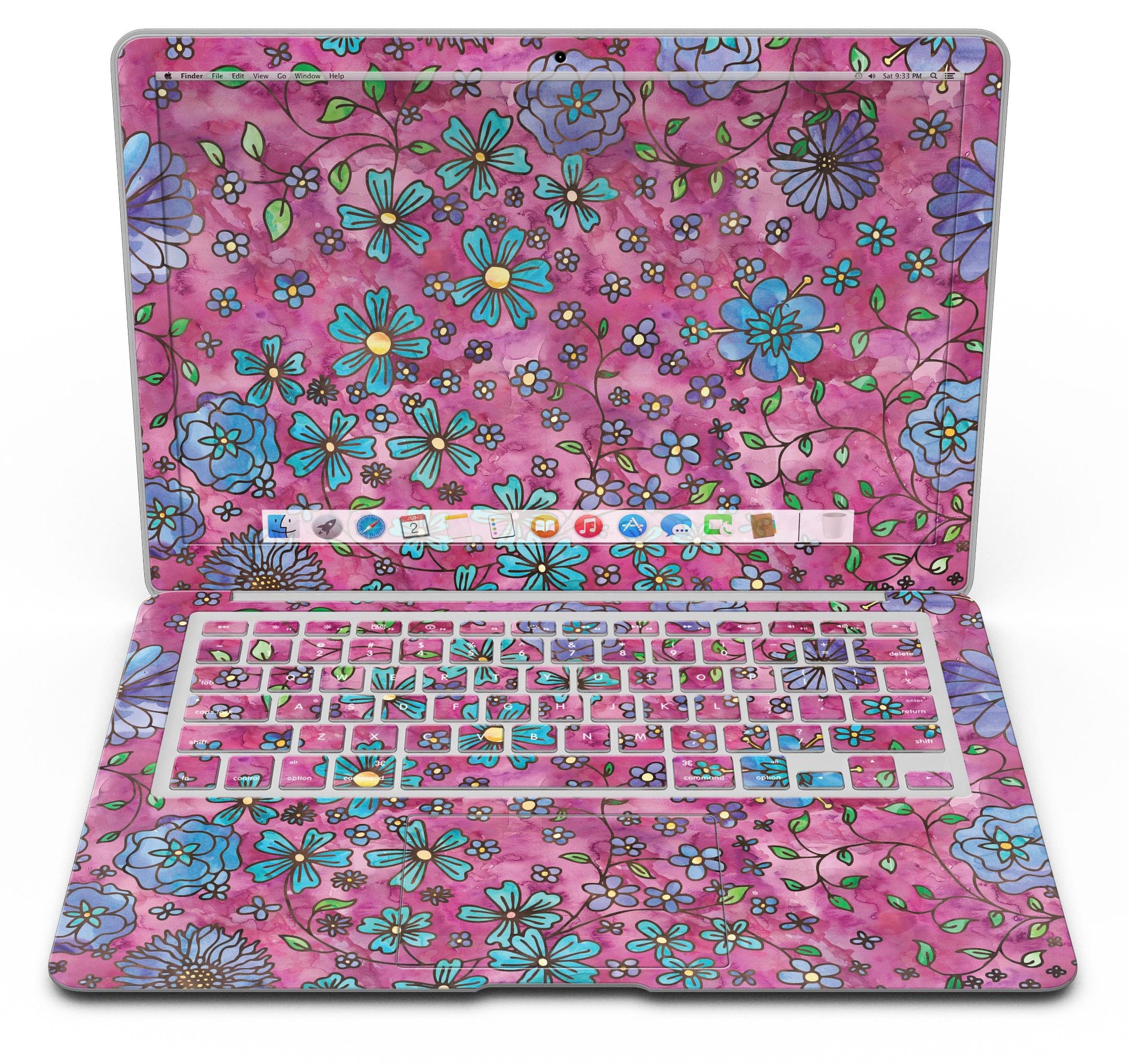 Floral Pattern on Wine Watercolor MacBook Air Skin Kit showcasing vibrant floral designs on a sleek laptop surface.