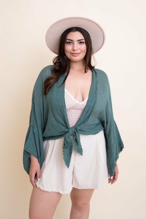 The Flounce Tie-Front Kimono Wrap features a chic tie-front closure that adds a touch of femininity to your look. This design element not only enhances your silhouette but also allows for easy adjustments to achieve the perfect fit. The kimono sleeves provide a relaxed and comfortable fit, making it an ideal choice for warm weather or casual outings.