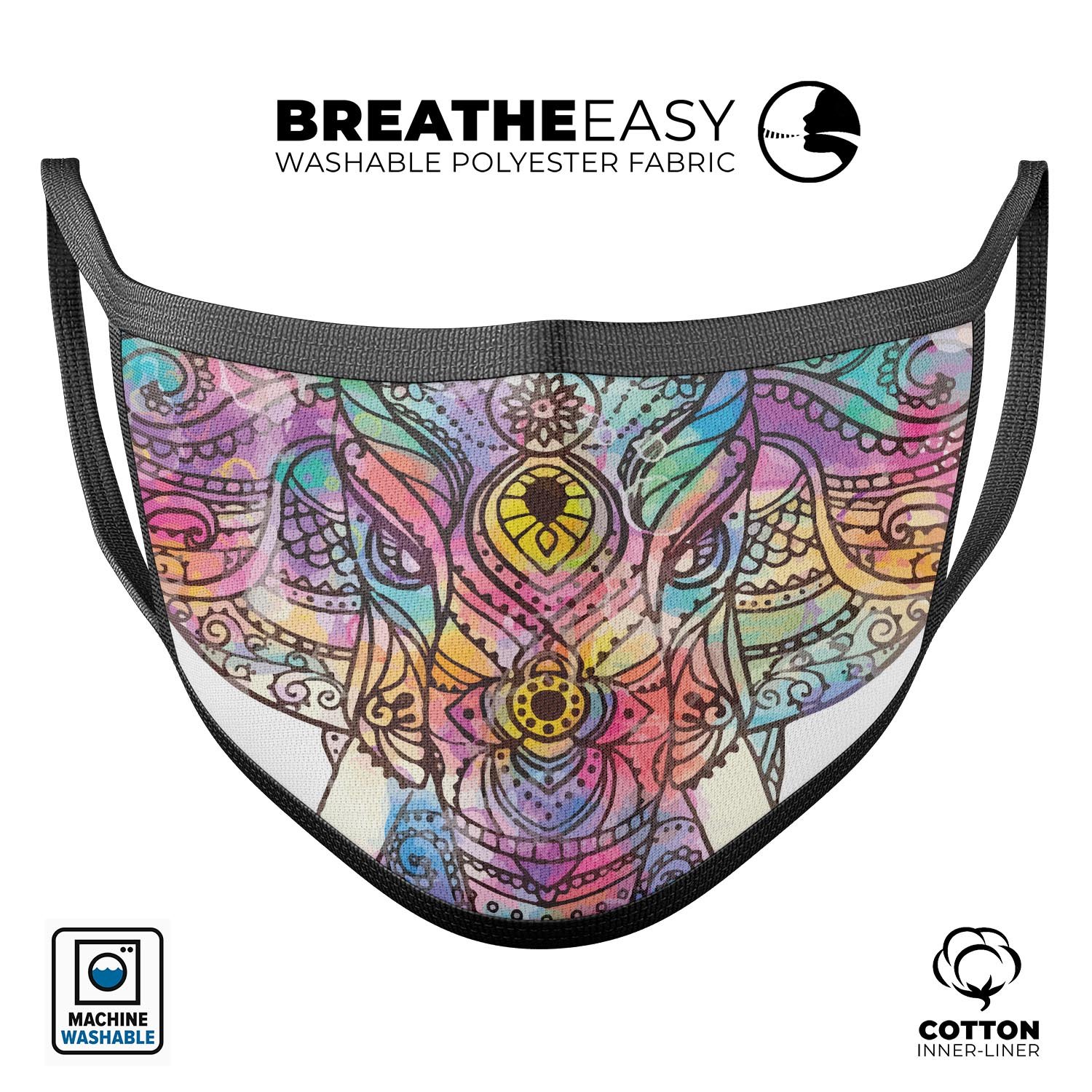 Introducing the Flourished Sacred Elephant mouth cover, a unique and stylish solution for those seeking comfort and protection from dust and allergens. This reusable 3D face mask is crafted with precision using special cutting and sewing techniques, ensuring a high-quality product that is both functional and fashionable. Made in the USA, this mask is printed in-house at our Danville, VA warehouse, guaranteeing that you receive a product that supports local craftsmanship.