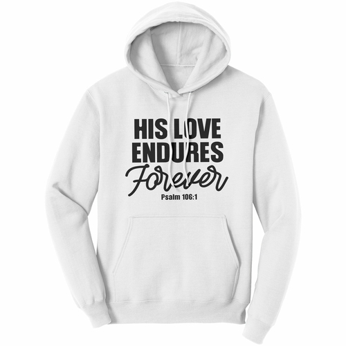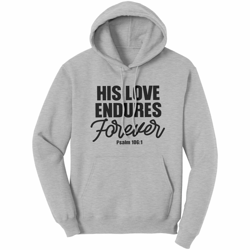 The graphic design on the front of the hoodie is not only stylish but also meaningful. The phrase 'His Love Endures Forever' serves as a reminder of the enduring love and support that surrounds us. This makes it a great gift for loved ones or a personal item to express your faith and values. The design is printed with high-quality inks that resist fading, ensuring that the message remains vibrant over time.
