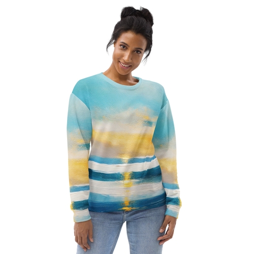 The eye-catching graphics of the Blue Ocean Golden Sunset Print are designed to turn heads and make a distinct impression wherever you go. This unique design captures the beauty of nature, bringing a touch of the outdoors into your wardrobe. The vibrant colors and intricate details of the print ensure that you stand out from the crowd, making this sweatshirt a must-have for any fashion-forward woman.