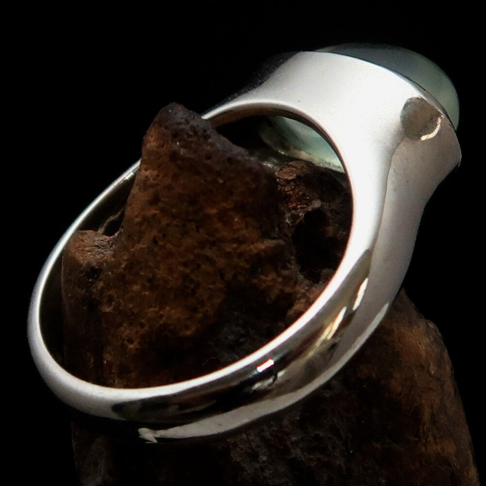 Crafted with care, this ring features a mirror-polished finish that adds a touch of sophistication to its overall design. The oval green Prehnite stone measures 13mm x 6mm, perfectly set to catch the light and draw attention. The ring is hallmarked 925, ensuring its quality and authenticity, so you can wear it with confidence knowing it is made from genuine sterling silver.
