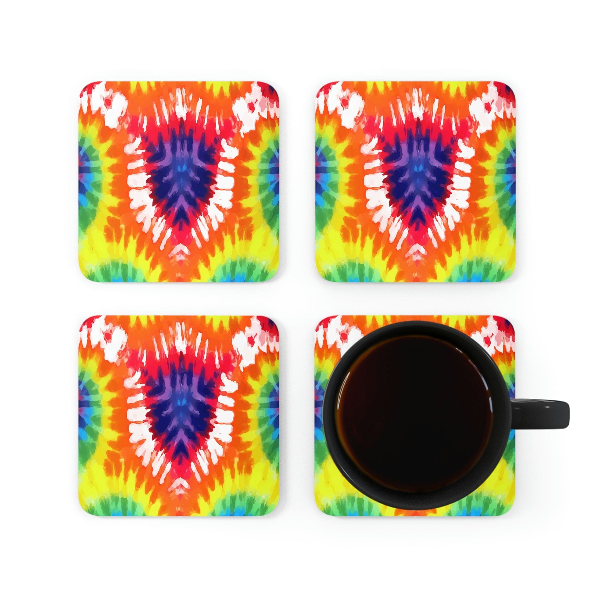 Introducing our stunning 4-piece coaster set, designed to elevate your home decor and add a splash of color to any space. Featuring a mesmerizing psychedelic rainbow tie design, these coasters are not just functional but also serve as a vibrant statement piece for your coffee table or office desk. Each coaster measures 3.75" × 3.75" (9.50cm x 9.50cm), making them the perfect size for any standard cup or glass.