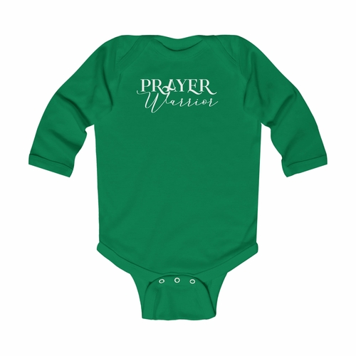 Infant Long Sleeve Bodysuit featuring a Prayer Warrior design, made from soft cotton with snap closures.