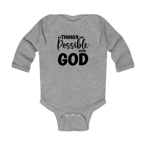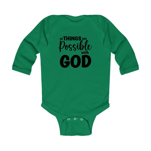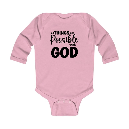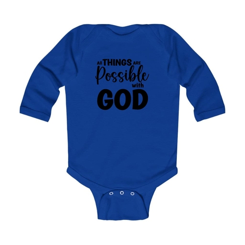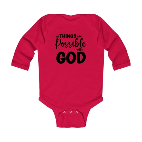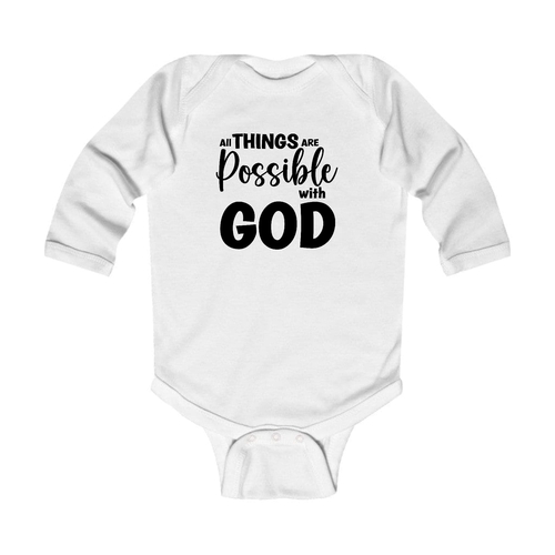 In summary, the Infant Long Sleeve Graphic T-shirt 'All Things Are Possible With God' is a must-have for any baby's wardrobe. With its combination of quality materials, thoughtful design, and stylish appearance, it is sure to become a favorite for both parents and infants alike.