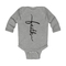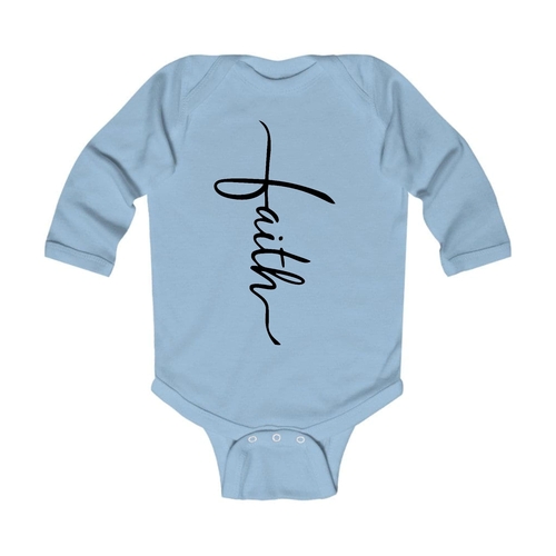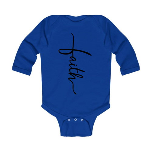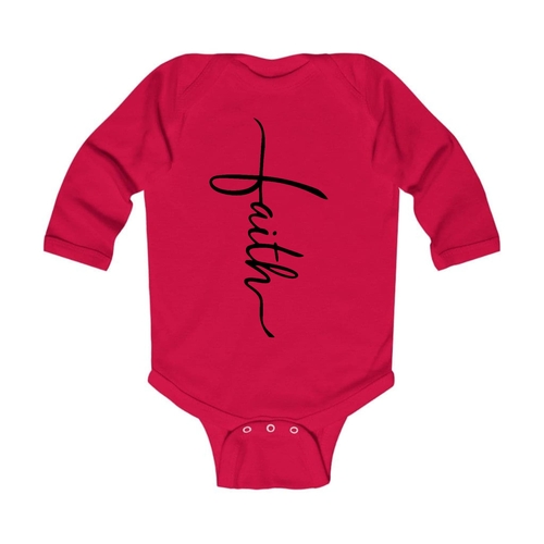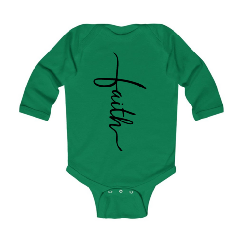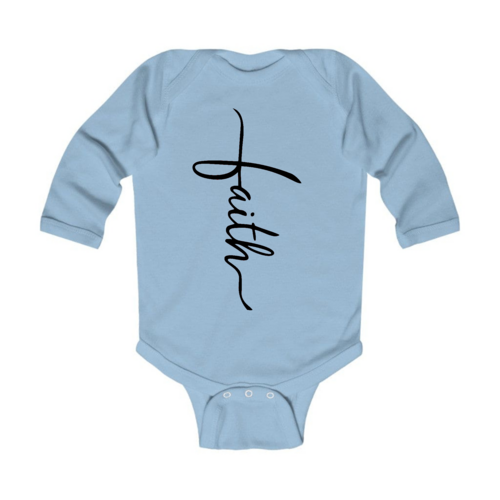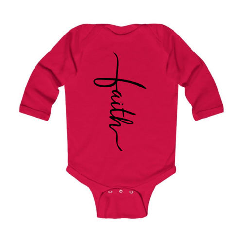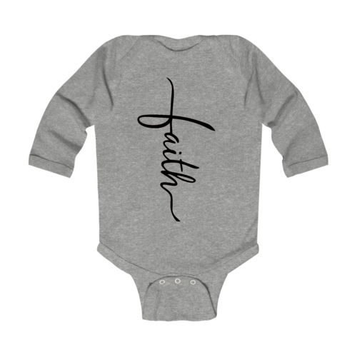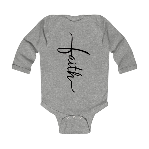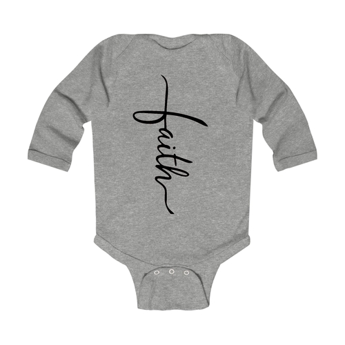Introducing our Infant Long Sleeve Graphic T-shirt featuring a beautiful Faith Script Cross design in classic black. This t-shirt is not just a piece of clothing; it's a statement of faith and style for your little one. Crafted from 100% combed ringspun cotton, this shirt ensures that your baby stays comfortable throughout the day, whether they are playing, napping, or exploring the world around them.