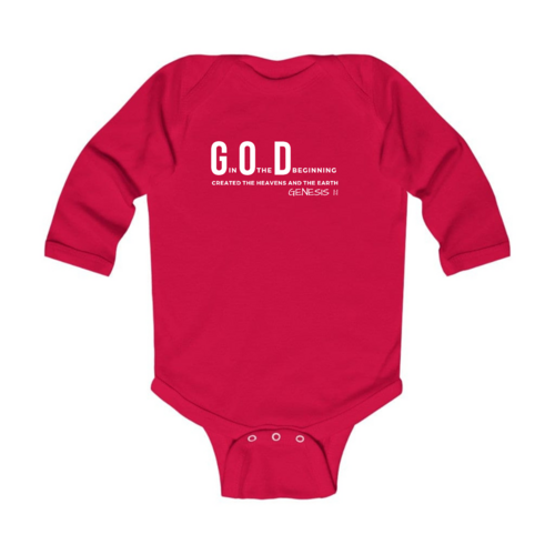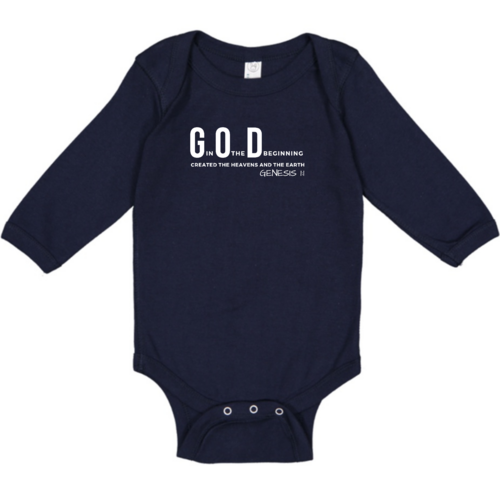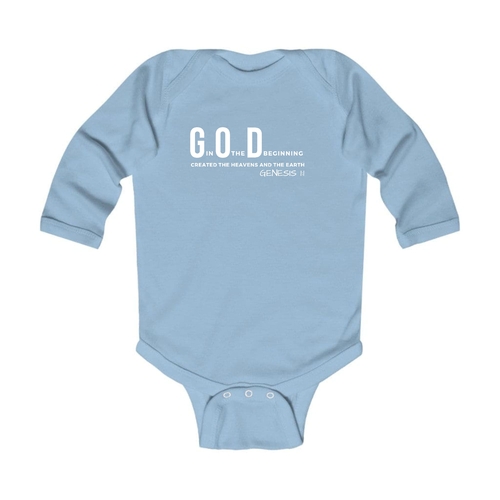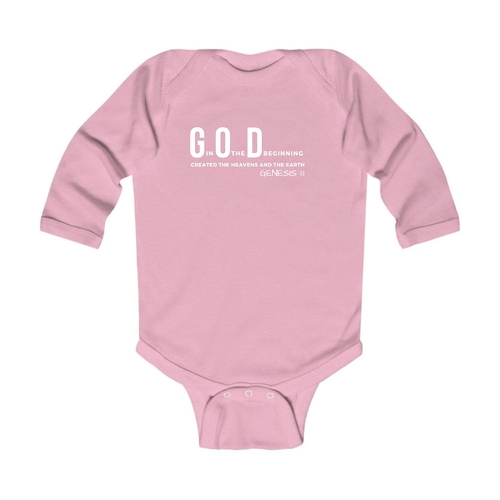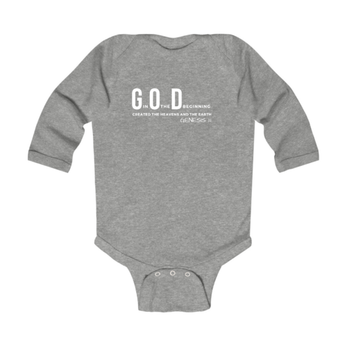 Infant Long Sleeve Graphic T-shirt with God in the Beginning print, featuring soft fabric and lap shoulder design for easy dressing.
