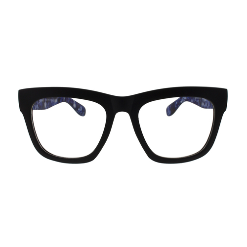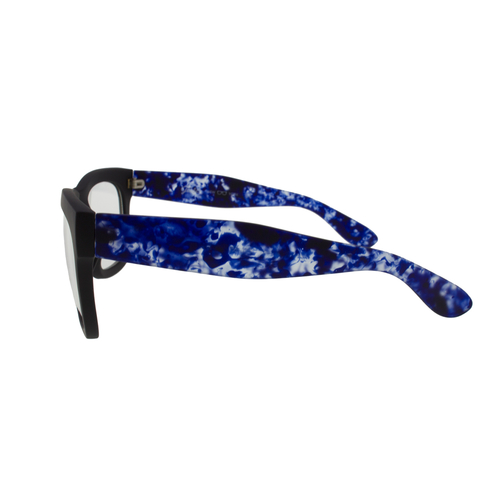 Thick framed glasses for everyday wear. Lightweight black frame featuring thick "Blue Haze" temples and UV coated lenses ensure complete comfort and sun protection.