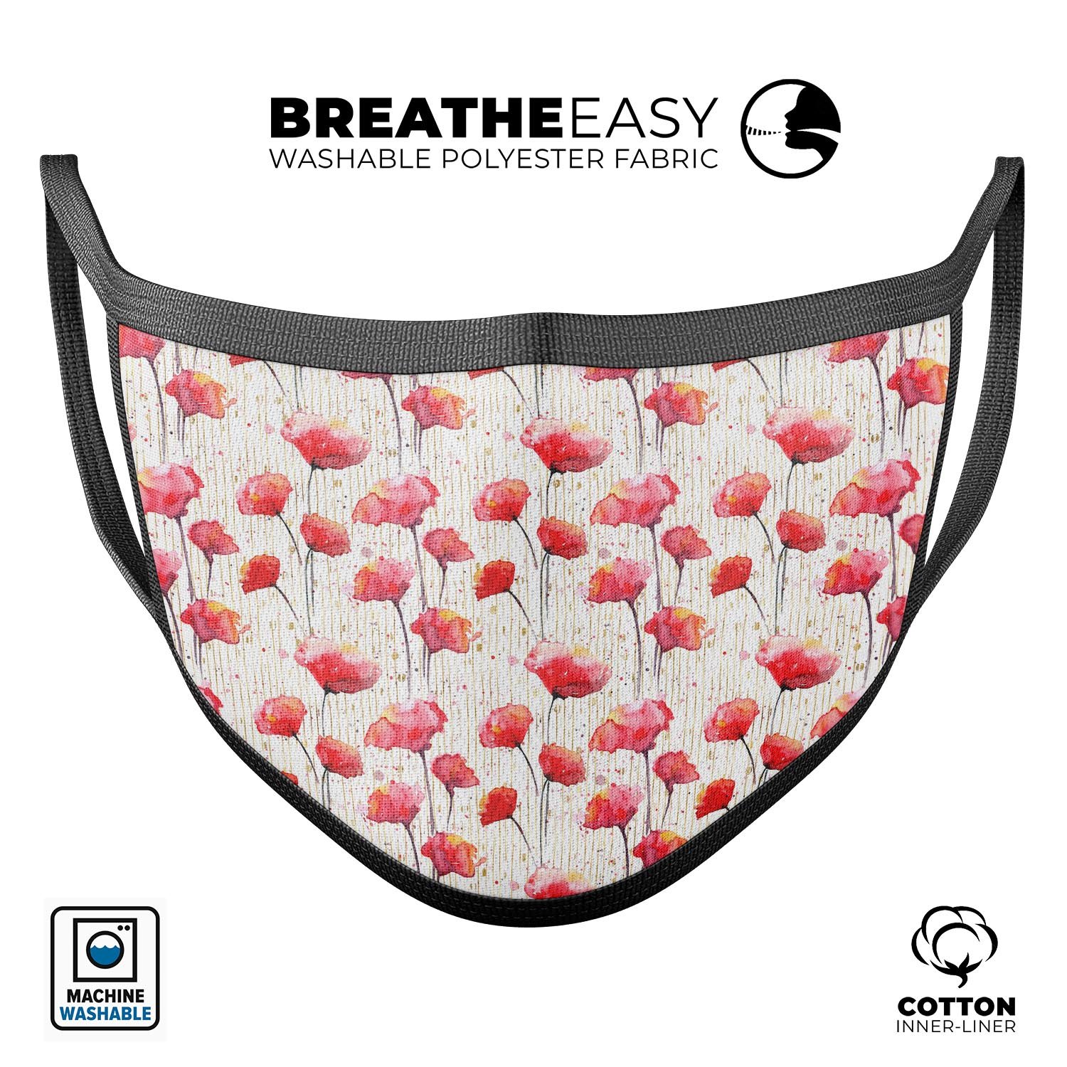 This protective mouth cover is perfect for both indoor and outdoor use. Whether you're at home, in the office, or out in public spaces, the Karamfila Watercolo Poppies V14 mask helps reduce the spread of germs from yourself to others. However, it's important to note that this mask is not FDA-approved and is not intended for medical use. It is designed for everyday wear and is not proven to reduce the transmission of disease.