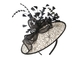 Large cream plate fascinator made from fine sinamay and covered in luxurious black lace. Decorated with large loops and long feathers.