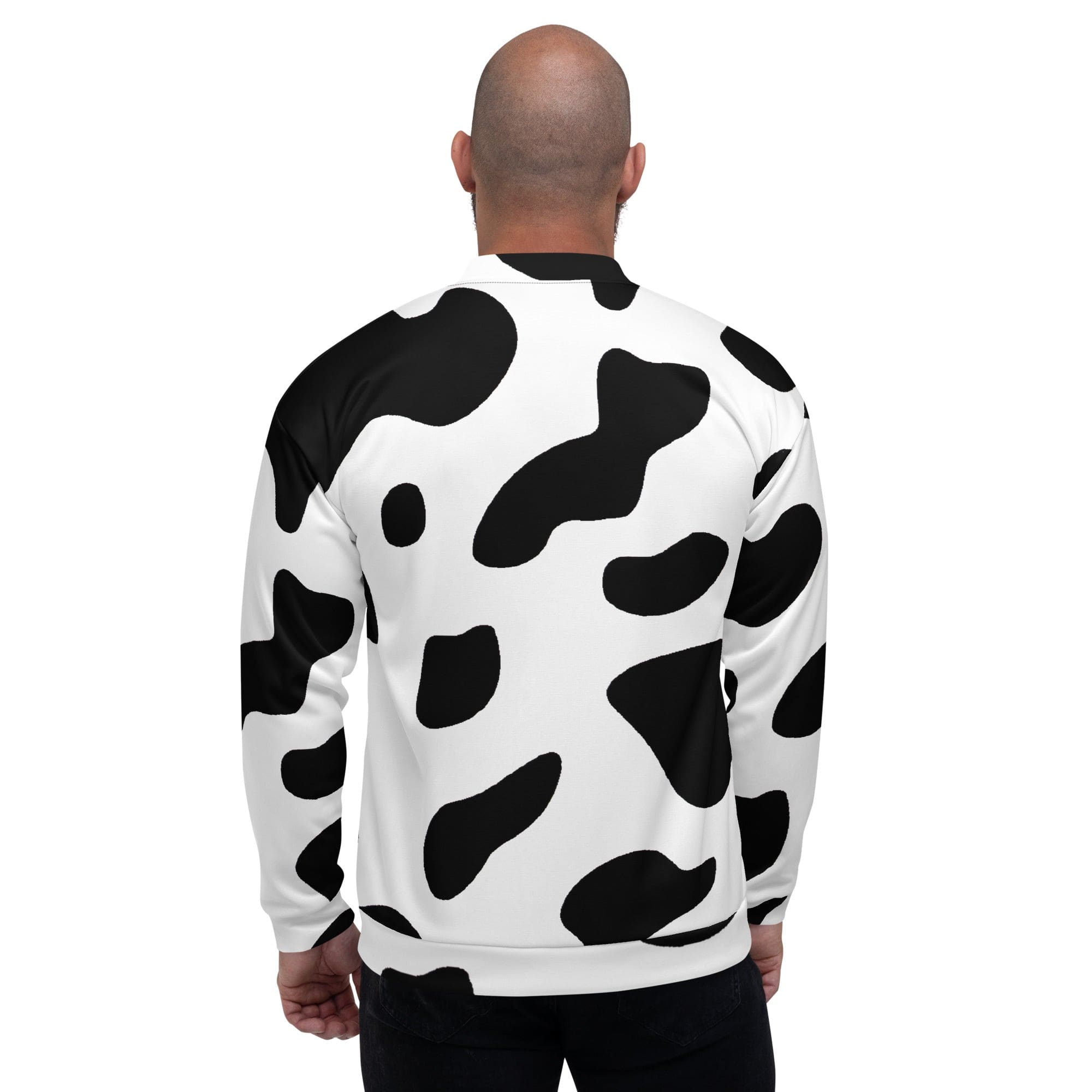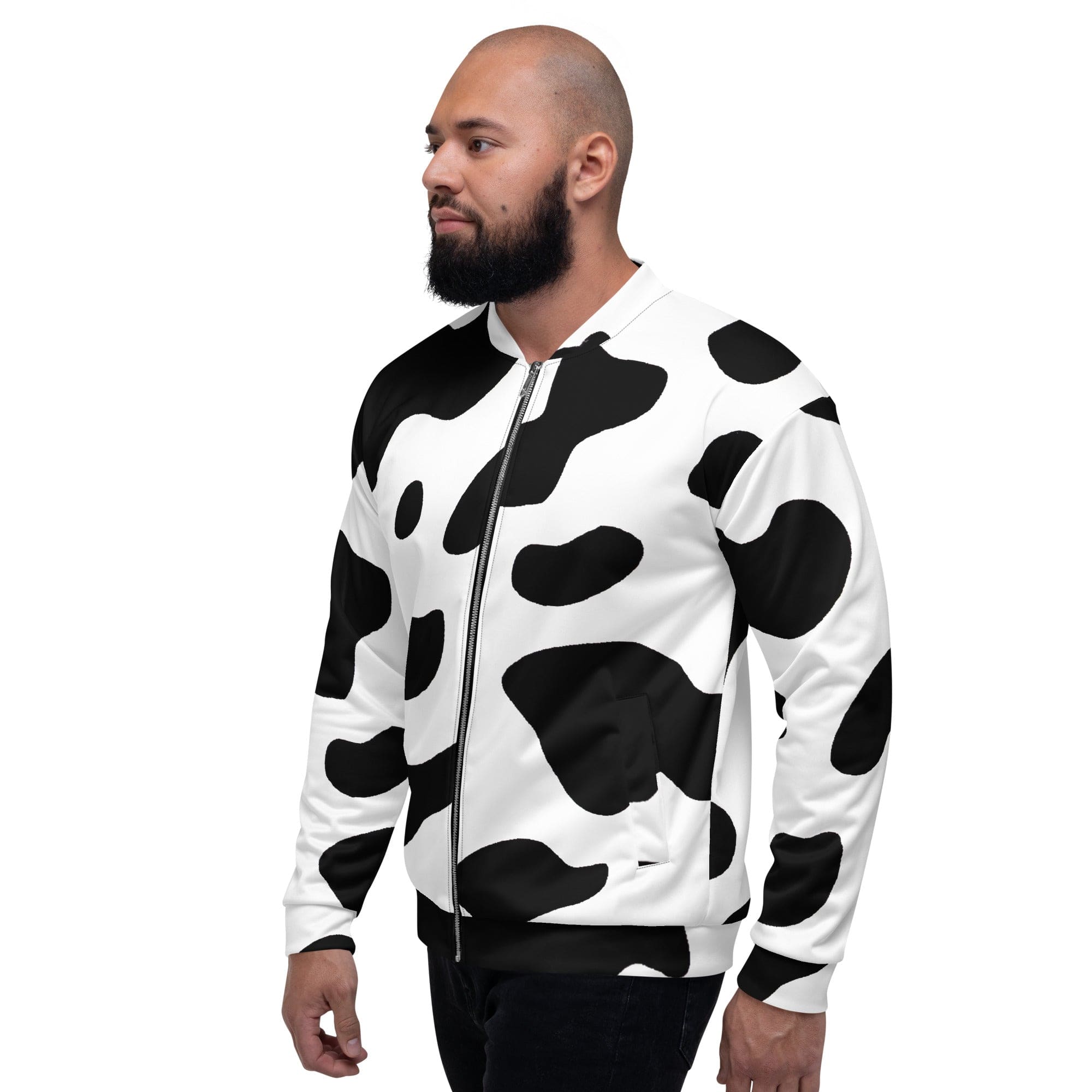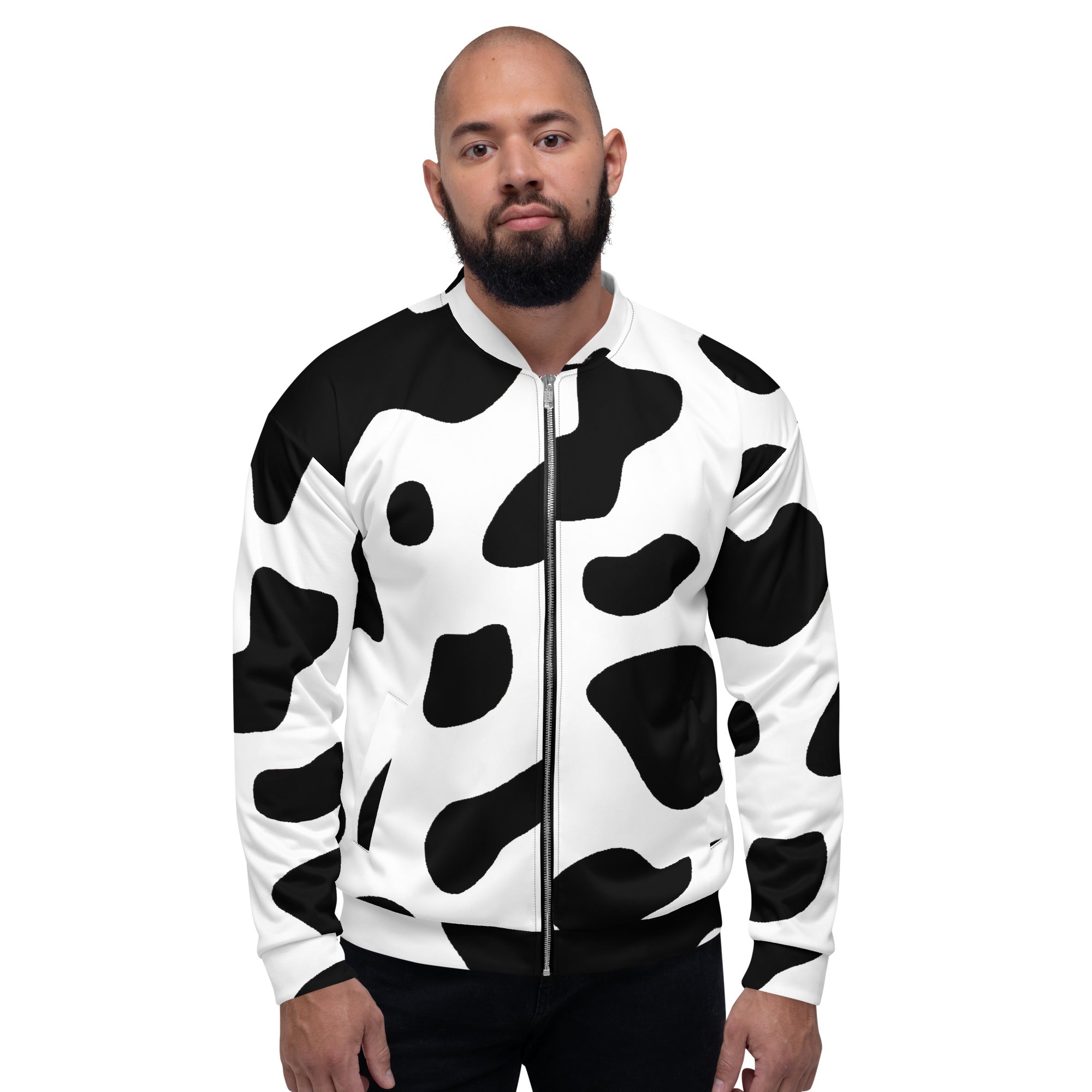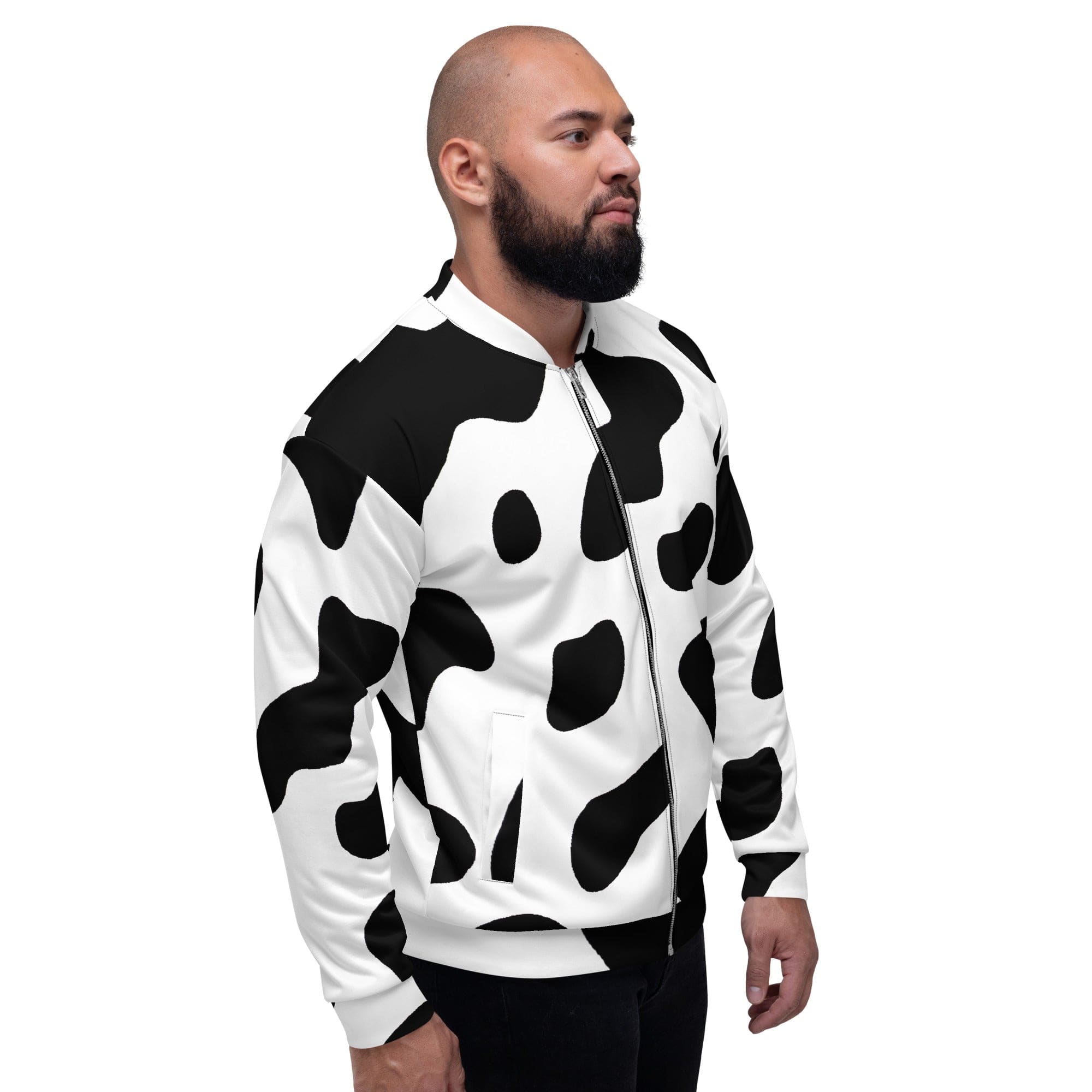 Men's bomber jacket featuring a black and white cow print design, zip-front closure, and ribbed cuffs, perfect for stylish layering.