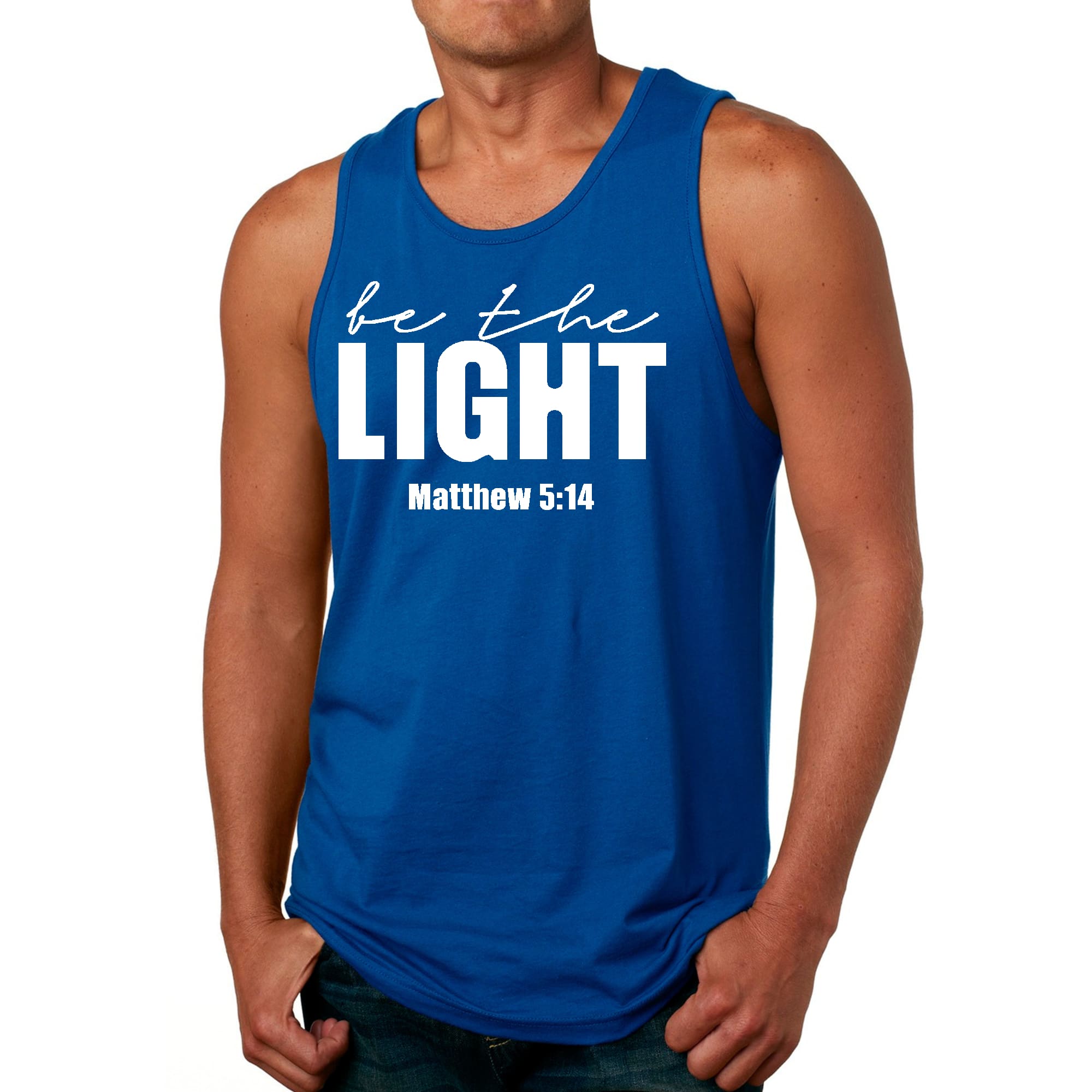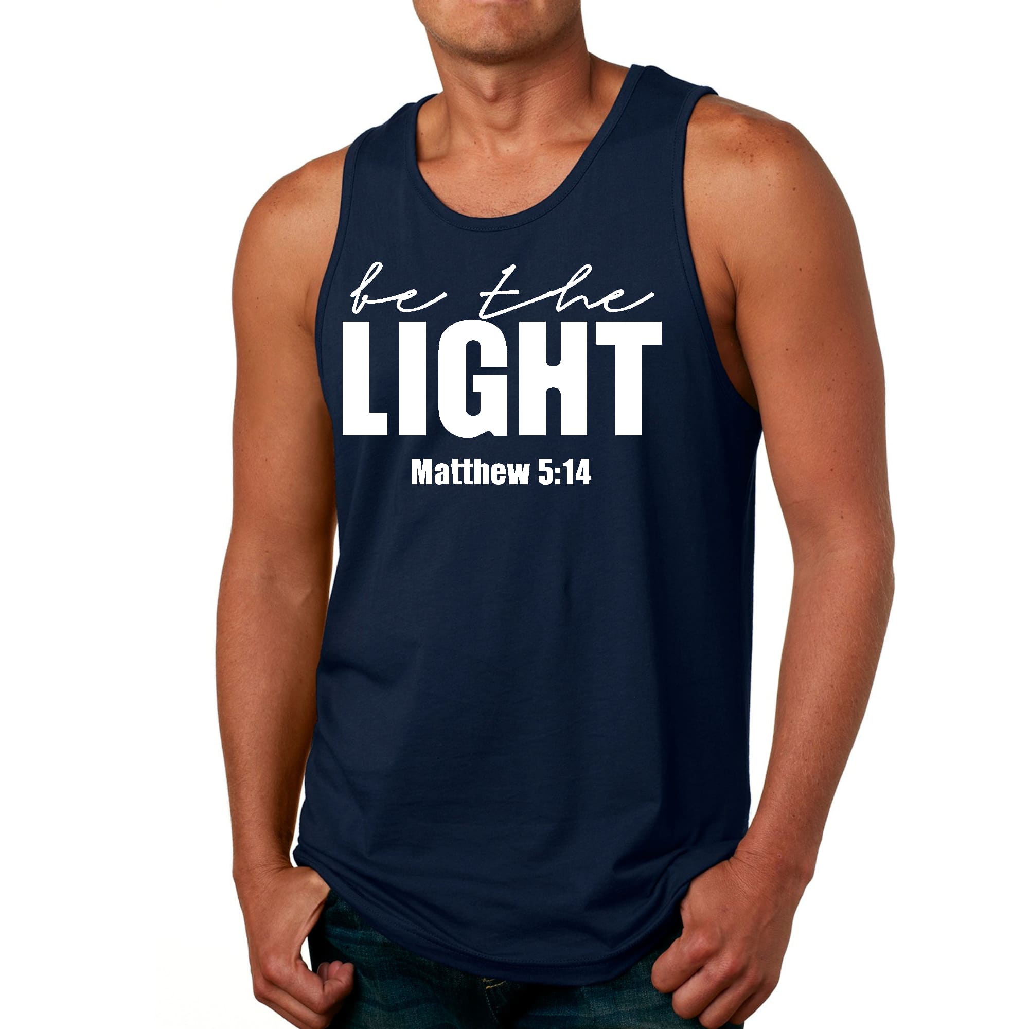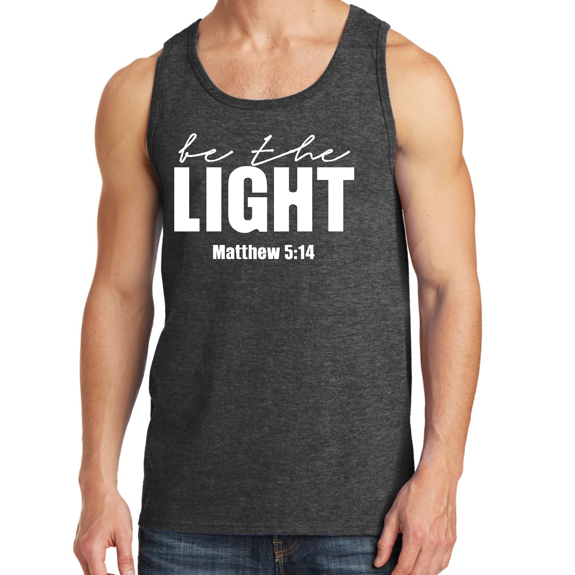 Introducing the Men's Fitness Tank Top Graphic T-shirt, a perfect blend of style and comfort designed for those who strive to be their best. This tank top features the uplifting message 'Be The Light' illustrated in an eye-catching graphic art style, making it not just a piece of clothing but a source of motivation for your fitness journey.