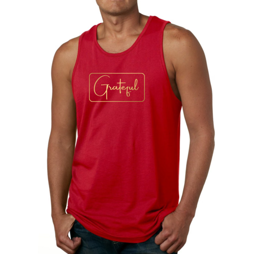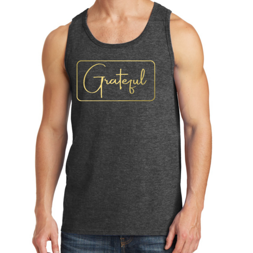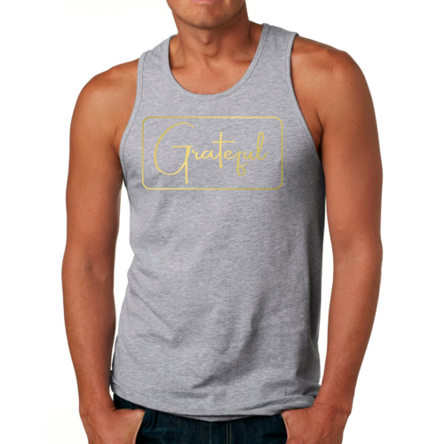 Introducing our Men's Fitness Tank Top Graphic T-Shirt featuring a stunning Grateful Metallic Gold illustration. This tank top is designed for those who value both style and comfort during their workouts. Made from high-quality preshrunk cotton, this fitness tee ensures that you enjoy a soft feel against your skin while maintaining its shape and size even after multiple washes.