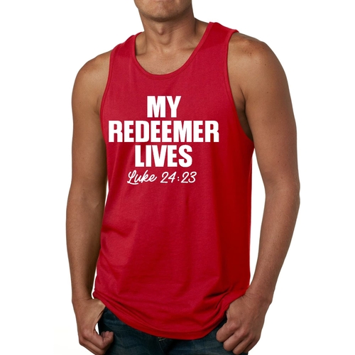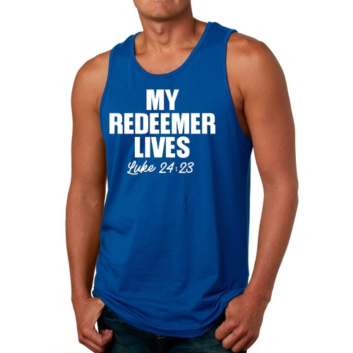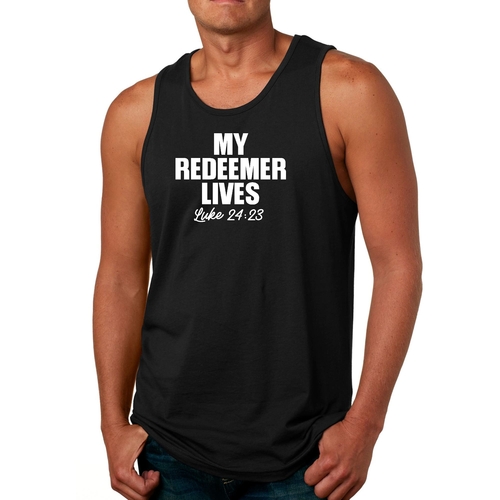 Men's fitness tank top featuring 'My Redeemer Lives' graphic print, made from soft preshrunk cotton for comfort and durability.