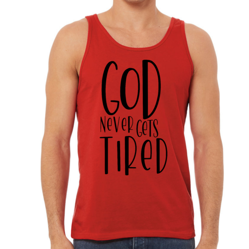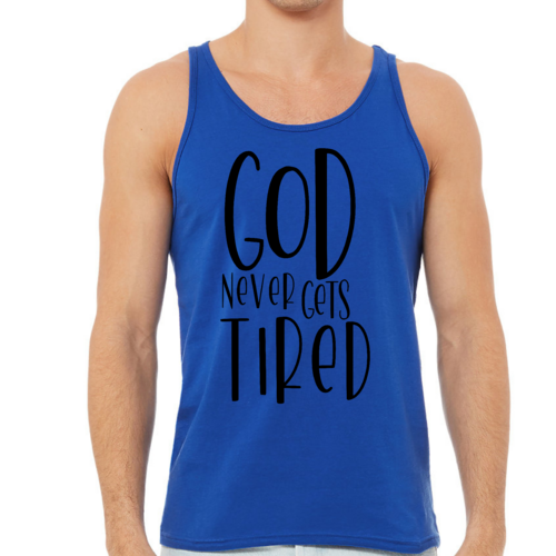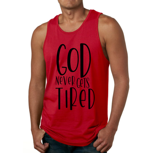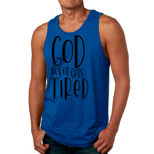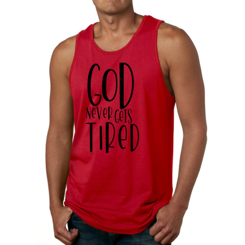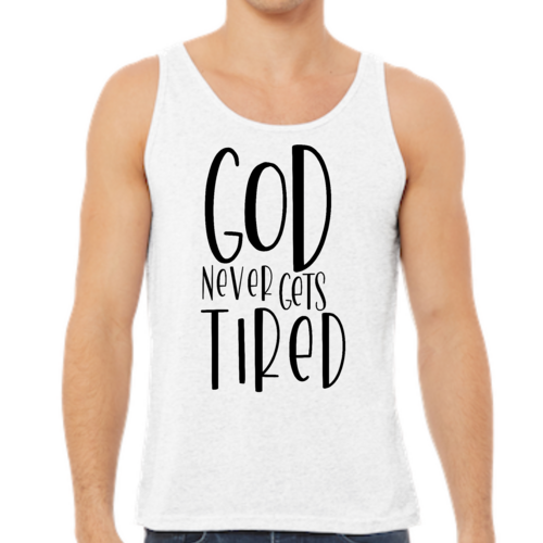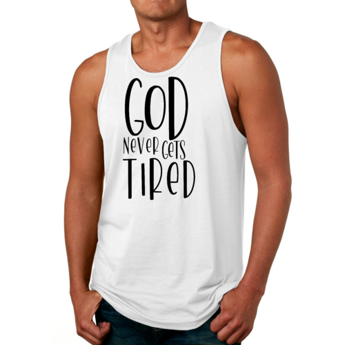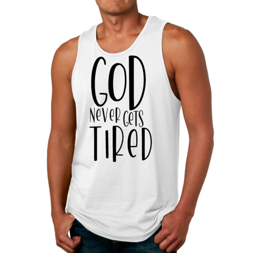 Introducing the Men's Fitness Tank Top Graphic T-shirt Say It Soul - God Never Gets Tired, a perfect blend of style and comfort for your workout sessions. This tank top is designed for those who appreciate both functionality and motivation in their fitness apparel. The striking black illustration serves as a reminder that perseverance is key, making it an ideal choice for anyone looking to stay inspired while breaking a sweat.