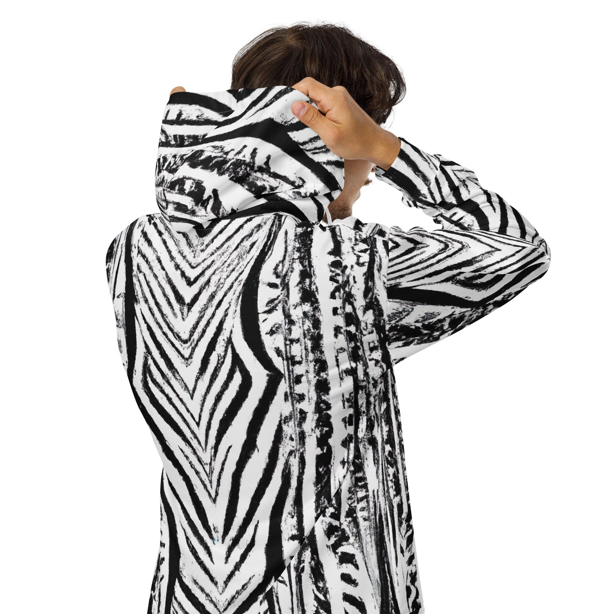 This hoodie features a striking black and white native print that adds a unique touch to your outfit. The unisex relaxed fit with drop shoulders allows for easy movement and a laid-back style. The double-lined hood provides additional warmth and protection against the elements, while the self-fabric collar and cuffs enhance the overall aesthetic.