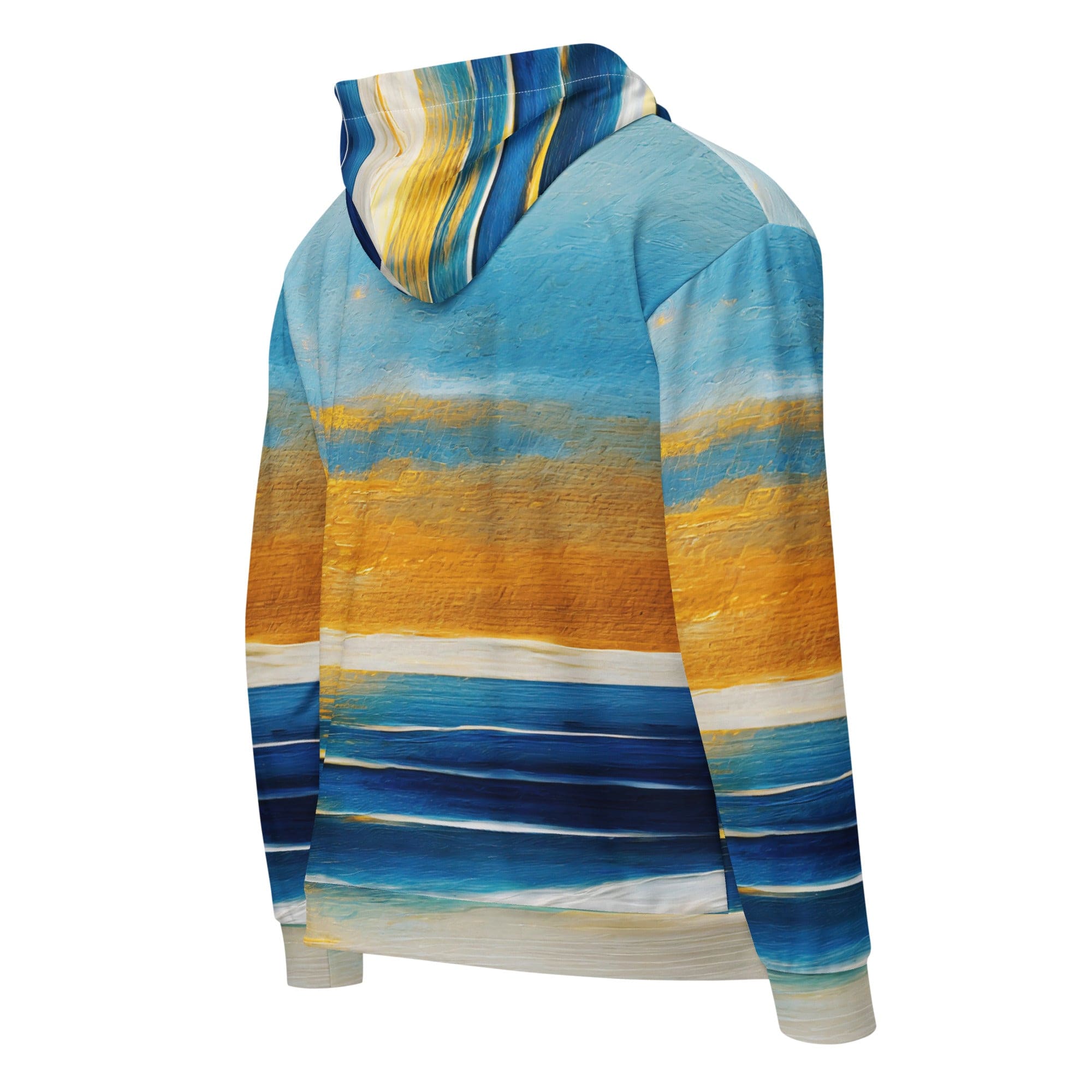 In summary, the Men's Full Zip Graphic Hoodie in Blue Ocean Golden Sunset Print is more than just a hoodie; it's a statement piece that combines comfort, style, and sustainability. Whether you're looking for something to wear during your daily activities or a cozy layer for your outdoor adventures, this hoodie is the perfect choice.
