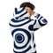 The navy blue and white circular pattern gives this hoodie a unique and trendy look that stands out. The moon patch on the inside of the back adds a subtle yet stylish detail that enhances the overall aesthetic. Whether you're pairing it with jeans, joggers, or shorts, this hoodie is versatile enough to match any outfit.