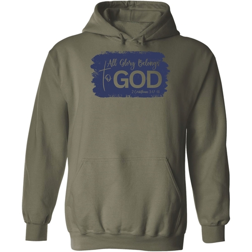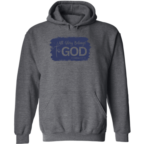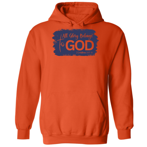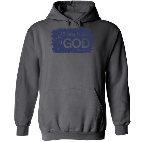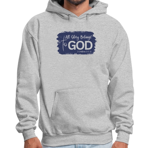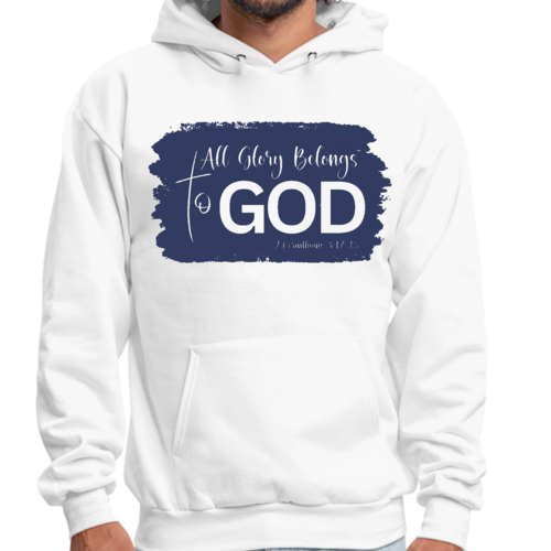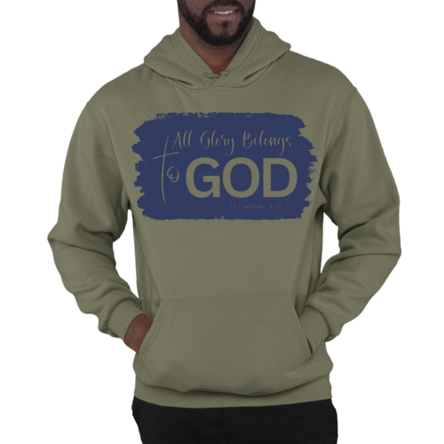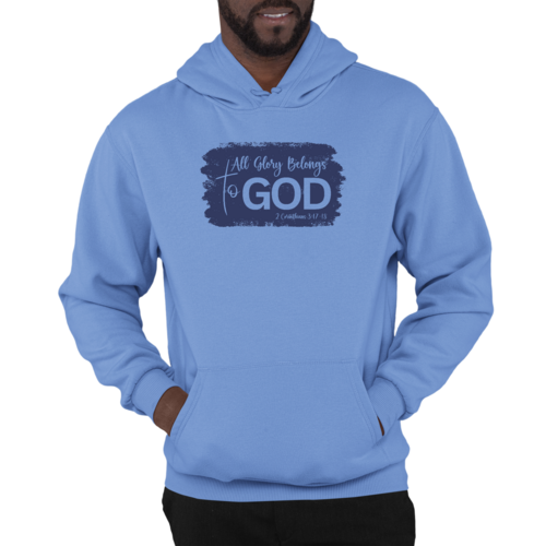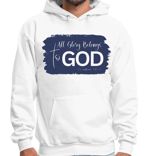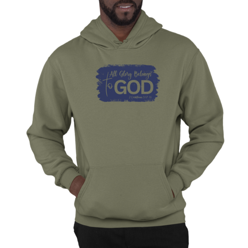 Men's navy graphic hoodie featuring 'All Glory Belongs to God' Christian illustration, showcasing a comfortable and stylish design.