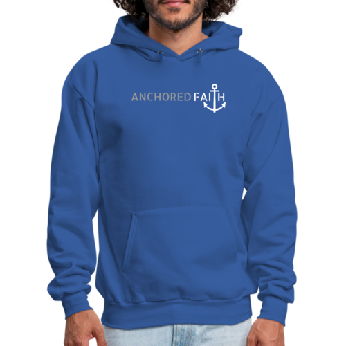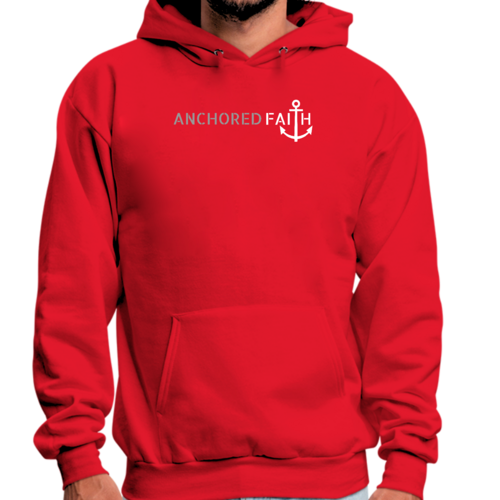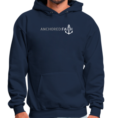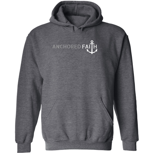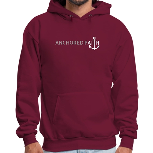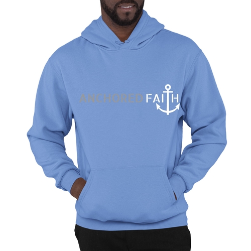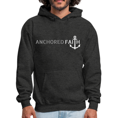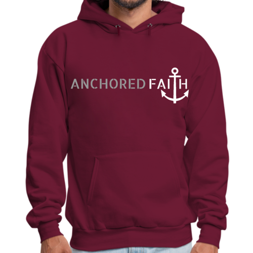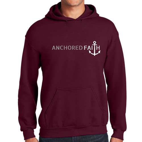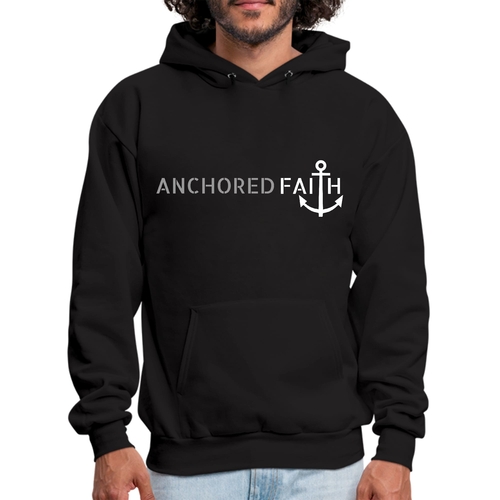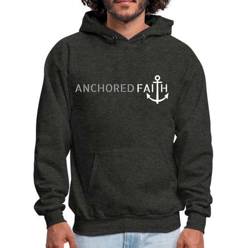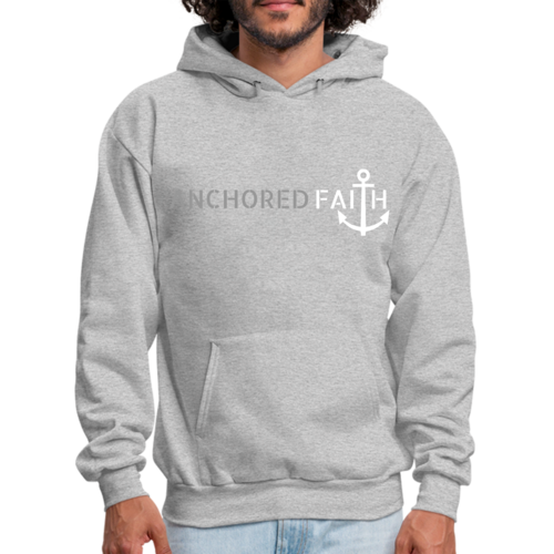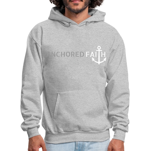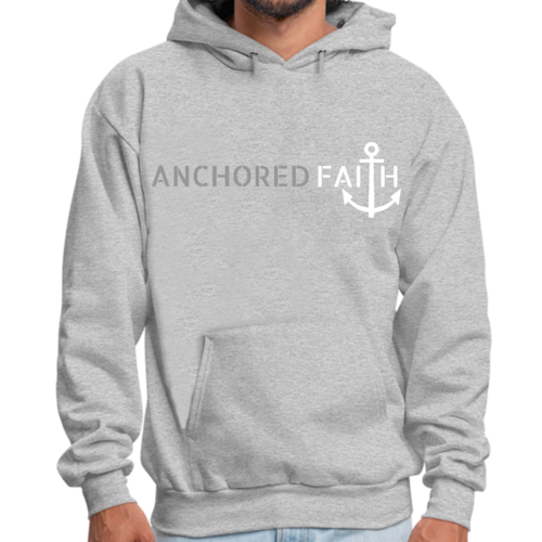 Mens Graphic Hoodie in grey and white featuring the phrase 'Anchored Faith' with a drawstring neckline and long sleeves.