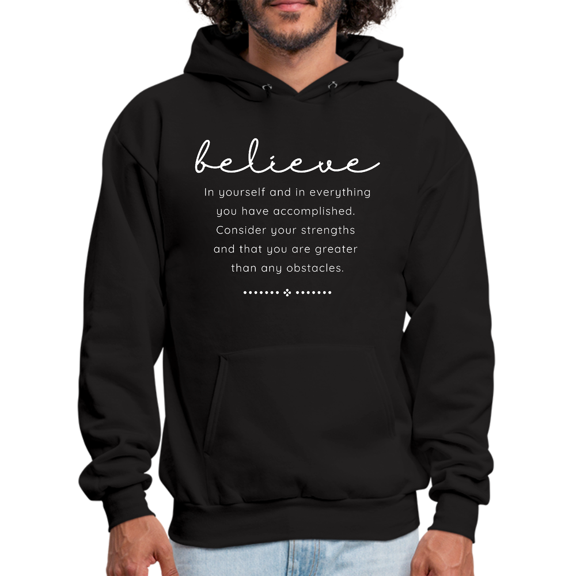 Mens Graphic Hoodie featuring 'Believe in Yourself' motivational design, soft fabric, and drawstring neckline.