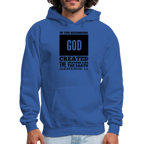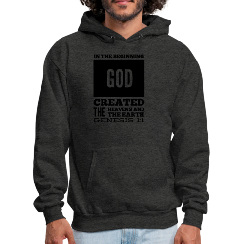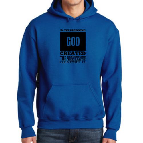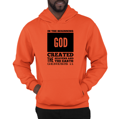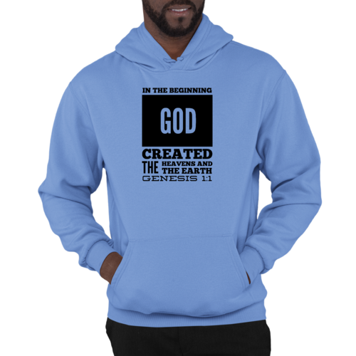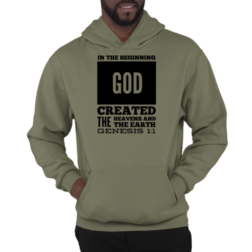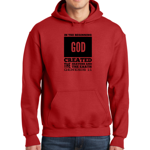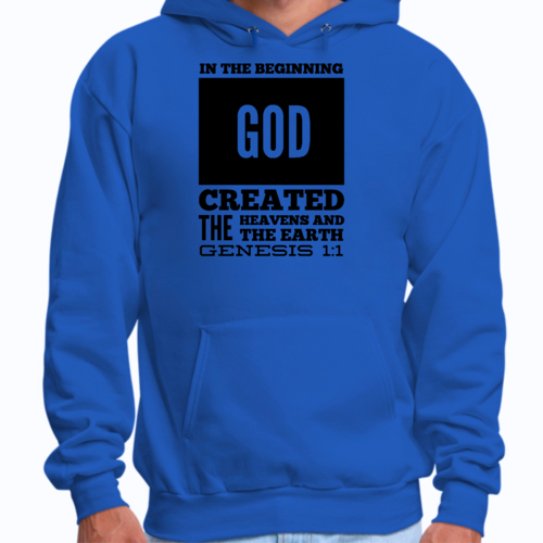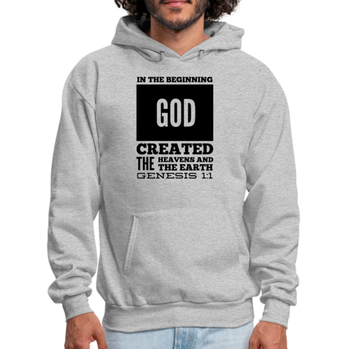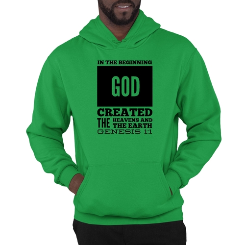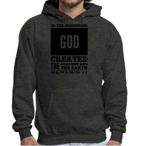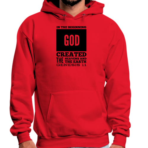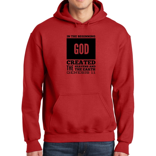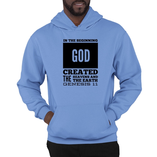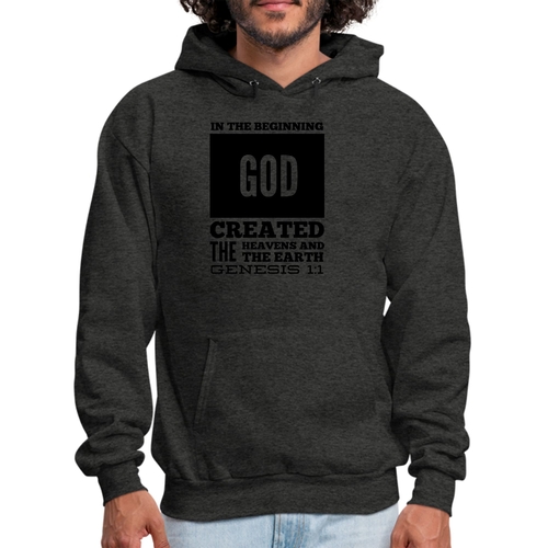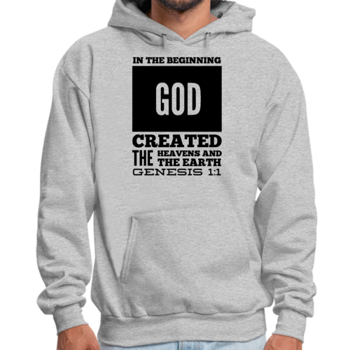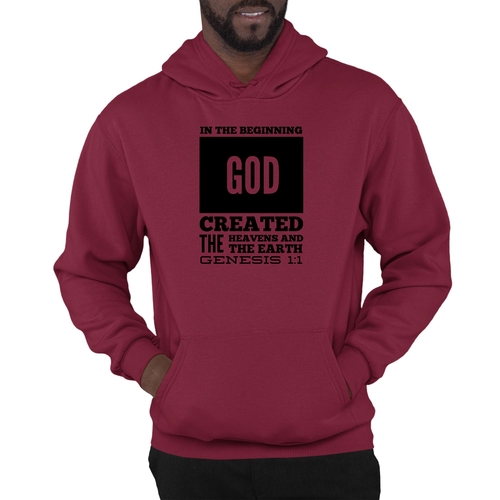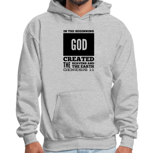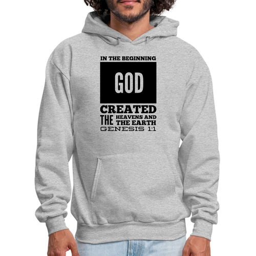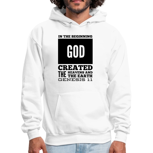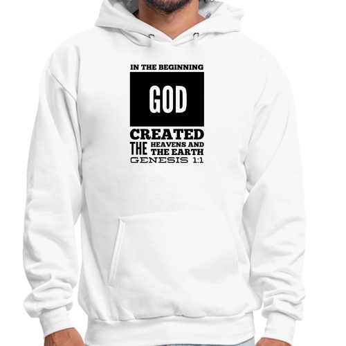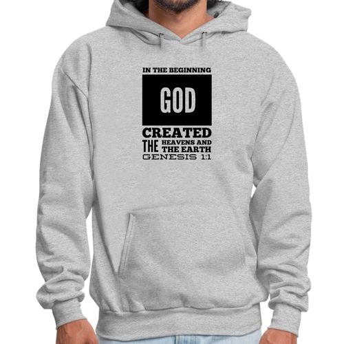 Introducing the Men's Graphic Hoodie in the Beginning Print, a stylish and comfortable addition to your wardrobe. This hoodie features a striking black illustration that reads, 'In The Beginning God Created The Heavens And The Earth.' Perfect for casual outings or lounging at home, this hoodie combines comfort and style effortlessly.
