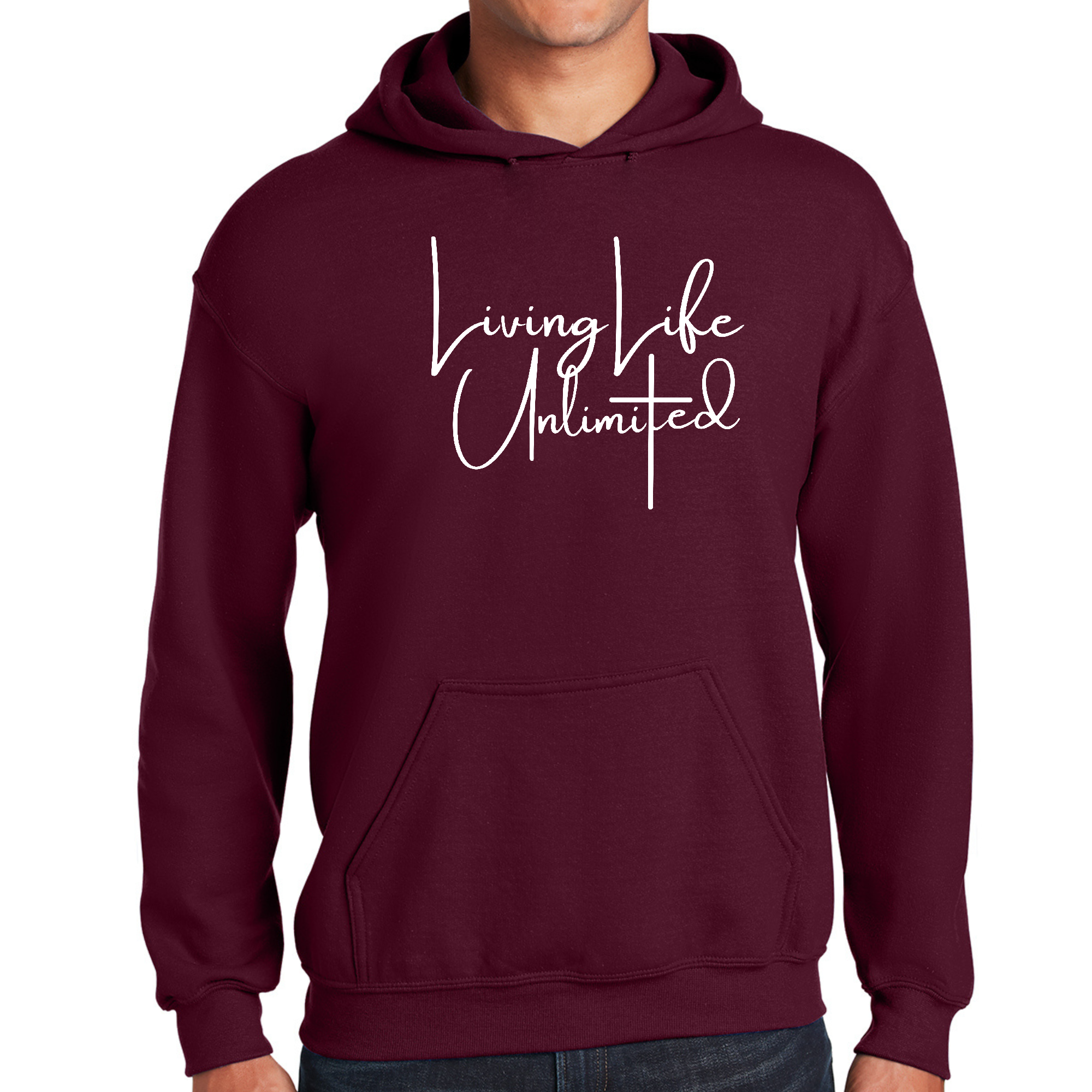 Mens Graphic Hoodie Living Life Unlimited featuring a motivational design, drawstring neckline, and long sleeves in a comfortable fit.