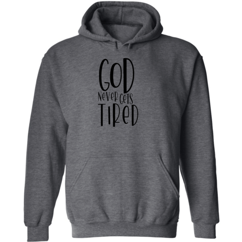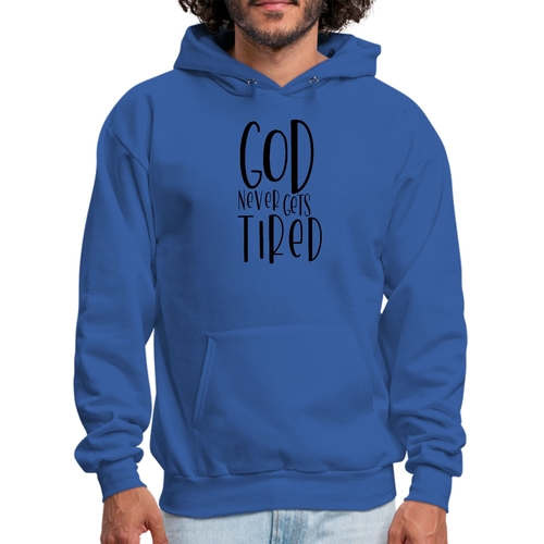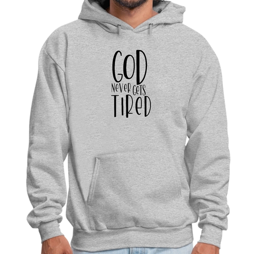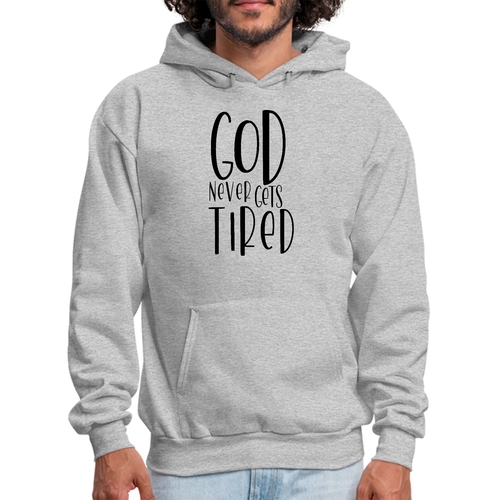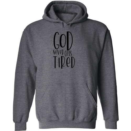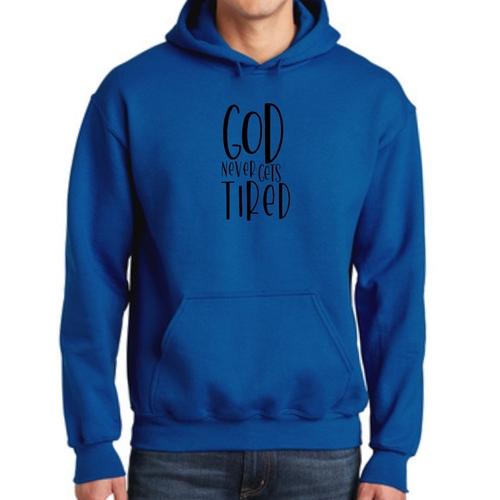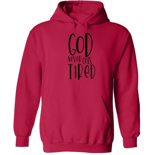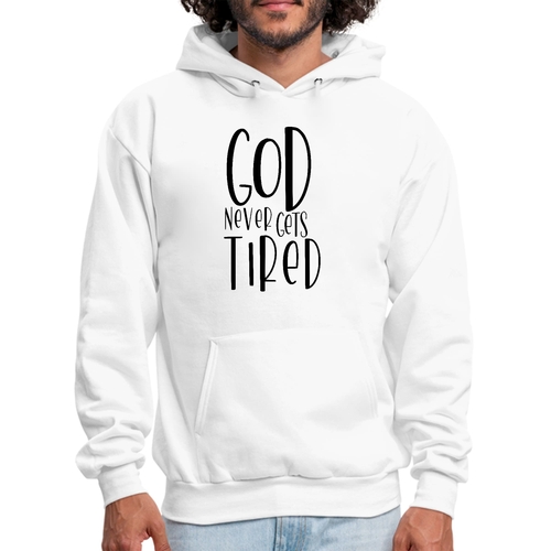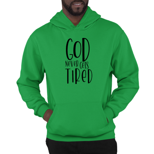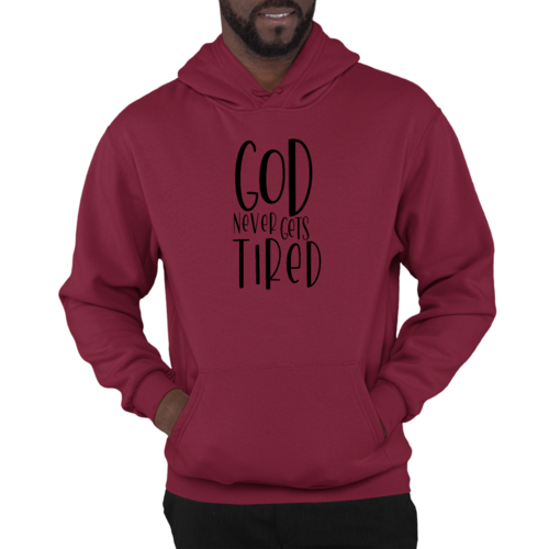 The graphic on the hoodie features the uplifting phrase 'God Never Gets Tired', serving as a daily reminder of faith and perseverance. This inspirational saying is perfect for anyone looking to express their beliefs through their clothing. It’s not just a hoodie; it’s a statement piece that encourages positivity and hope.