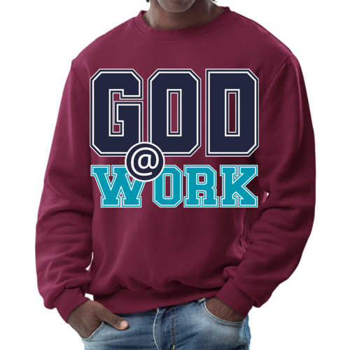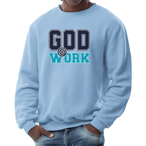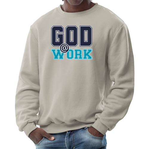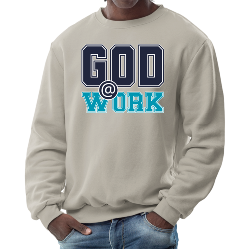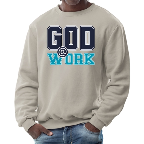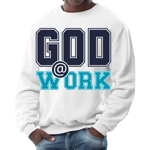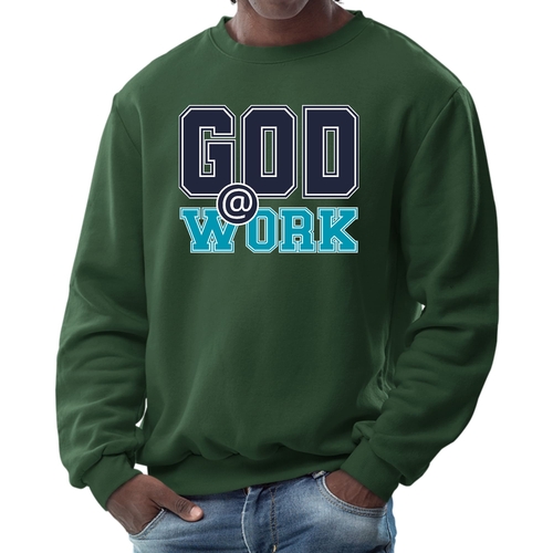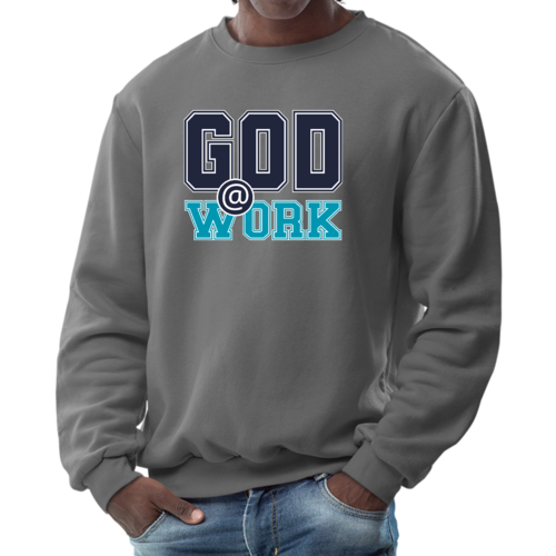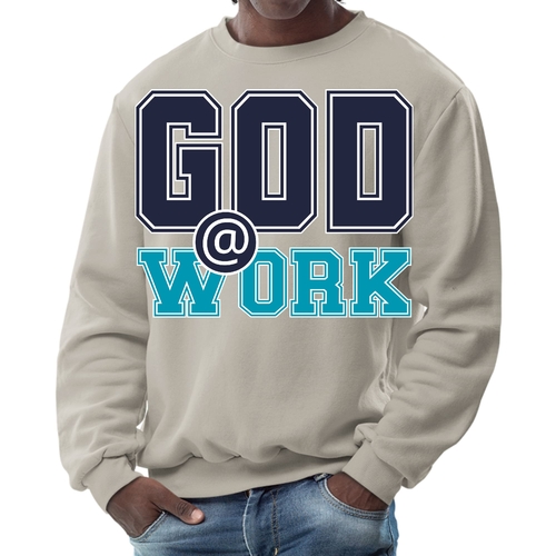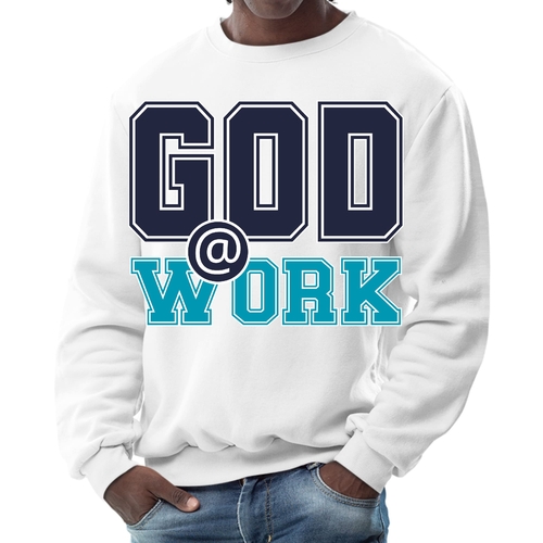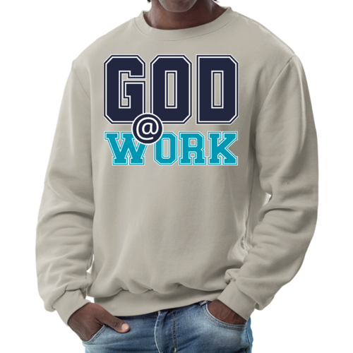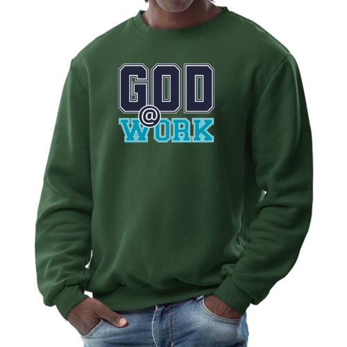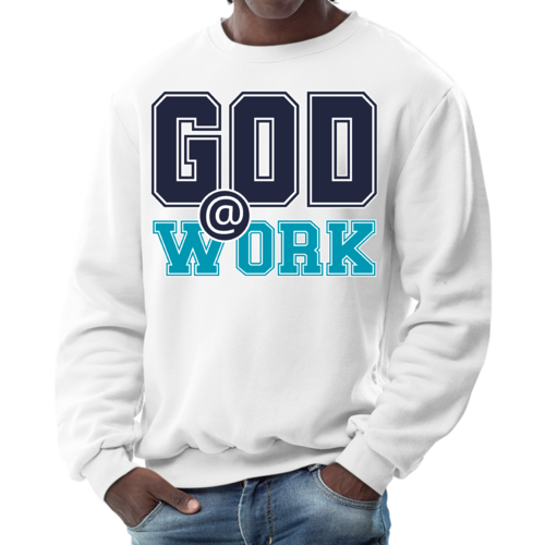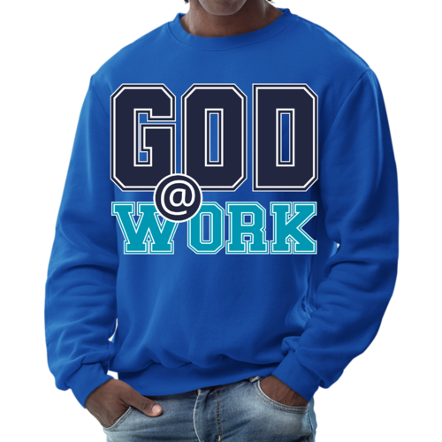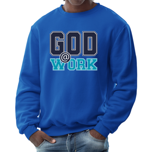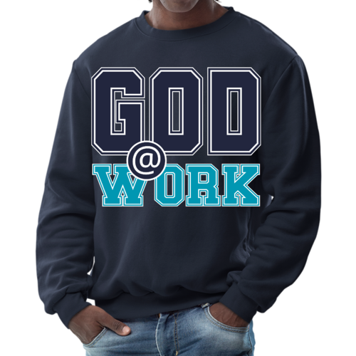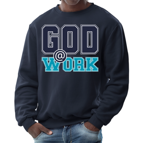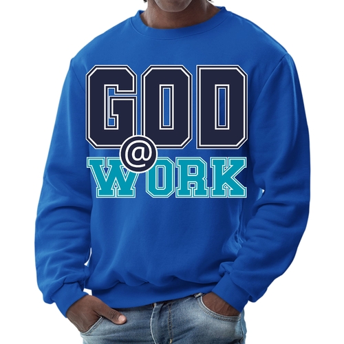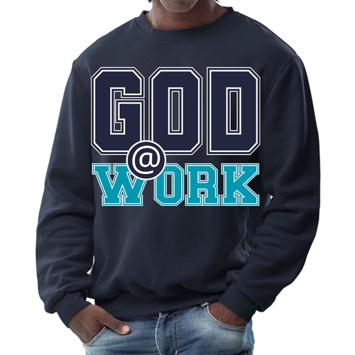 Introducing our Men's Graphic Sweatshirt, featuring the inspiring 'God @ Work' print in a striking navy blue and blue-green color scheme. This sweatshirt is designed for those who appreciate both comfort and style, making it an ideal choice for casual outings or relaxing at home. Crafted from a high-quality blend of 50% cotton and 50% polyester, it offers a soft and cozy feel against the skin, ensuring you stay warm during colder days.