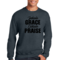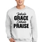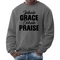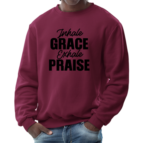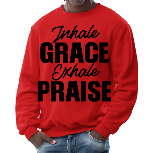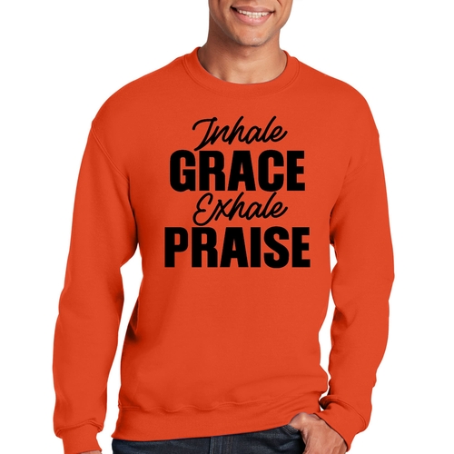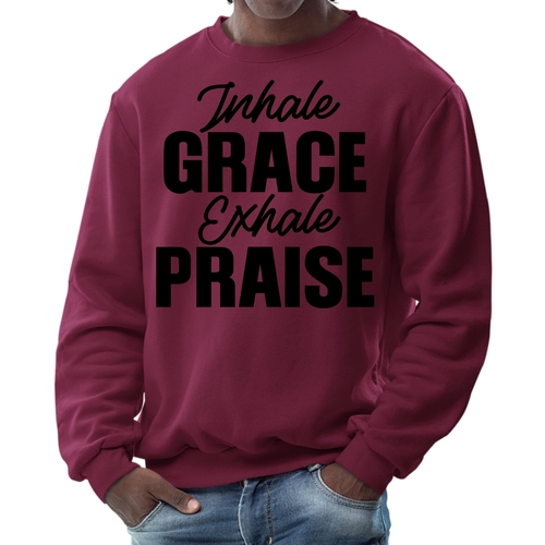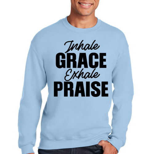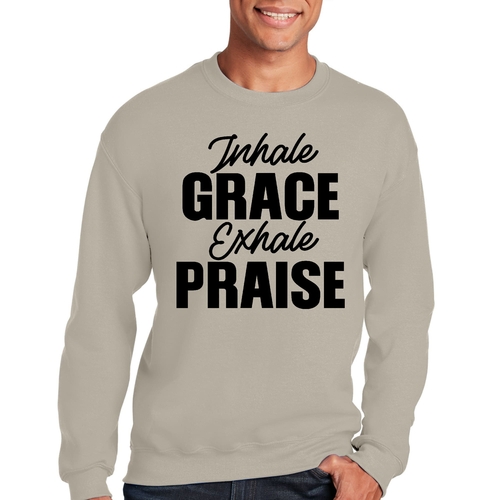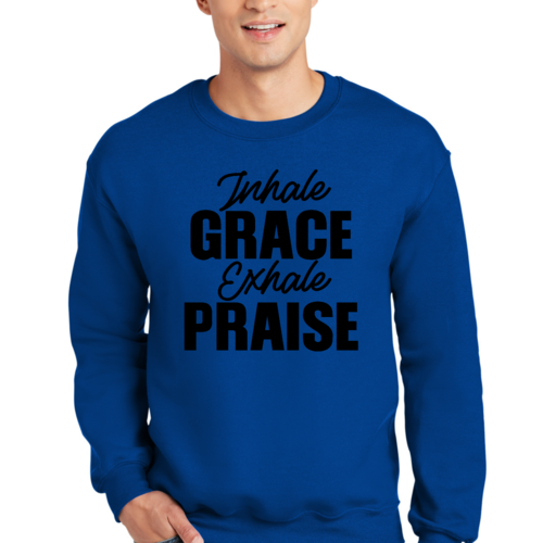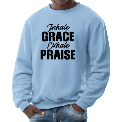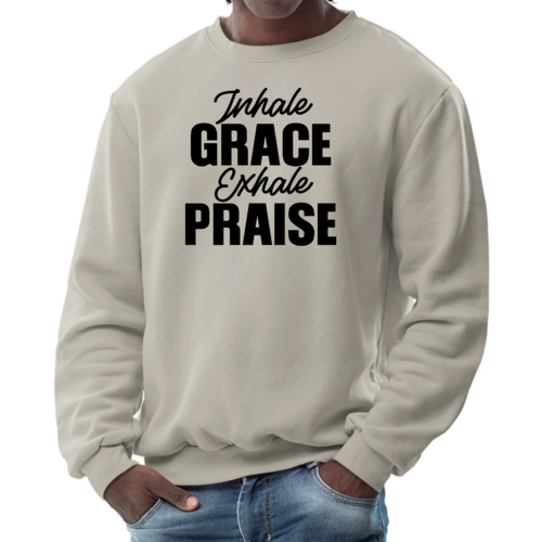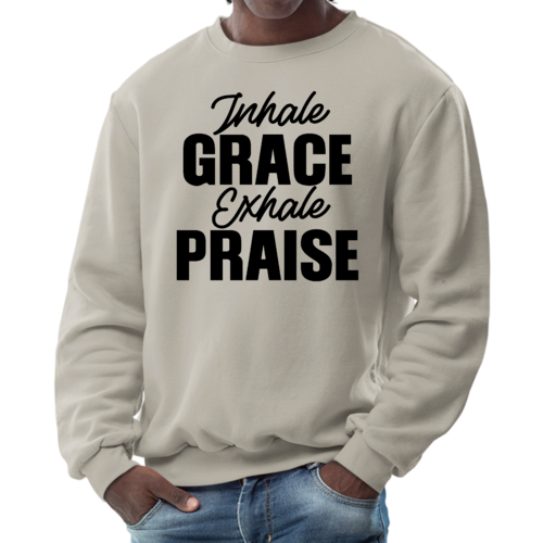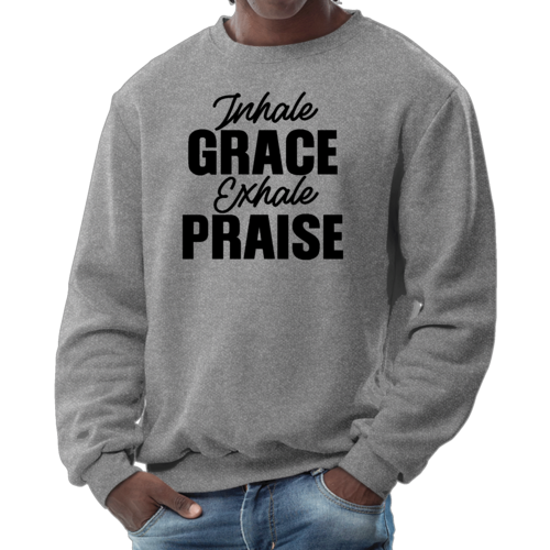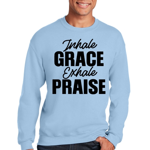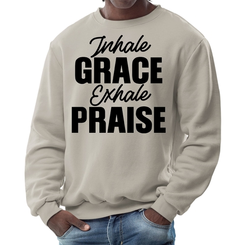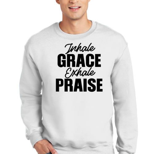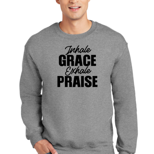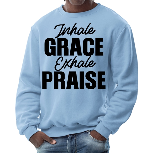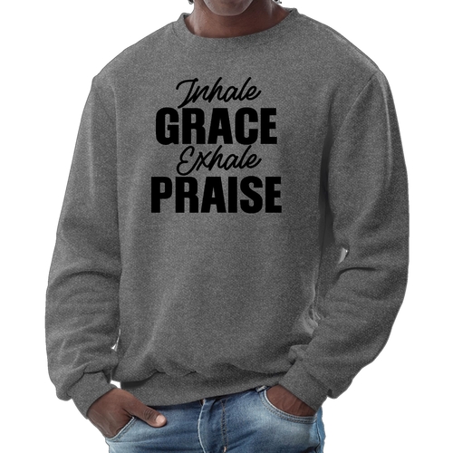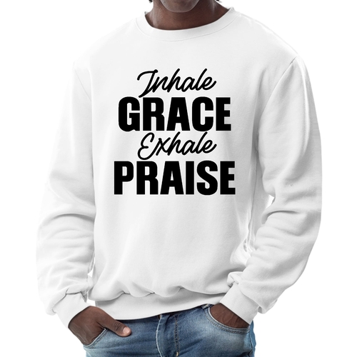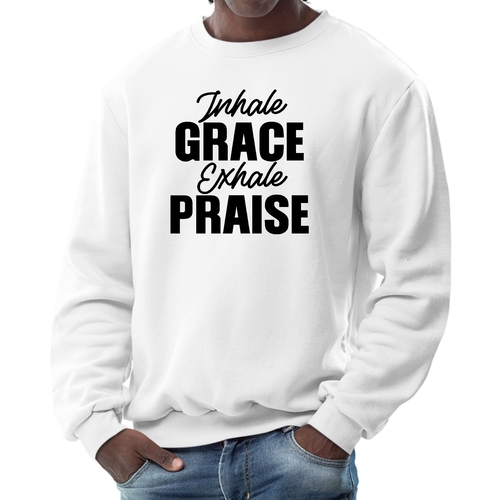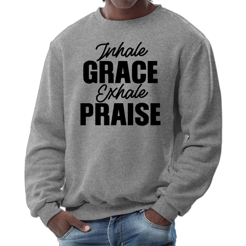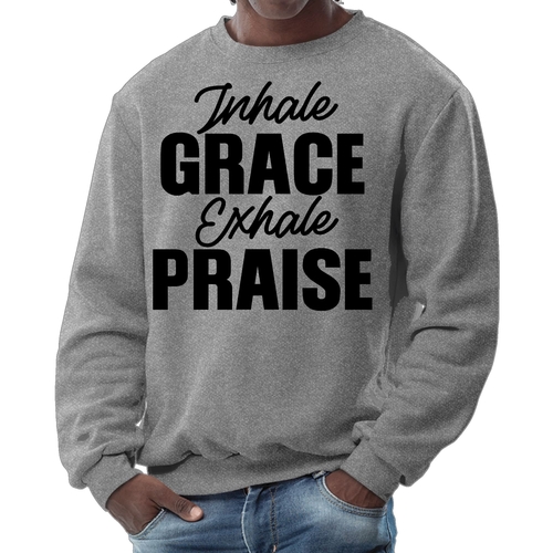 Introducing the Men's Graphic Sweatshirt, a perfect blend of style and comfort. This sweatshirt features the inspiring phrase 'Inhale Grace Exhale Praise' illustrated in a striking black design. Crafted for both men and women, this unisex sweatshirt is designed to be your go-to choice for casual outings, lounging at home, or even light workouts. Made from a high-quality 50/50 Poly/Cotton blend, it offers the ideal combination of softness and durability, ensuring that it withstands the test of time while keeping you comfortable.