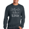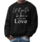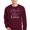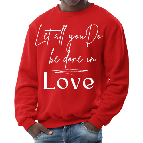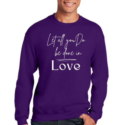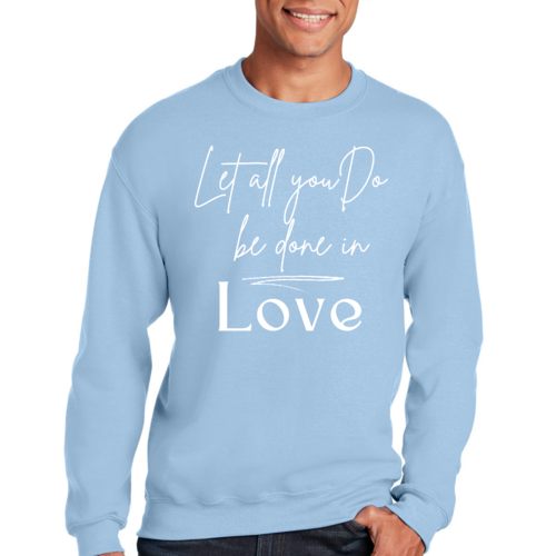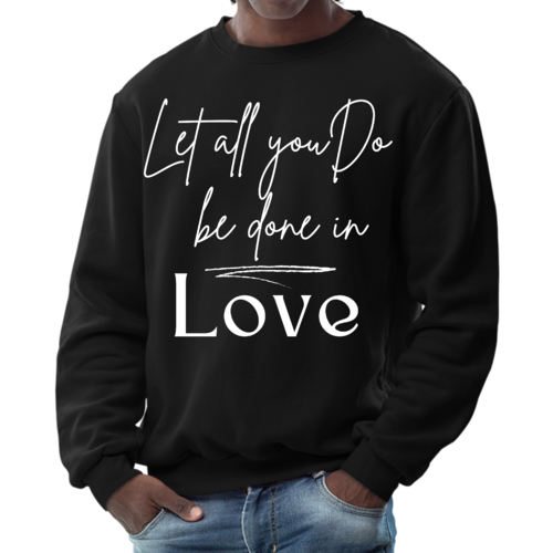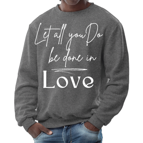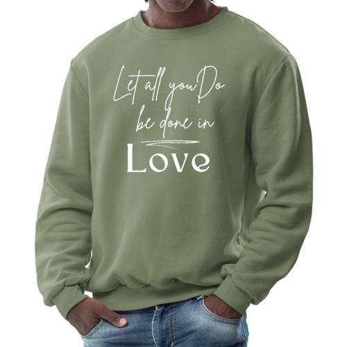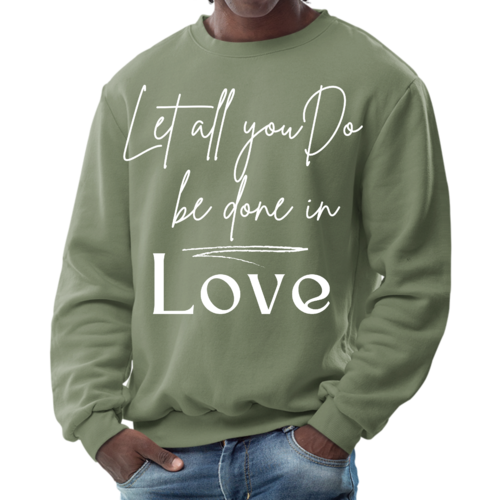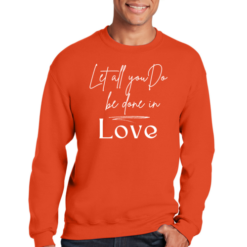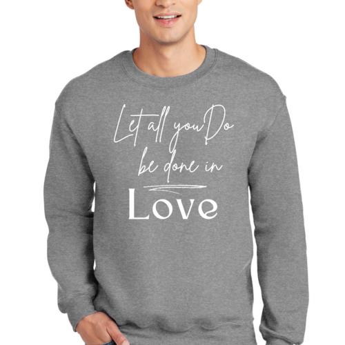 The 'Let All You Do Be Done in Love' print adds a unique touch to your wardrobe. This sweatshirt can be paired with jeans, shorts, or joggers for a casual look that expresses your values. It's perfect for everyday wear, whether you're running errands, attending a casual gathering, or simply relaxing at home.